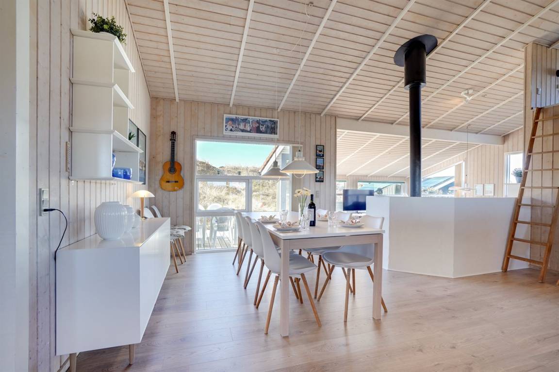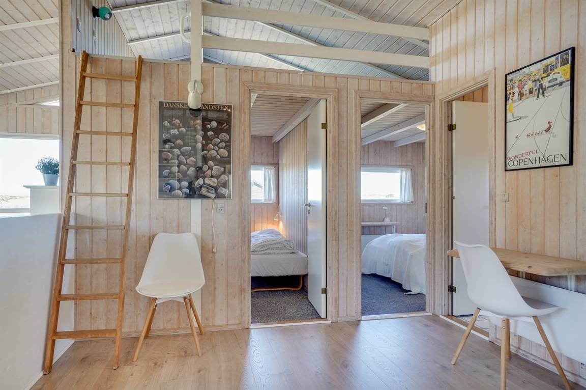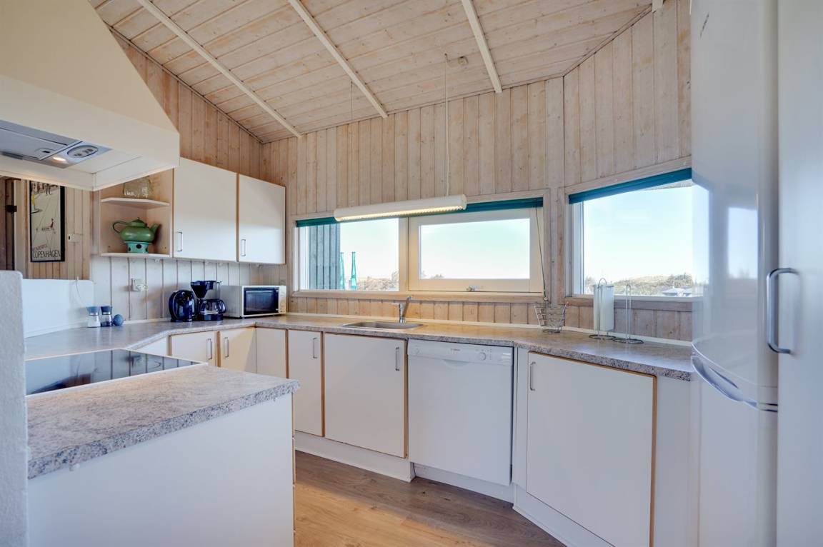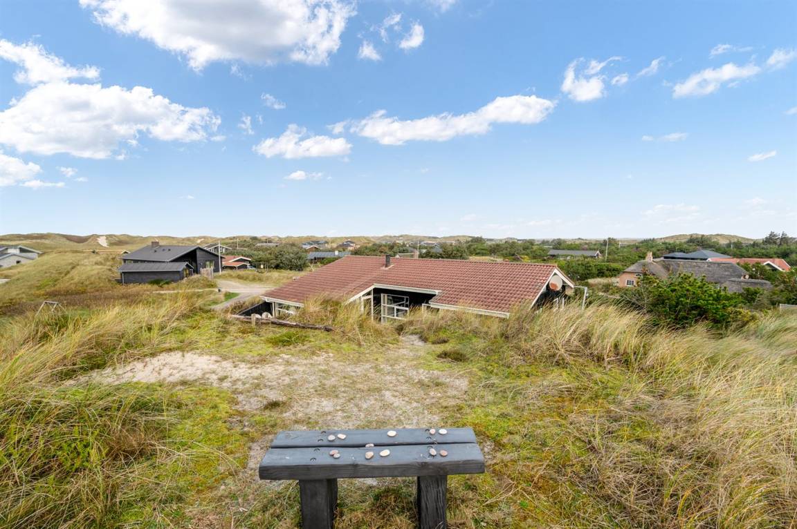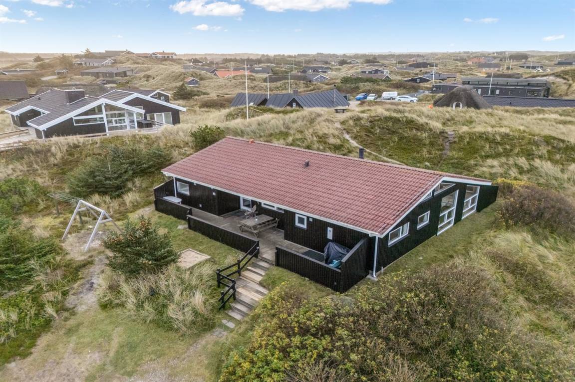 Schönes Ferienhaus aus Holz, 1993, auf einem hügeligen Dünengrundstück gelegen, nur 250 m vom Strand entfernt. Meeresblick vom höchsten Punkt des Grundstücks. Zum Haus gehören 2 schöne Terrasse mit gutem Windschutz und Gartenmöbeln. Teils Teppichböden und teils Holzböden. Das Haus ist besonders gut eingerichtet, mit u.a. 2 Badezimmern. Im großen Badezimmer gibt es 2-Pers. Whirlpool, Duschnische und Fußbodenheizung. Von hier direkter Zutritt zur Sauna. Extra Badezimmer mit Duschnische und Fußbodenheizung. Die Küchenabteilung ist mit Geschirrspüler, Tiefkühlgerät, Mikrowelle, Warmluftofen und Herd mit Ceran-Feld ausgestattet. Im gemütlichen Wohnzimmer finden Sie Kaminofen, Stereoanlage mit CD-Spieler sowie 55" TV mit digitalem Satellitenanschluss, DVD-Spieler und vintage Spielkonsole Super Nintendo. An weiterer Ausstattung können kostenlose, kabellose Internetverbindung (eigener Computer muss mitgebracht werden), Radio, Waschmaschine, Wäschetrockner, 2 Kinderbetten und Kinderhochstuhl erwähnt werden. 4 schöne Schlafzimmer mit gutem Schrankplatz. Ferner hat das Haus 2 offene Obergeschosse, das eine mit 2 Schlafplätzen und Meeresblick sowie 32" TV mit Chromecast und vintage Spielkonsole Nintendo - hier können es sich die etwas größeren Kinder so richtig gemütlich machen (Schaumgummimatratzen - nicht aus dem Grundriß ersichtlich). Sandkasten und Schaukel. Das Haus liegt in einem ruhigen und naturschönen Gebiet mit guten Aktivitätsmöglichkeiten - nur wenige min. Fahrt vom Badeort Søndervig entfernt.