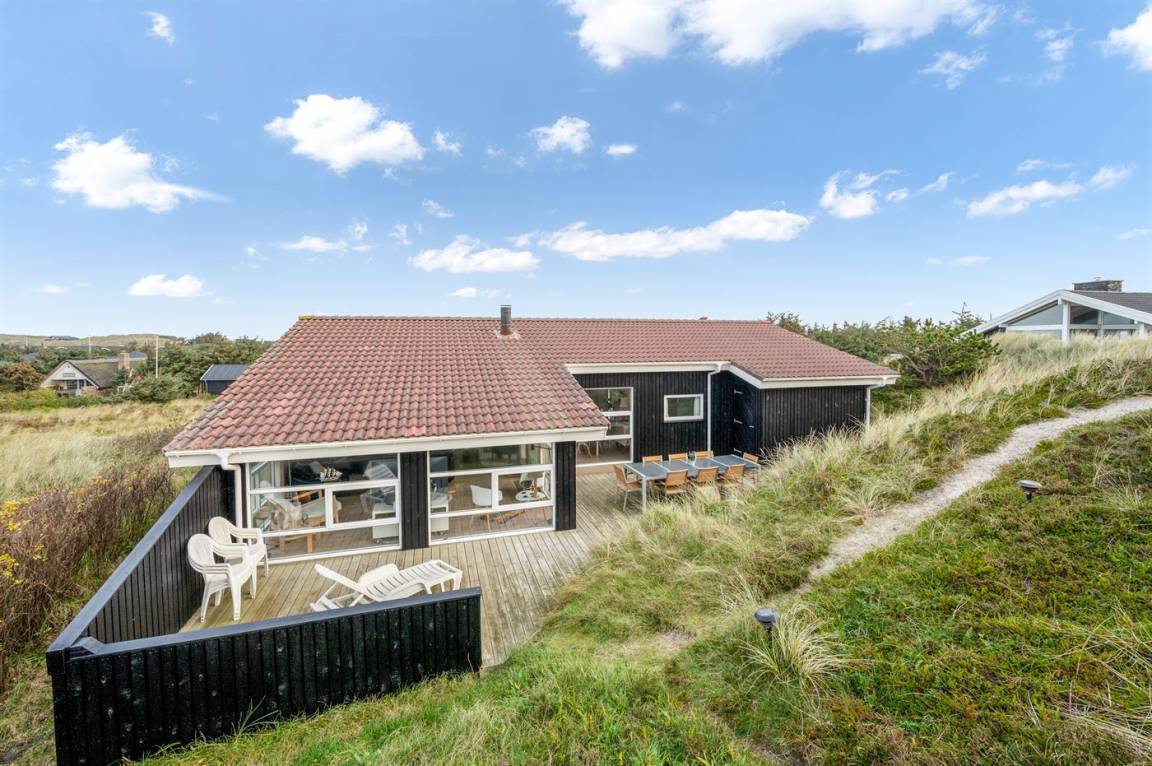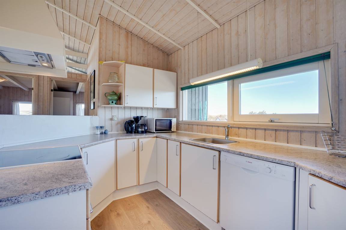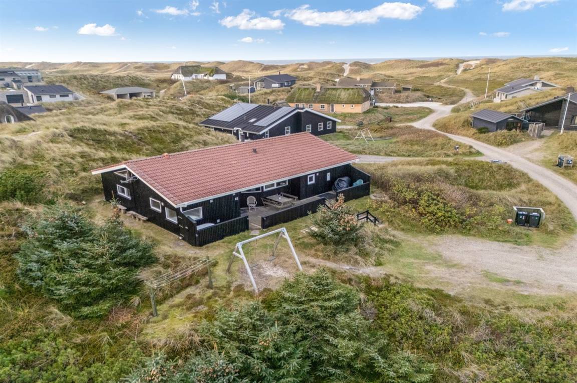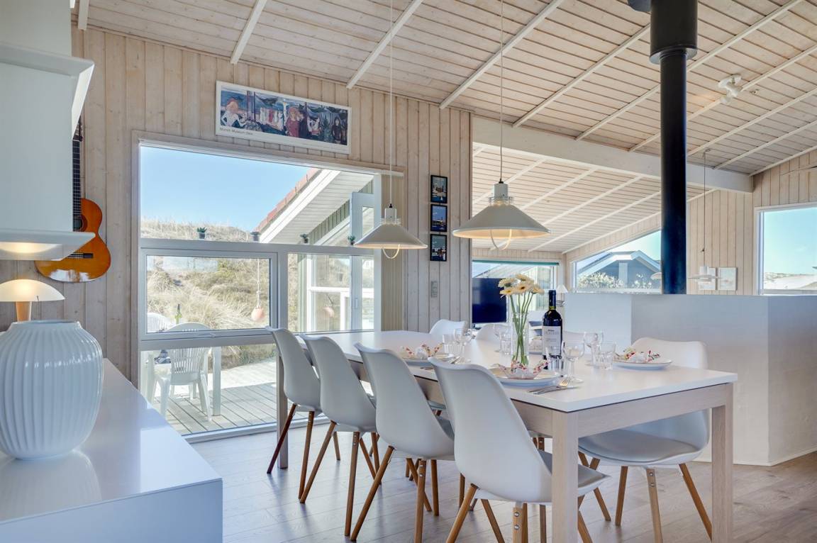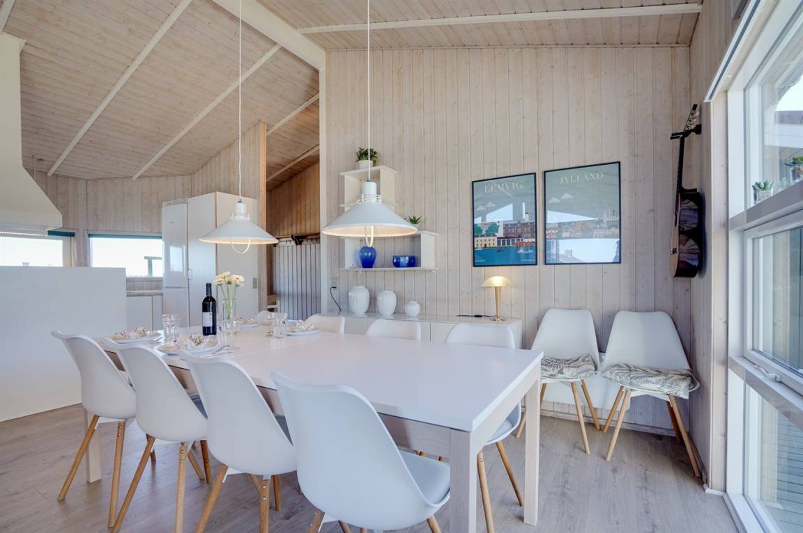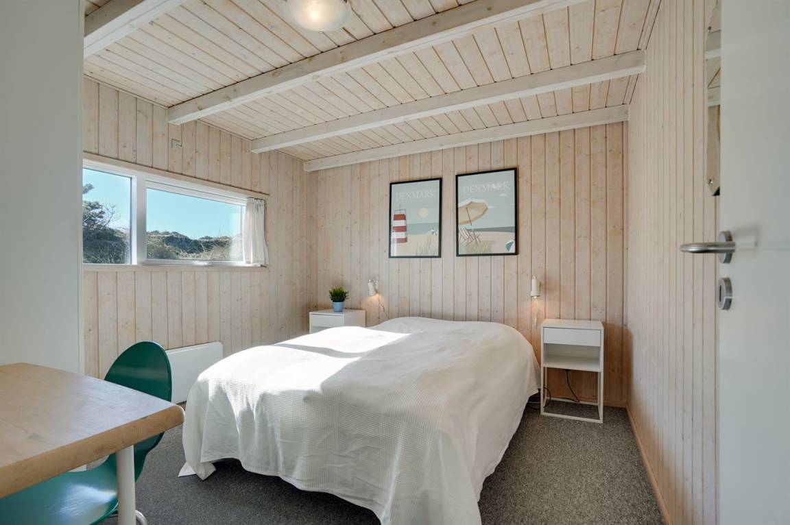 Schönes Ferienhaus aus Holz, 1993, auf einem hügeligen Dünengrundstück gelegen, nur 250 m vom Strand entfernt. Meeresblick vom höchsten Punkt des Grundstücks. Zum Haus gehören 2 schöne Terrasse mit gutem Windschutz und Gartenmöbeln. Teils Teppichböden und teils Holzböden. Das Haus ist besonders gut eingerichtet, mit u.a. 2 Badezimmern. Im großen Badezimmer gibt es 2-Pers. Whirlpool, Duschnische und Fußbodenheizung. Von hier direkter Zutritt zur Sauna. Extra Badezimmer mit Duschnische und Fußbodenheizung. Die Küchenabteilung ist mit Geschirrspüler, Tiefkühlgerät, Mikrowelle, Warmluftofen und Herd mit Ceran-Feld ausgestattet. Im gemütlichen Wohnzimmer finden Sie Kaminofen, Stereoanlage mit CD-Spieler sowie 55" TV mit digitalem Satellitenanschluss, DVD-Spieler und vintage Spielkonsole Super Nintendo. An weiterer Ausstattung können kostenlose, kabellose Internetverbindung (eigener Computer muss mitgebracht werden), Radio, Waschmaschine, Wäschetrockner, 2 Kinderbetten und Kinderhochstuhl erwähnt werden. 4 schöne Schlafzimmer mit gutem Schrankplatz. Ferner hat das Haus 2 offene Obergeschosse, das eine mit 2 Schlafplätzen und Meeresblick sowie 32" TV mit Chromecast und vintage Spielkonsole Nintendo - hier können es sich die etwas größeren Kinder so richtig gemütlich machen (Schaumgummimatratzen - nicht aus dem Grundriß ersichtlich). Sandkasten und Schaukel. Das Haus liegt in einem ruhigen und naturschönen Gebiet mit guten Aktivitätsmöglichkeiten - nur wenige min. Fahrt vom Badeort Søndervig entfernt.