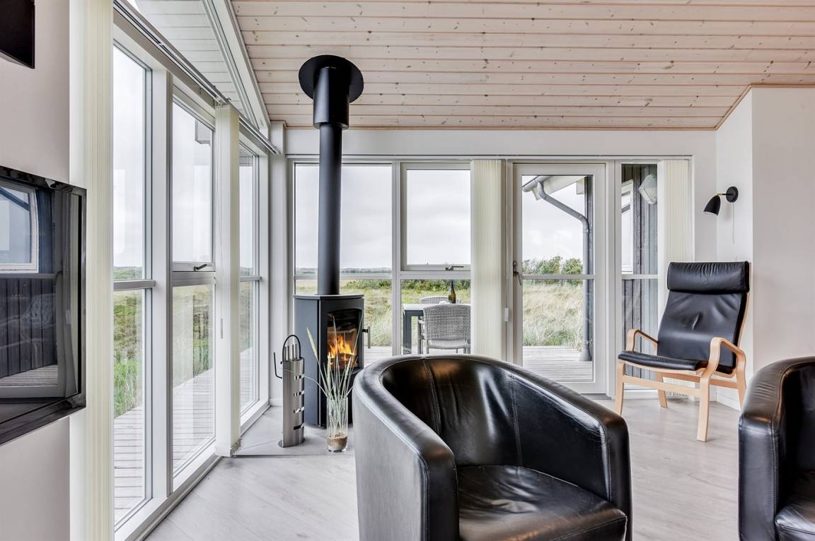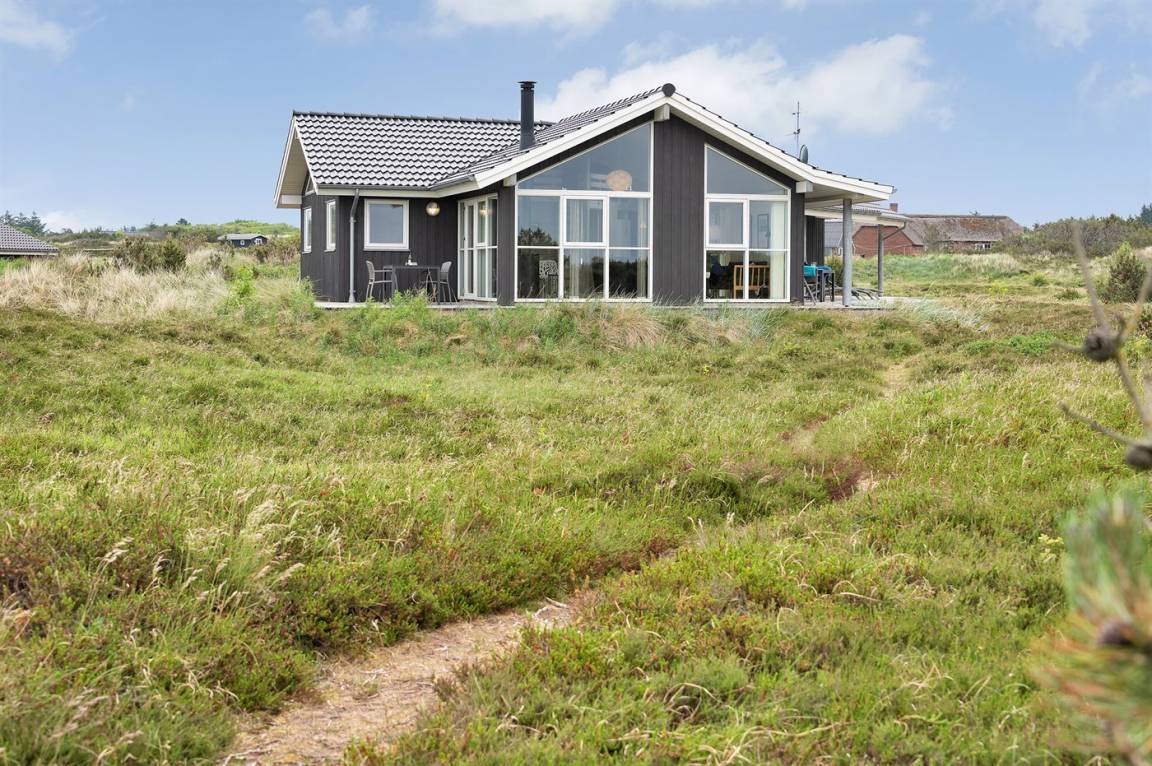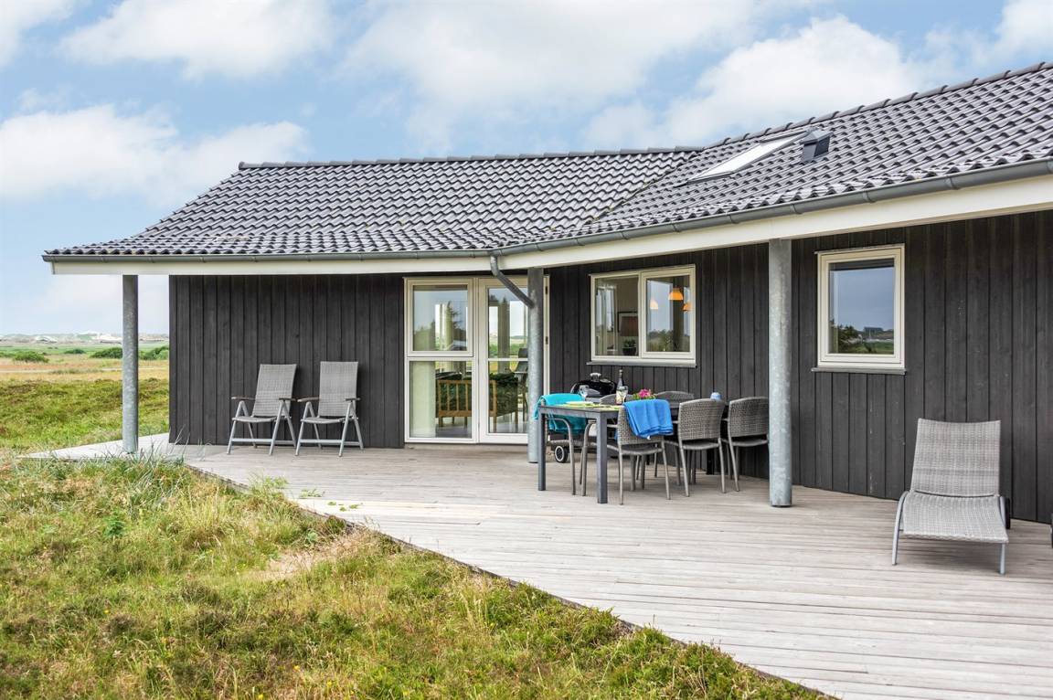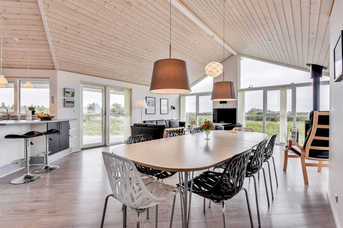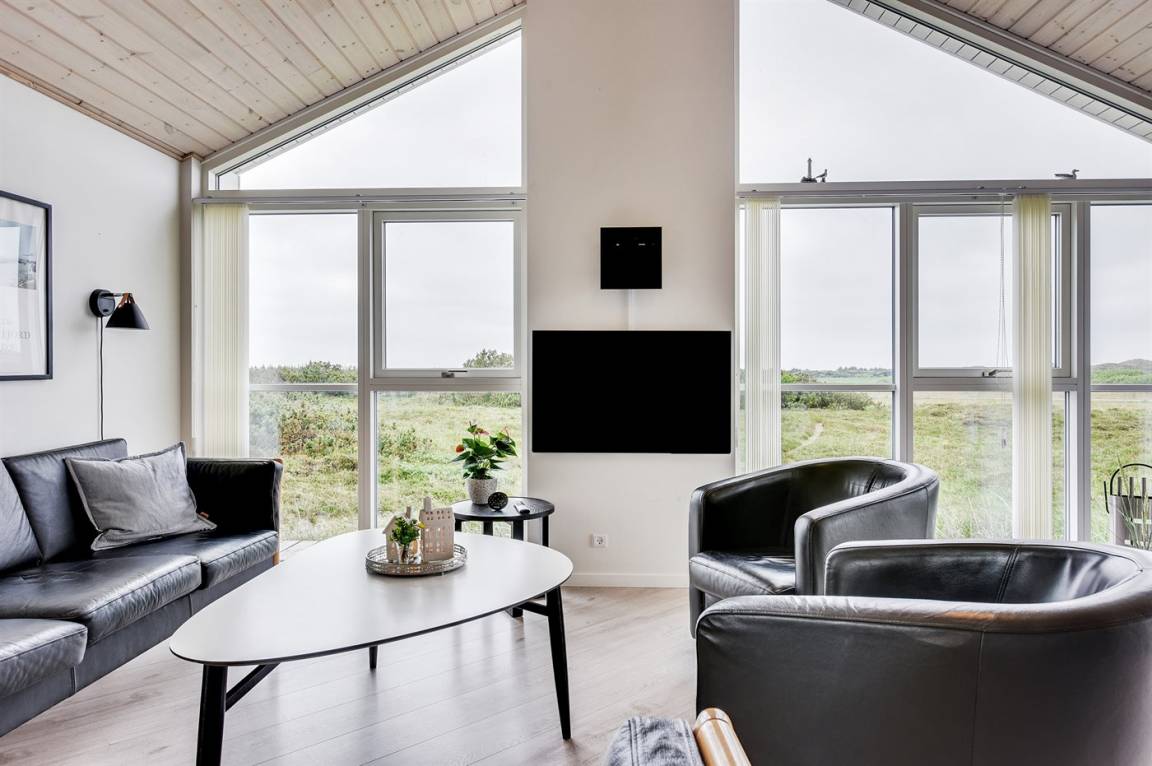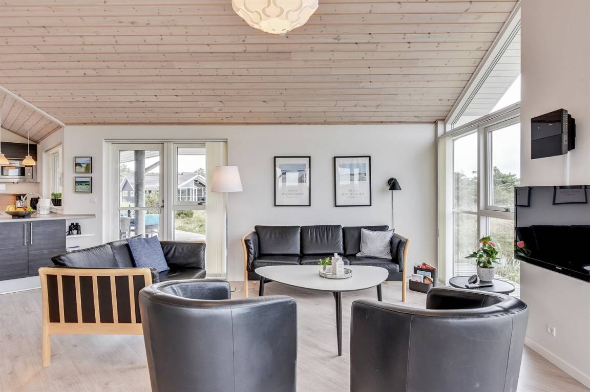 Dieses herrliche Luxusferienhaus mit unglaublich gutem Lichteinfall liegt auf einem Naturgrundstück mit schöner Aussicht über das Gebiet und der Dünenlandschaft. Das Haus ist gut gedämmt und 2012 aus Qualitätsmaterialien gebaut. Es gibt ein schönes, zum Teil überdachtes Terrassenareal mit Gartenmöbeln. 2 herrliche Badezimmer, beide mit Duschnische und beheizbarem Klinkerboden. Das eine enthält ferner einen 2-Pers.-Whirlpool und Sauna. Beheizbare Holzböden in den übrigen Räumen. Die schicke und gut ausgestattete Küche enthält u. a. Geschirrspüler, Mikrowelle, Tiefkühlgerät (100 l), Umluftofen und Herd mit Ceran-Feld. Das schöne Esszimmer ist mit dem geschmackvoll eingerichteten Wohnzimmer, von dem Sie die Aussicht auf die schöne Natur mit der Dünenlandschaft im Hintergrund genießen können, kombiniert. Im Wohnzimmer finden Sie Kaminofen, TV mit digitalem Satellitenanschluss, DVD-Spieler und Stereoanlage mit CD-Spieler. Die Schlafplätze verteilen sich auf 4 gute Schlafzimmer, alle mit Doppelbett. Von dem einen Zimmer haben Sie Ausgang zur Terrasse. Ein großer Aktivitätsraum mit Billard, Tischfußball, zusätzliches TV und einer kleinen Bar steht ebenfalls zu Ihrer Verfügung - der perfekte Platz zum gemütlichen Beisammensein. An weiterer Ausstattung können kostenlose, kabellose Internetverbindung (Computer ist mitzubringen), Waschmaschine und Wäschetrockner erwähnt werden. Für die jüngsten Feriengäste stehen Kinderbett und Kinderhochstuhl sowie Sandkasten und Schaukel zur Verfügung. Hinter dem Haus gibt es einen Außenfischreinigungsplatz. Es ist ein Ladestecker für Elektroautos installiert. Ein herrliches und modernes Ferienhaus mit einem guten Innenklima - sowohl für 1 als auch 2 Familien geeignet. Das Haus liegt in einem Gebiet mit guten Aktivitätsmöglichkeiten wie z. B. 27-Loch Golfplatz und Put & Take Angelsee. Ein Pfad führt vom Grundstück direkt an das Meer. Der Badeort Söndervig liegt nur wenige Minuten Fahrt vom Haus entfernt - hier finden Sie einen großen, modernen Supermarkt, Restaurants, verschiedene Läden, Bowling- und Fitnesscenter u. a. m. Übrigens: Das Haus ist voll gedämmt und es ist eine Erdheizung installiert, die die Heizkosten reduziert.