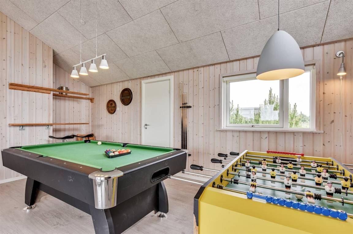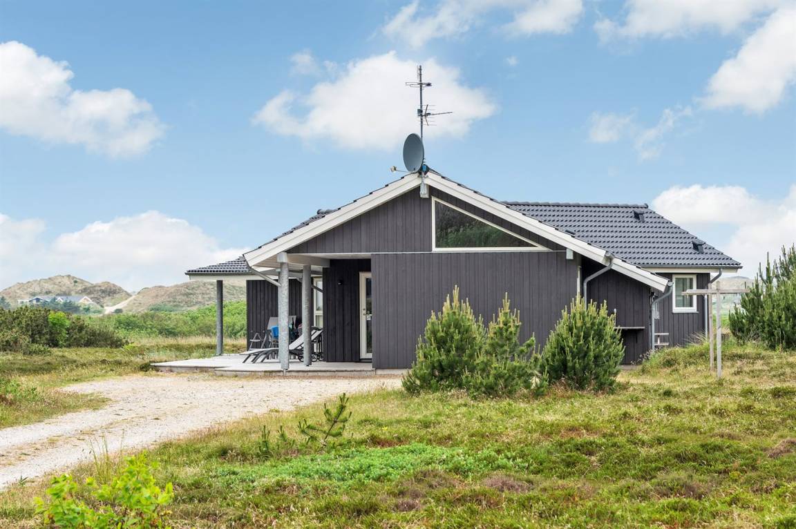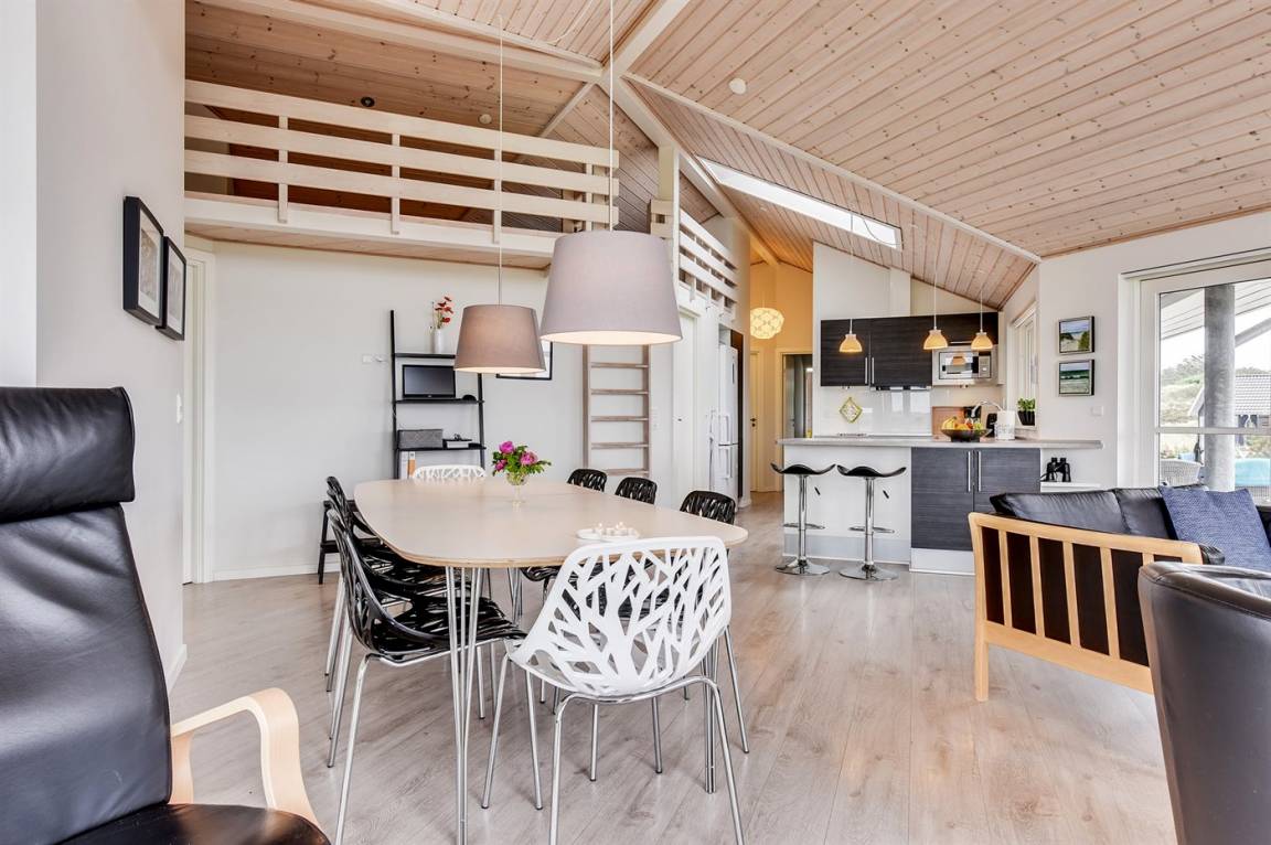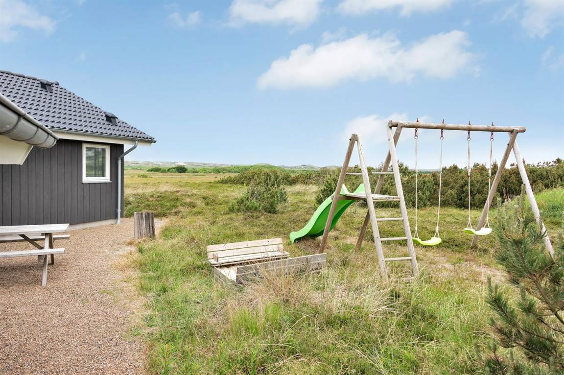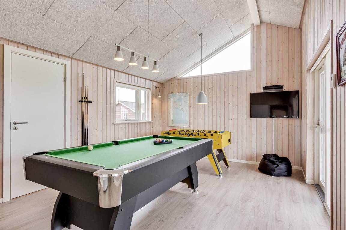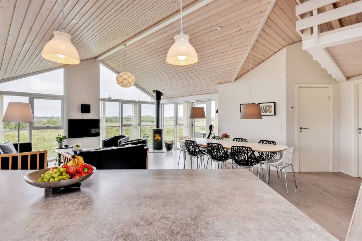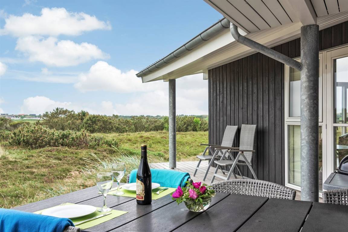 Dieses herrliche Luxusferienhaus mit unglaublich gutem Lichteinfall liegt auf einem Naturgrundstück mit schöner Aussicht über das Gebiet und der Dünenlandschaft. Das Haus ist gut gedämmt und 2012 aus Qualitätsmaterialien gebaut. Es gibt ein schönes, zum Teil überdachtes Terrassenareal mit Gartenmöbeln. 2 herrliche Badezimmer, beide mit Duschnische und beheizbarem Klinkerboden. Das eine enthält ferner einen 2-Pers.-Whirlpool und Sauna. Beheizbare Holzböden in den übrigen Räumen. Die schicke und gut ausgestattete Küche enthält u. a. Geschirrspüler, Mikrowelle, Tiefkühlgerät (100 l), Umluftofen und Herd mit Ceran-Feld. Das schöne Esszimmer ist mit dem geschmackvoll eingerichteten Wohnzimmer, von dem Sie die Aussicht auf die schöne Natur mit der Dünenlandschaft im Hintergrund genießen können, kombiniert. Im Wohnzimmer finden Sie Kaminofen, TV mit digitalem Satellitenanschluss, DVD-Spieler und Stereoanlage mit CD-Spieler. Die Schlafplätze verteilen sich auf 4 gute Schlafzimmer, alle mit Doppelbett. Von dem einen Zimmer haben Sie Ausgang zur Terrasse. Ein großer Aktivitätsraum mit Billard, Tischfußball, zusätzliches TV und einer kleinen Bar steht ebenfalls zu Ihrer Verfügung - der perfekte Platz zum gemütlichen Beisammensein. An weiterer Ausstattung können kostenlose, kabellose Internetverbindung (Computer ist mitzubringen), Waschmaschine und Wäschetrockner erwähnt werden. Für die jüngsten Feriengäste stehen Kinderbett und Kinderhochstuhl sowie Sandkasten und Schaukel zur Verfügung. Hinter dem Haus gibt es einen Außenfischreinigungsplatz. Es ist ein Ladestecker für Elektroautos installiert. Ein herrliches und modernes Ferienhaus mit einem guten Innenklima - sowohl für 1 als auch 2 Familien geeignet. Das Haus liegt in einem Gebiet mit guten Aktivitätsmöglichkeiten wie z. B. 27-Loch Golfplatz und Put & Take Angelsee. Ein Pfad führt vom Grundstück direkt an das Meer. Der Badeort Söndervig liegt nur wenige Minuten Fahrt vom Haus entfernt - hier finden Sie einen großen, modernen Supermarkt, Restaurants, verschiedene Läden, Bowling- und Fitnesscenter u. a. m. Übrigens: Das Haus ist voll gedämmt und es ist eine Erdheizung installiert, die die Heizkosten reduziert.