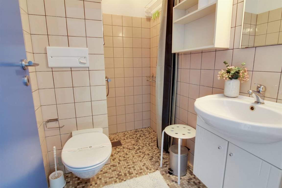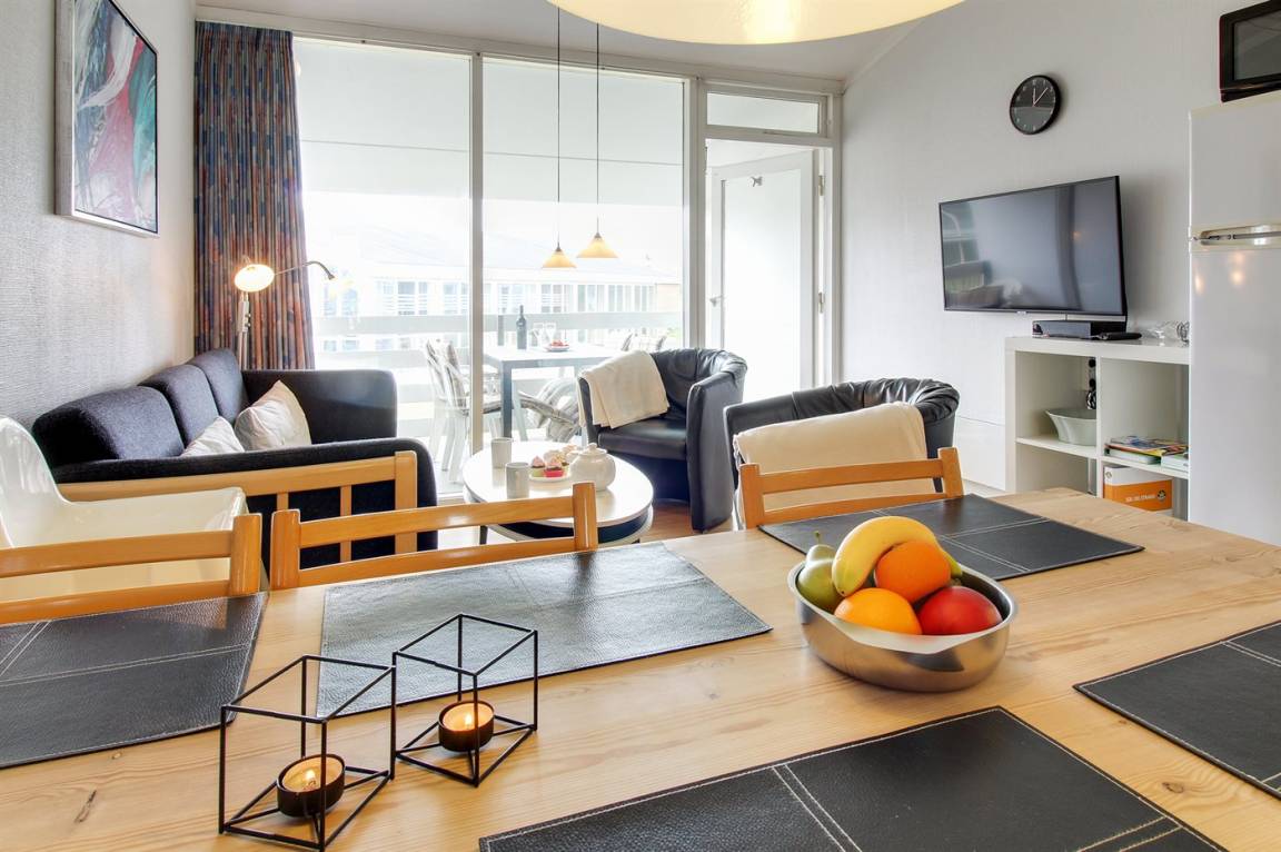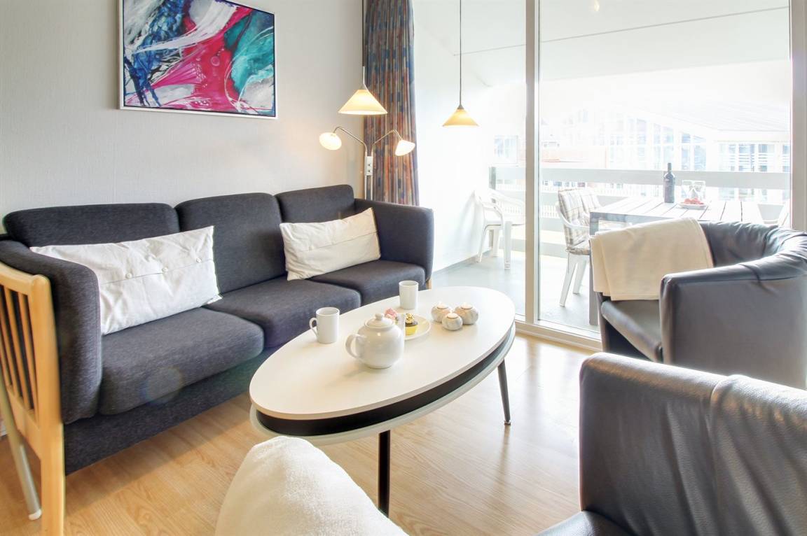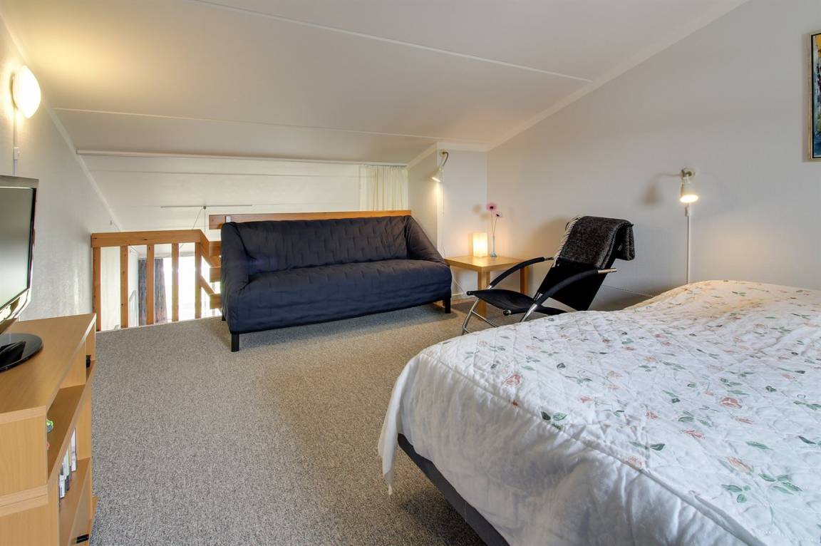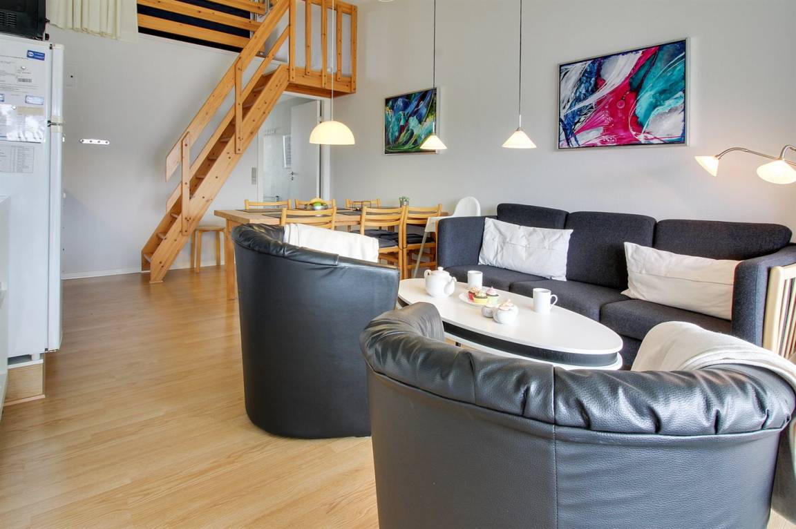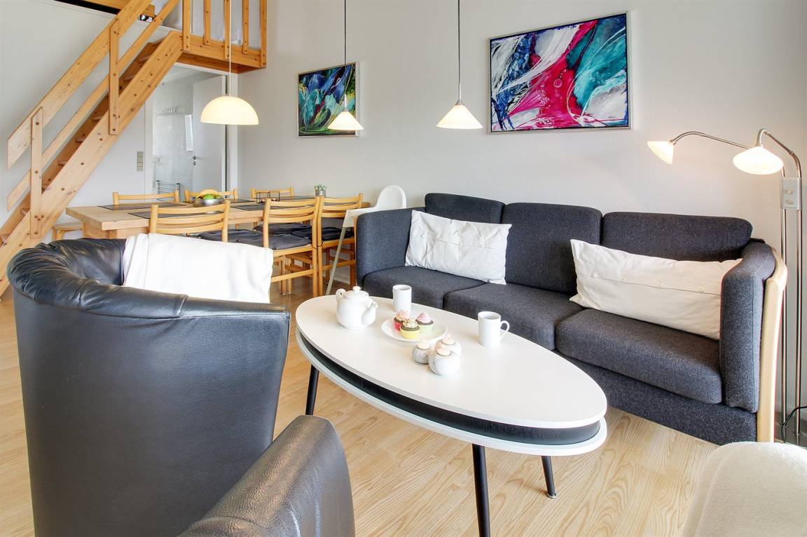 Die Wohnung ist gut eingerichtet u. a. mit kombinierter Küche/Wohnzimer, von wo aus Sie auf einen überdachten Balkon gelangen, auf dem Sie den größten Teil des Tages die Sonne genießen können. Die Wohnung verfügt über ein Badezimmer mit Dusche. 2 Schlafzimmer, eines mit Doppelbett, das andere mit 2 Einzelbetten. Im Obergeschoss/offenes Obergeschoss befindet sich ein Doppelbett – hier können Sie es sich auch mit einem Brettspiel oder einem guten Buch gemütlich machen.