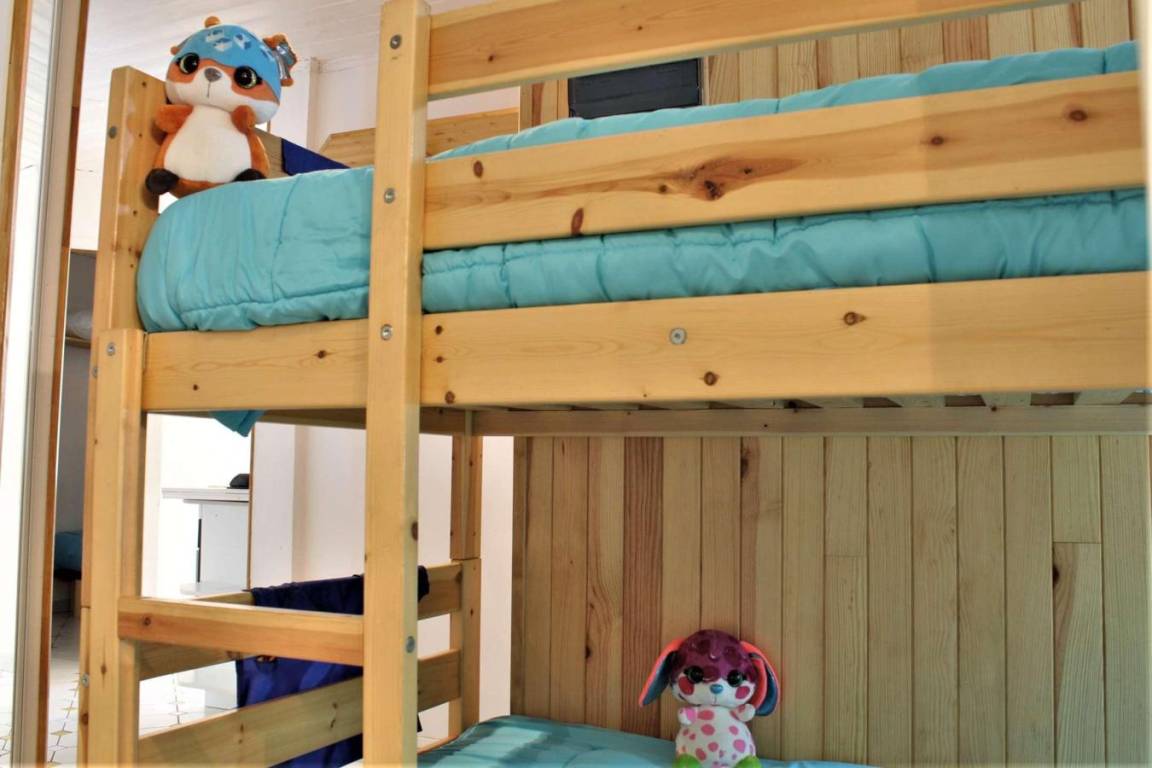 Fläche von ungefähr 40 m². 1te Etage. Orientierung : Süd. Wohnzimmer mit Klappschlafcouch. offener Schlafbereich mit 2 Stockbetten. offener Schlafbereich mit Doppelbett. Küche mit Kaffeemaschine (capsule), Backofen, kleiner Backofen mit Mikrowellenfunktion, Geschirrspülmaschine, 2 Herdplatten, Kühlschrank. Waschräume mit Dusche, Waschmaschine, WC. Balkon. Die oberen Betten sind nicht für Kinder unter 6 Jahren geeignet.