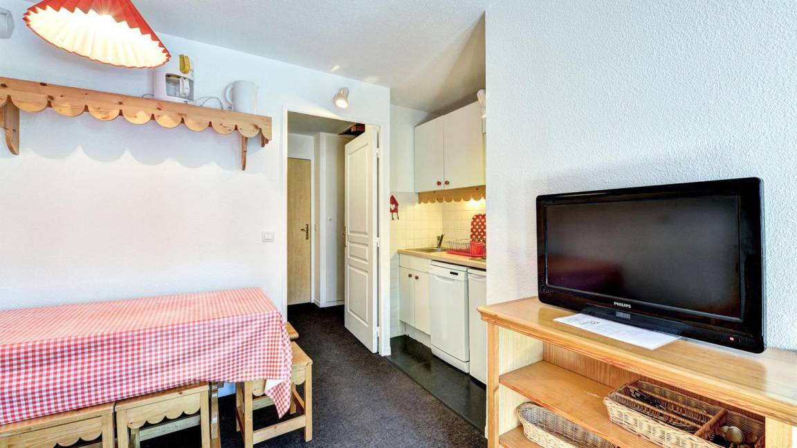 Fläche von ungefähr 28 m². Wohnzimmer mit Ausziehschlafcouch für 2 Personen. offener Schlafbereich mit Ausziehschlafcouch für 2 Personen oder 2 Stockbetten, schiebetüren. Kochnische mit Wasserkocher, Kaffeemaschine, Geschirrspülmaschine, kleiner Backofen oder Mikrowellenherd, elektronische Herdplatten, Kühlschrank. Badezimmer mit Badewanne, WC. Balkon. Die oberen Betten sind nicht für Kinder unter 6 Jahren geeignet.