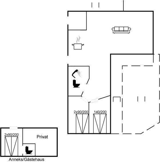 Im Haupthaus befinden sich 2 Schlafzimmer mit Doppelbett, eines der beiden Betten ist ein elektrisch verstellbares Bett. Zusätzlich gibt es ein Gästehaus mit einem Schlafzimmer mit Doppelbett sowie eine Gästetoilette.