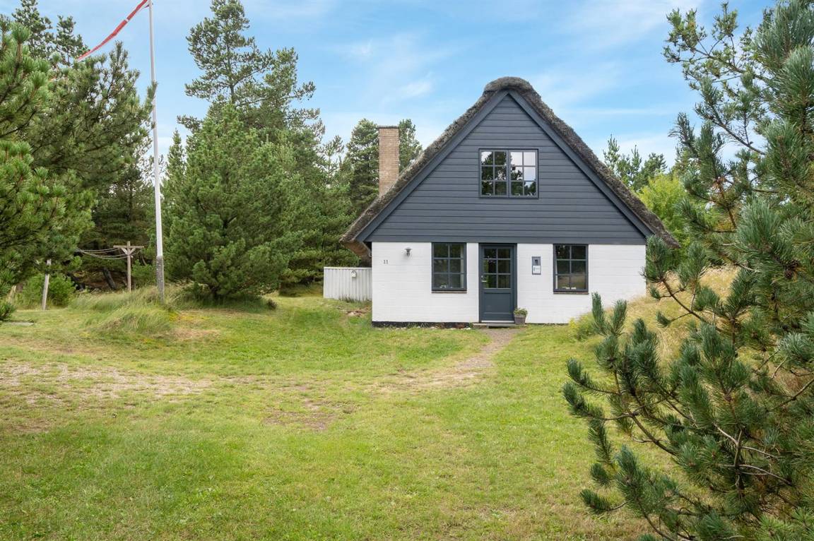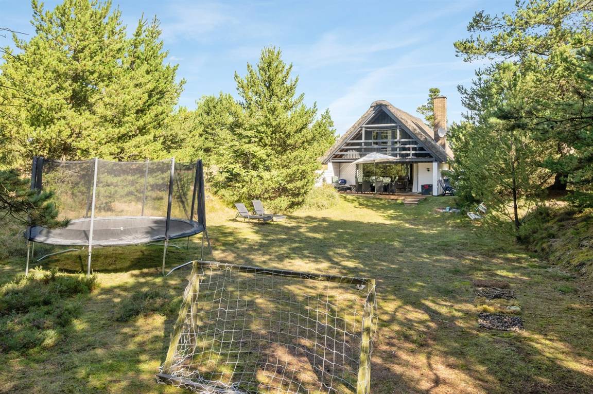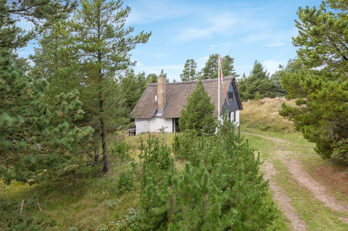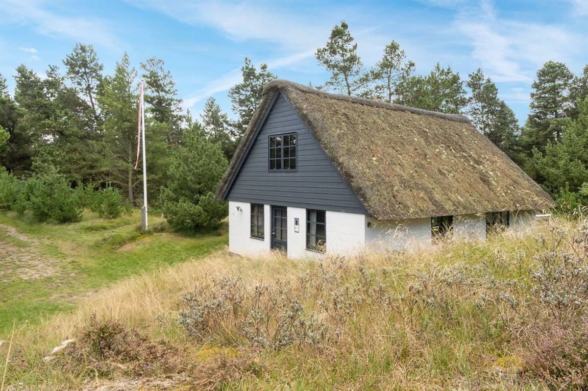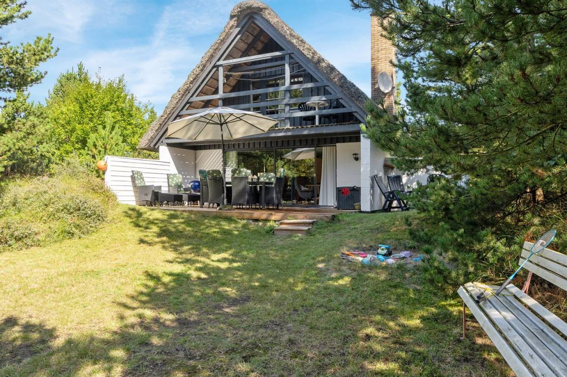 Hübsches 2-stöckige Ferienhaus aus Stein mit Reetdach, 1973 gebaut und 2016 letztens modernisiert. Das Haus liegt auf einem großen Naturgrundstück mit großen Bäumen und gutem Windschutz - im ruhigen Gebiet, Vesterhede. Zum Haus gehören sowohl überdachter Balkon als auch eine zum Teil überdachte Terrasse mit Gartenmöbeln. Badezimmer mit Fußbodenheizung. Sauna. Die schöne, helle Küche mit Fußbodenheizung ist mit u. a. Geschirrspüler, Mikrowelle, Tiefkühlgerät und Waschmaschine ausgestattet. Das nette Wohnzimmer ist mit Kaminofen, DVD-Spieler, Blaupunkt Flatscreen-TV mit Satellitenanschluss und Stereoanlage mit Radio und CD-Spieler eingerichtet. Ferner kostenlose, kabellose Internetverbindung vorh. (Computer ist mitzubringen). 3 Schlafzimmer; 2 mit Doppelbett im Obergeschoss und 1 mit Doppelbett und Einzelbett im Erdgeschoss. Es ist eine energiegerechte Wärmepumpe installiert. Für die kleinen Feriengäste gibt es Kinderbett, Kinderhochstuhl, Schaukel und Sandkasten. Auf dem Grundstück, das vom Weg zurückgezogen liegt, gibt es ein großes Trampolin, Fußballtor und viel Platz zum Spielen.