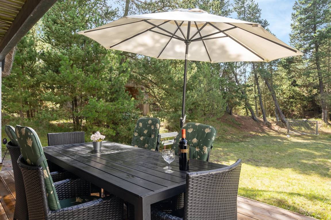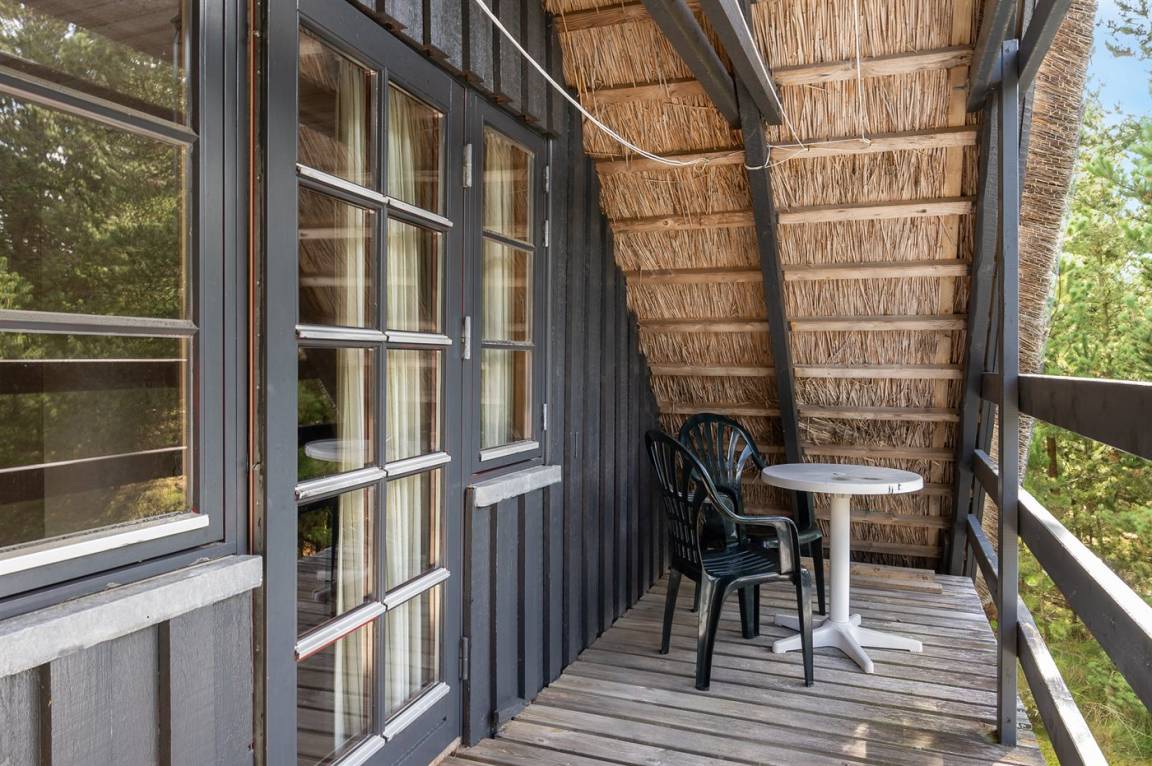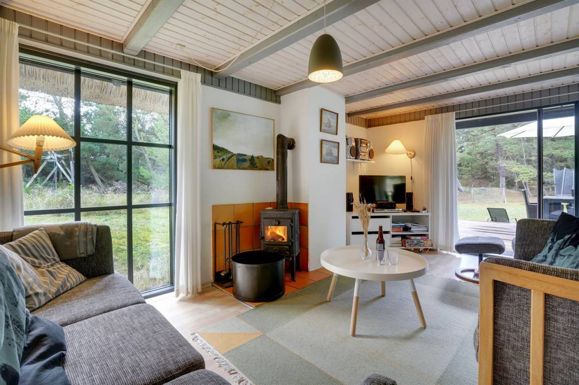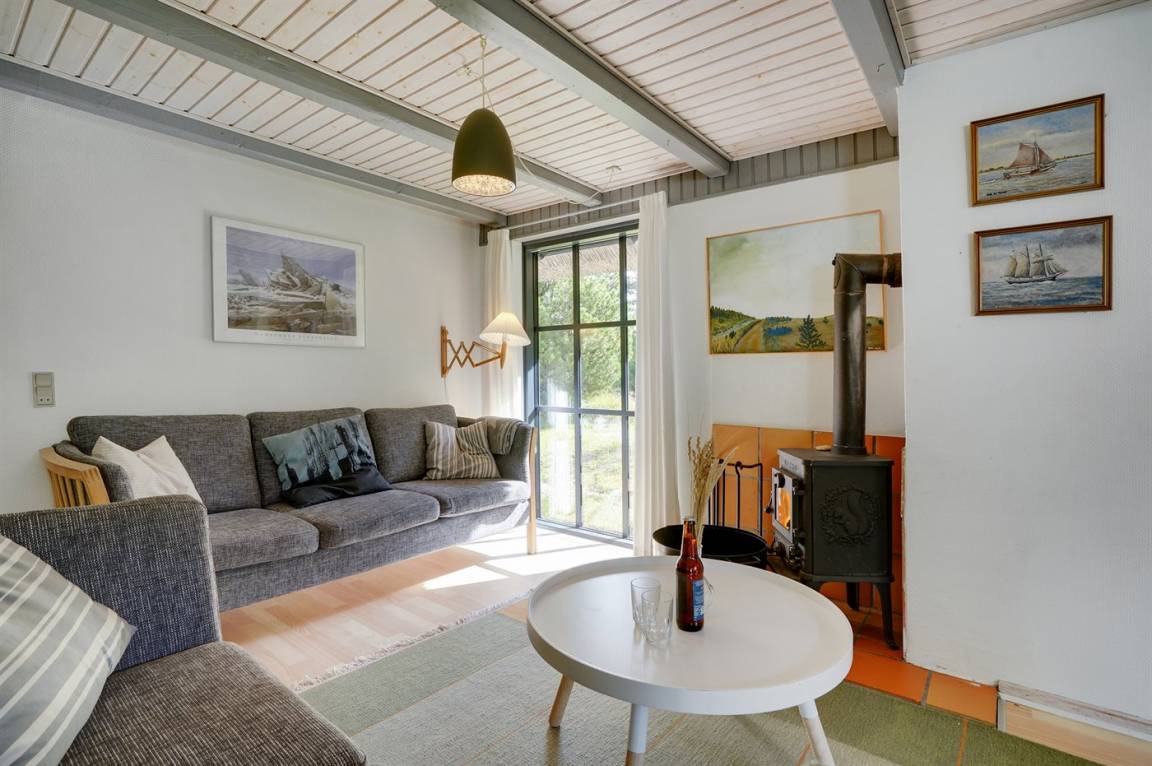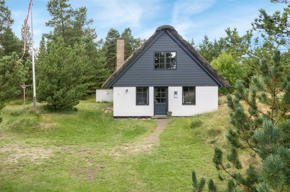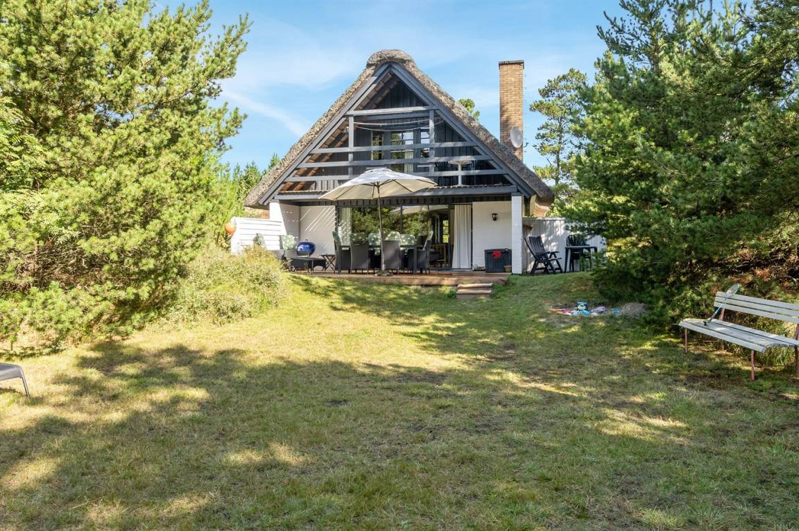 Hübsches 2-stöckige Ferienhaus aus Stein mit Reetdach, 1973 gebaut und 2016 letztens modernisiert. Das Haus liegt auf einem großen Naturgrundstück mit großen Bäumen und gutem Windschutz - im ruhigen Gebiet, Vesterhede. Zum Haus gehören sowohl überdachter Balkon als auch eine zum Teil überdachte Terrasse mit Gartenmöbeln. Badezimmer mit Fußbodenheizung. Sauna. Die schöne, helle Küche mit Fußbodenheizung ist mit u. a. Geschirrspüler, Mikrowelle, Tiefkühlgerät und Waschmaschine ausgestattet. Das nette Wohnzimmer ist mit Kaminofen, DVD-Spieler, Blaupunkt Flatscreen-TV mit Satellitenanschluss und Stereoanlage mit Radio und CD-Spieler eingerichtet. Ferner kostenlose, kabellose Internetverbindung vorh. (Computer ist mitzubringen). 3 Schlafzimmer; 2 mit Doppelbett im Obergeschoss und 1 mit Doppelbett und Einzelbett im Erdgeschoss. Es ist eine energiegerechte Wärmepumpe installiert. Für die kleinen Feriengäste gibt es Kinderbett, Kinderhochstuhl, Schaukel und Sandkasten. Auf dem Grundstück, das vom Weg zurückgezogen liegt, gibt es ein großes Trampolin, Fußballtor und viel Platz zum Spielen.