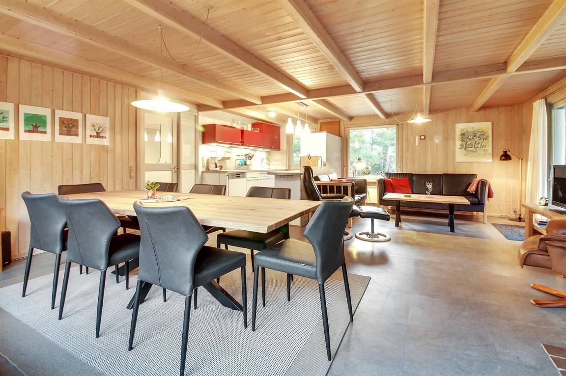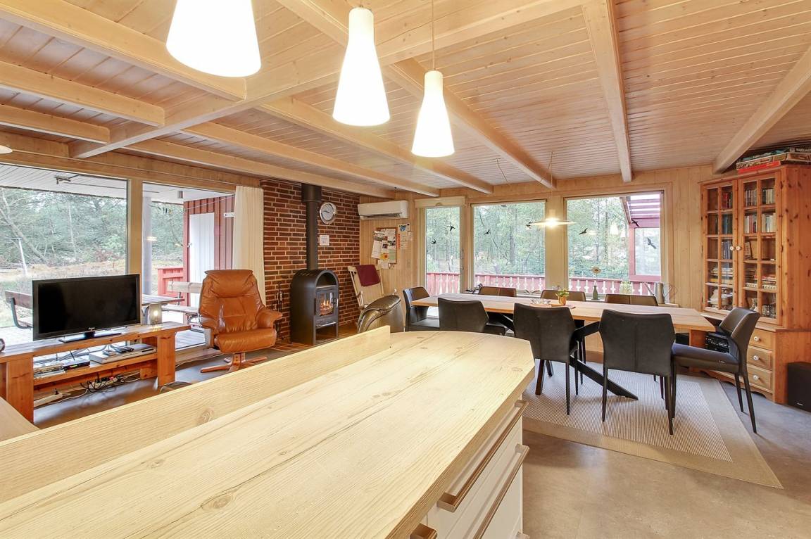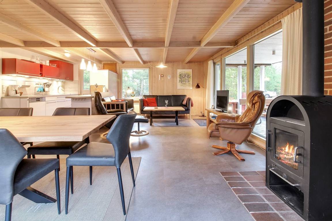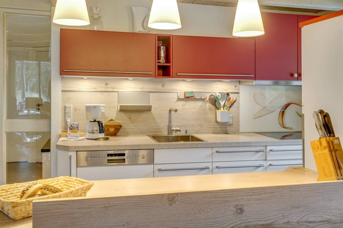 Die helle Küche ist mit dem Wohnzimmer kombiniert und enthält u. a. Geschirrspüler, Tiefkühlgerät, Mikrowelle, Heißluftbackofen mit Pyrolyse und Induktionskochfeld. Schönes Wohnzimmer mit großen Fenstern, Kaminofen, TV mit Satellitenanschluss und Stereoanlage mit CD-Spieler.