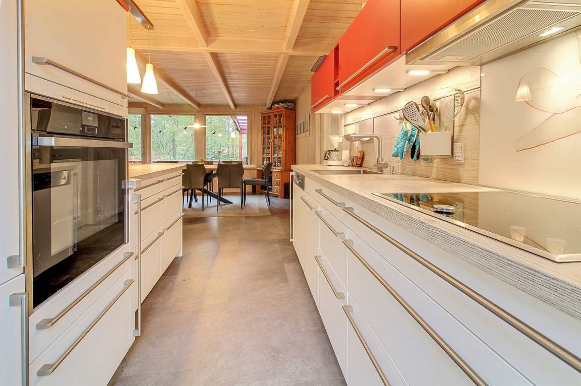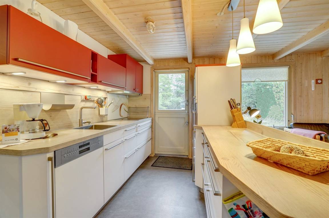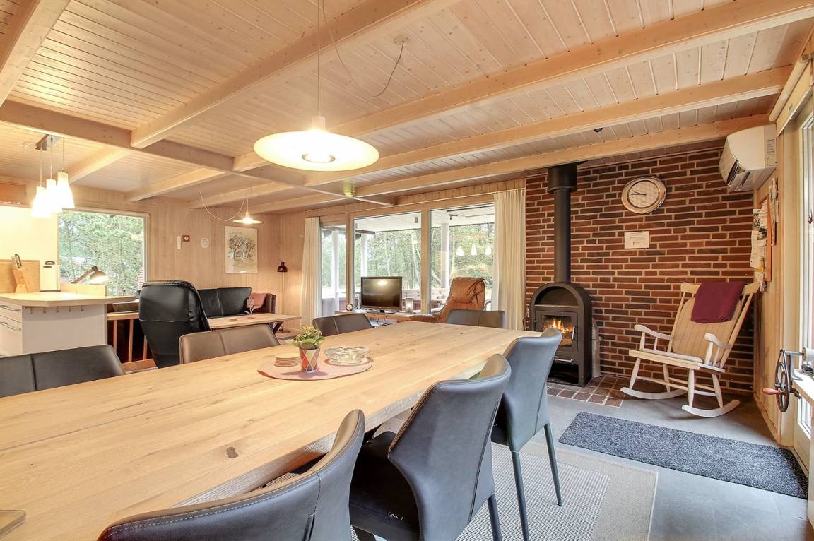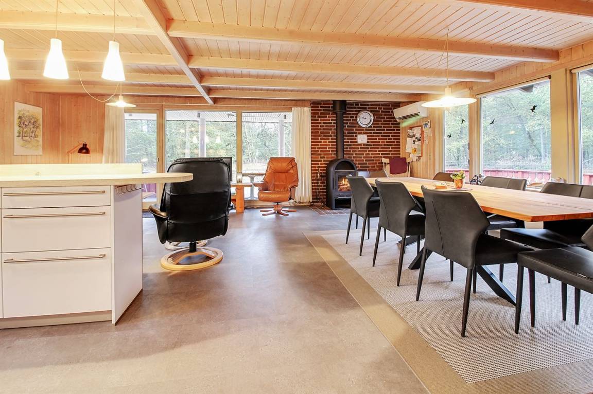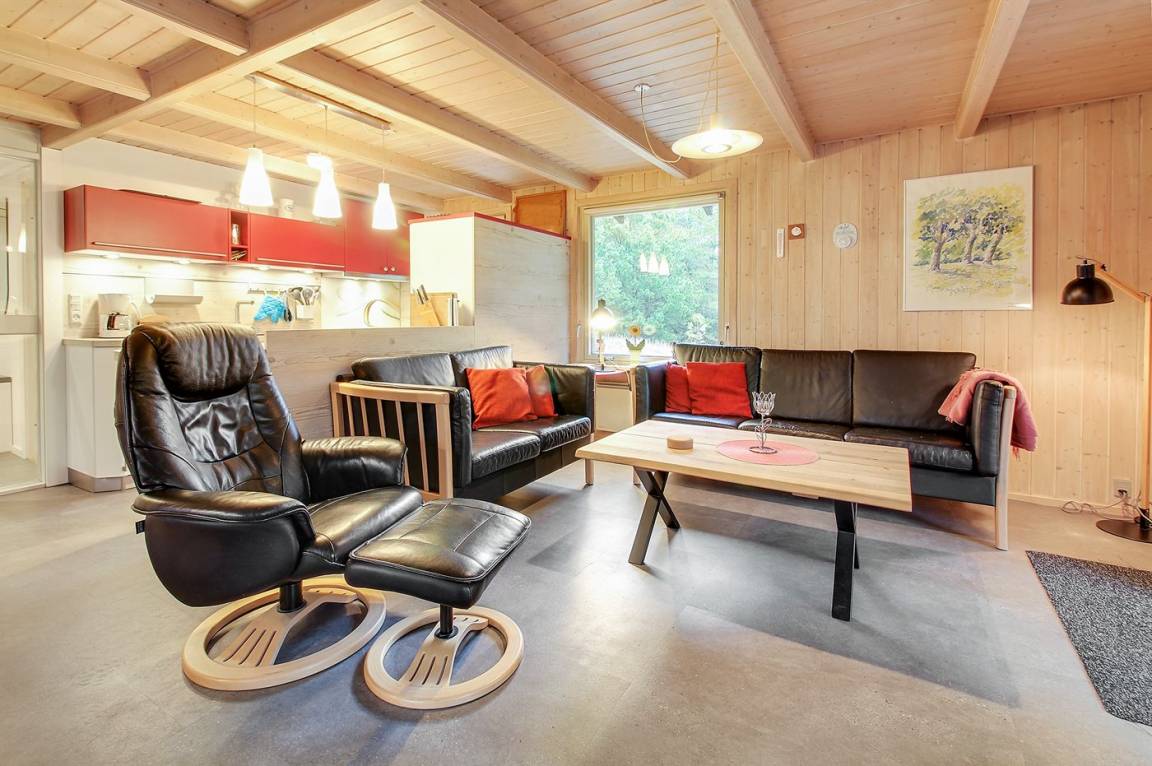 Die helle Küche ist mit dem Wohnzimmer kombiniert und enthält u. a. Geschirrspüler, Tiefkühlgerät, Mikrowelle, Heißluftbackofen mit Pyrolyse und Induktionskochfeld. Schönes Wohnzimmer mit großen Fenstern, Kaminofen, TV mit Satellitenanschluss und Stereoanlage mit CD-Spieler.