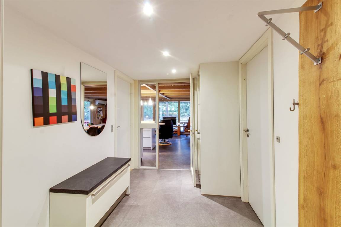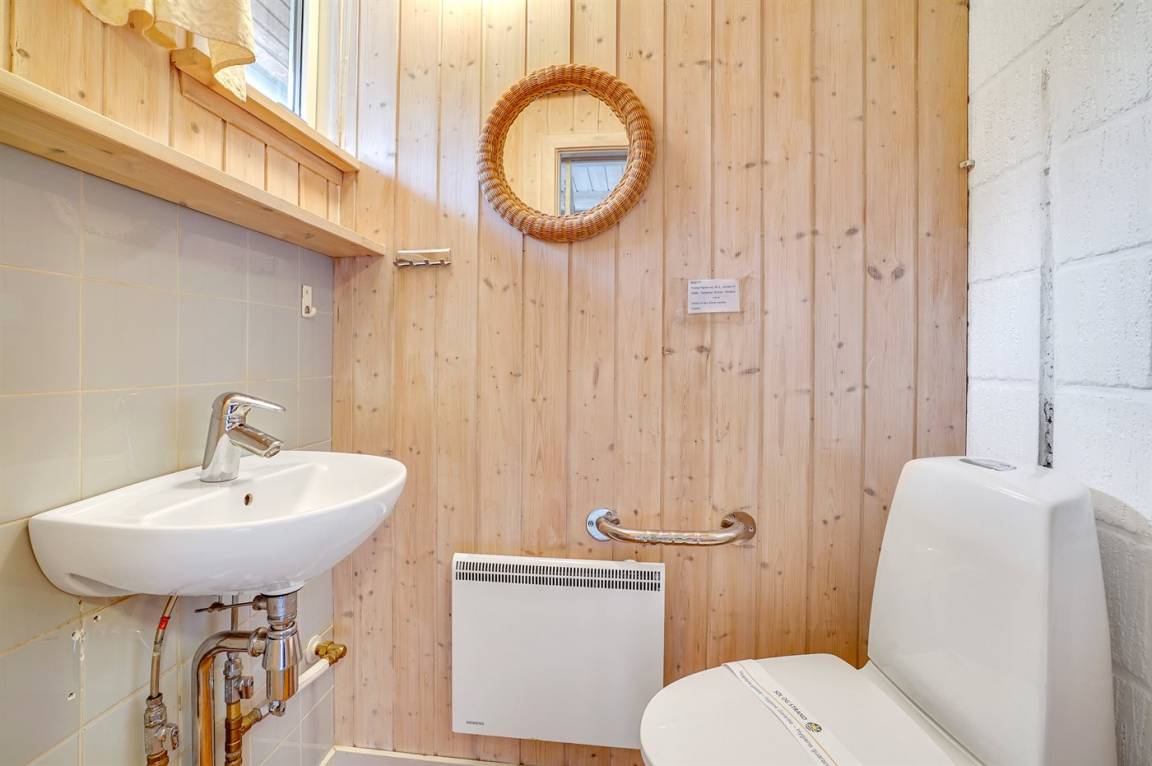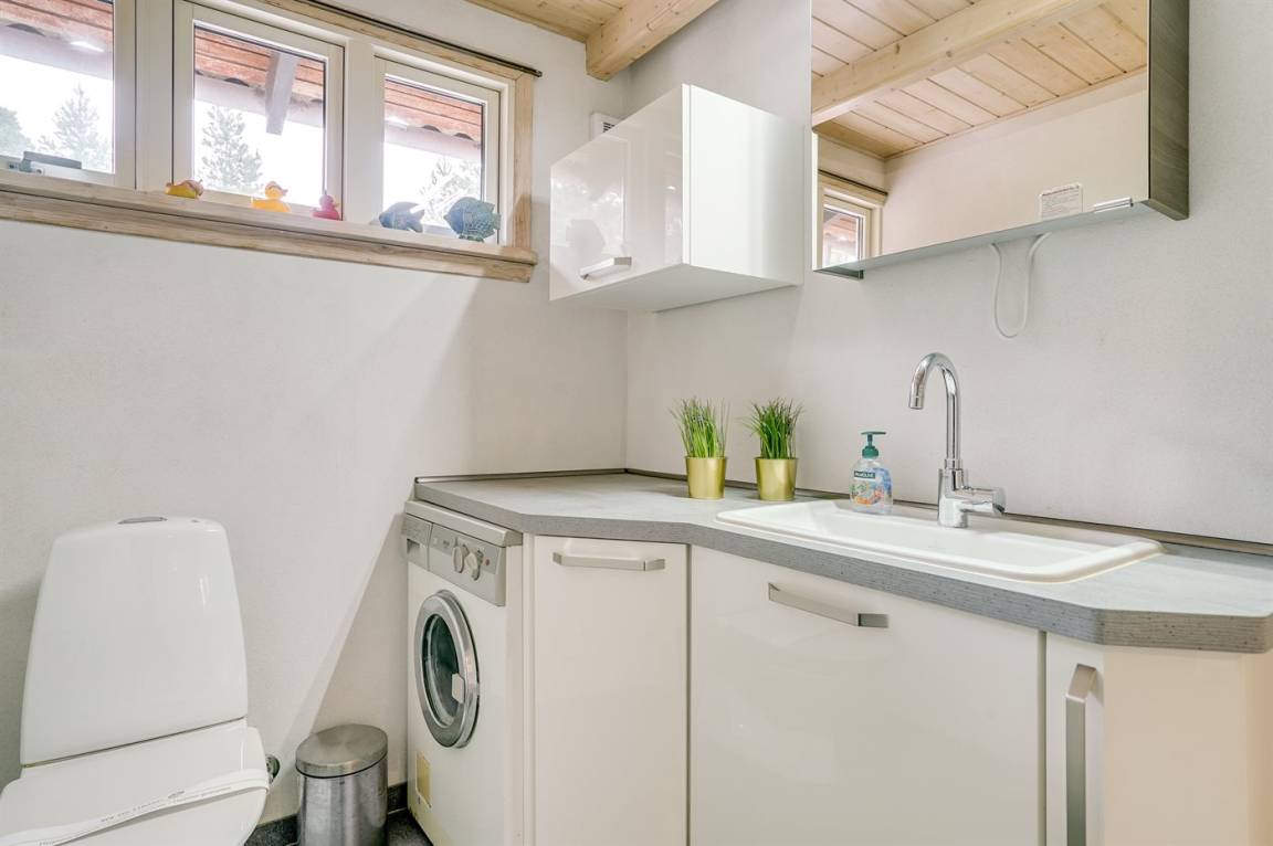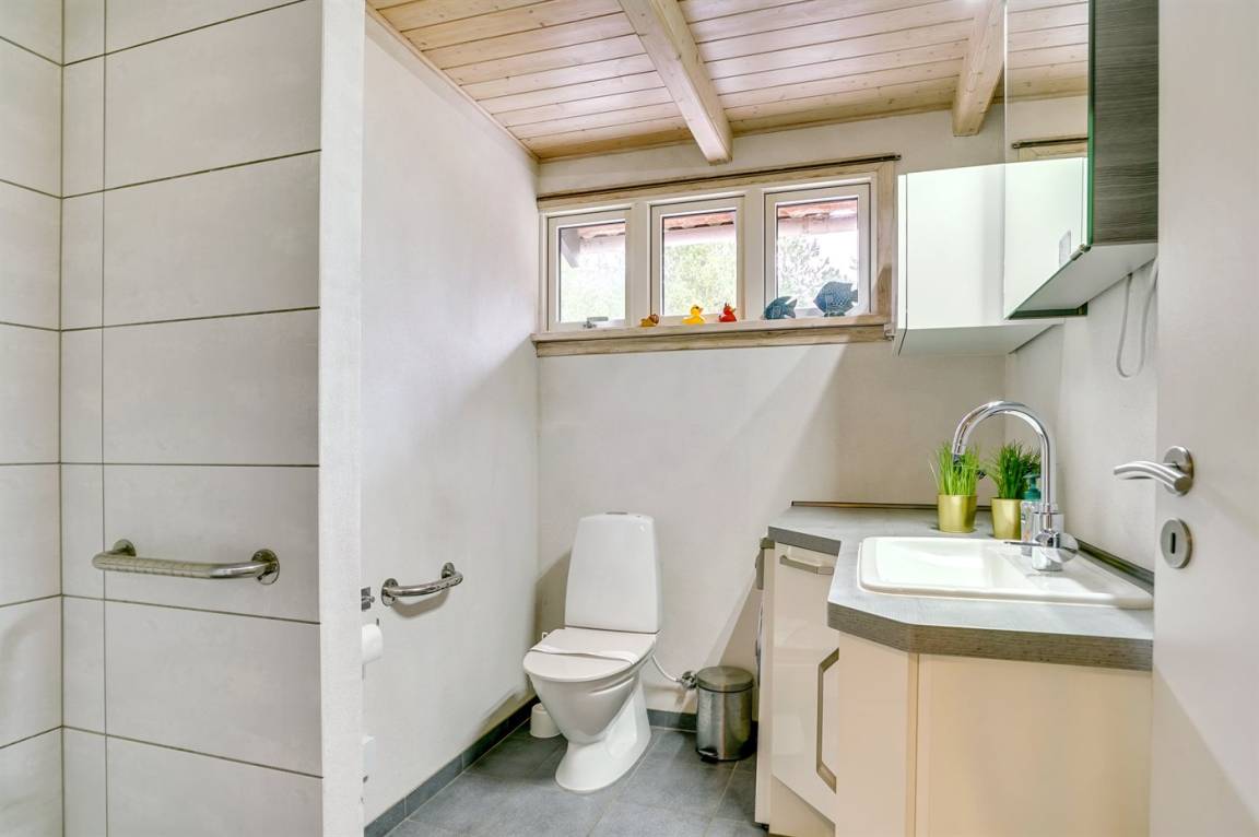 Innen sind die Wände mit Holz verkleidet. Die Böden in Wohnzimmer, Schlafzimmer und Flur sind mit Design Vinyl ausgelegt. Badezimmer (2015) mit Fußbodenheizung, hübscher Duschnische und Waschmaschine. Gästetoilette.