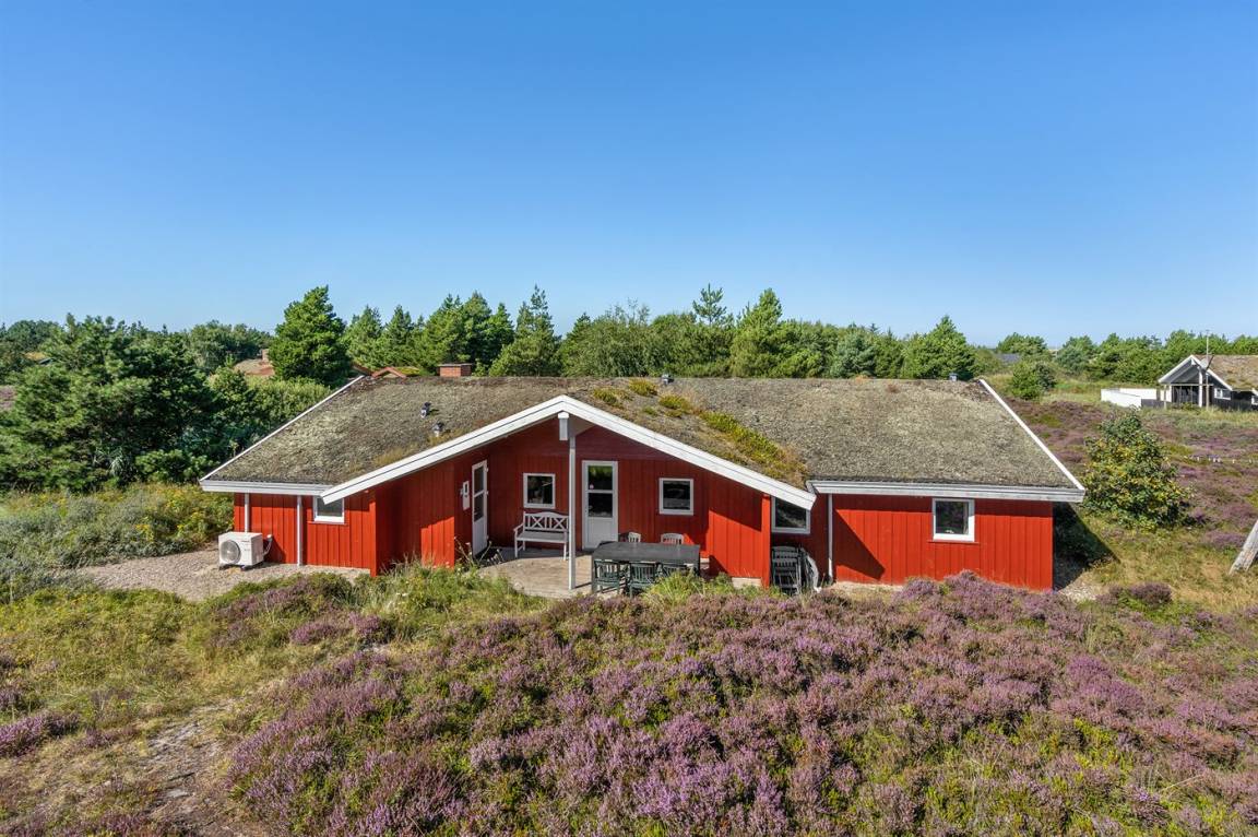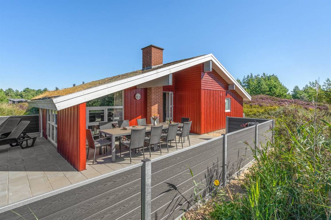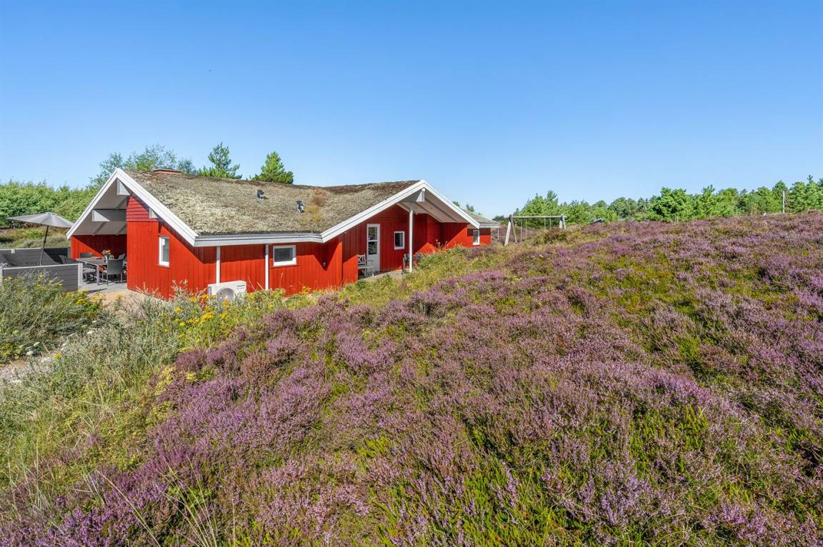 Dieses große, schöne Ferienhaus aus Holz liegt auf einem großen Naturgrundstück, das an einem mit Heidekraut bewachsenen Gebiet angrenzt. Zum Haus gehört ein schönes, großes, teils überdachtes Terrassenareal mit Gartenmöbeln.