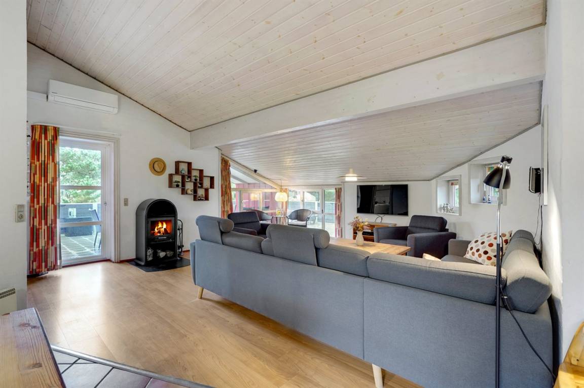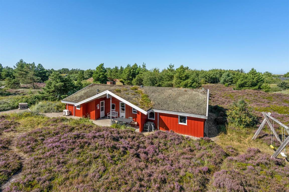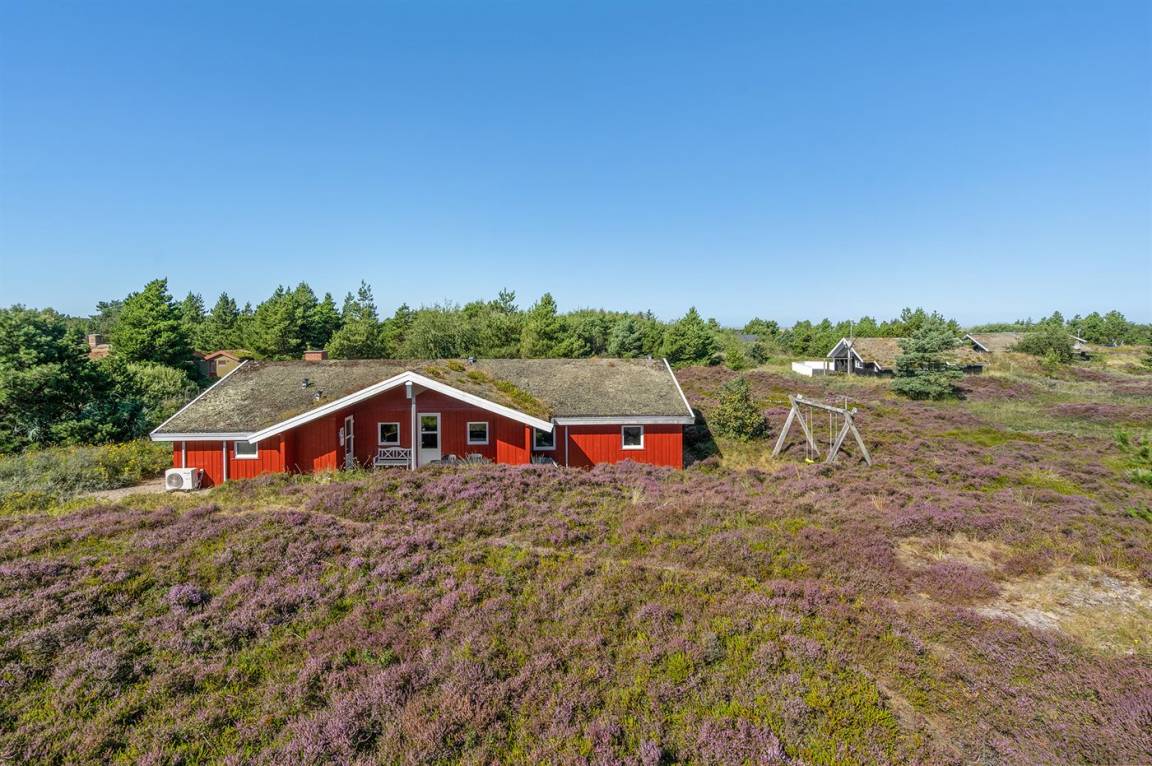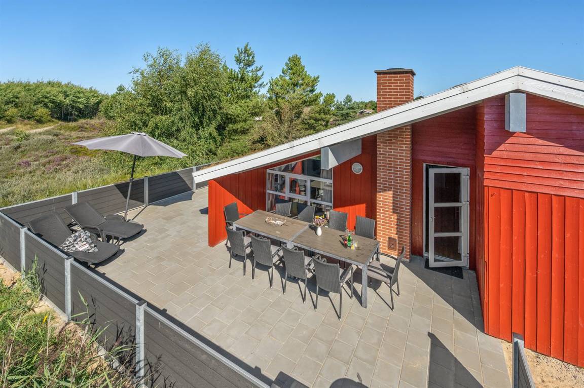 Dieses große, schöne Ferienhaus aus Holz liegt auf einem großen Naturgrundstück, das an einem mit Heidekraut bewachsenen Gebiet angrenzt. Zum Haus gehört ein schönes, großes, teils überdachtes Terrassenareal mit Gartenmöbeln.