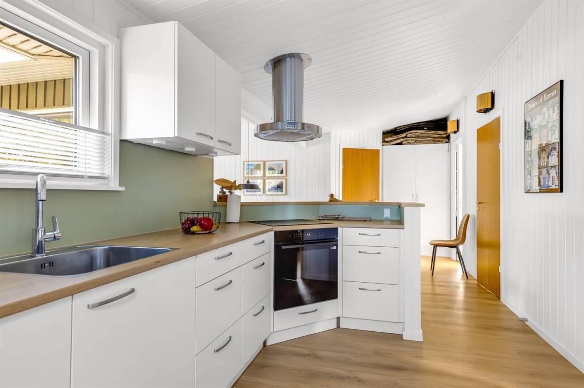 Die helle und gut ausgestattete Küche enthält u. a. Umluftofen, 4 Induktions-Kochzonen, Tiefkühlgerät, Geschirrspüler und Mikrowelle.