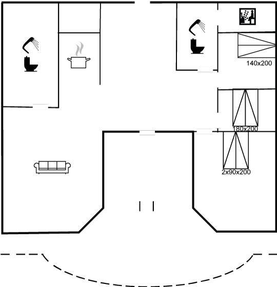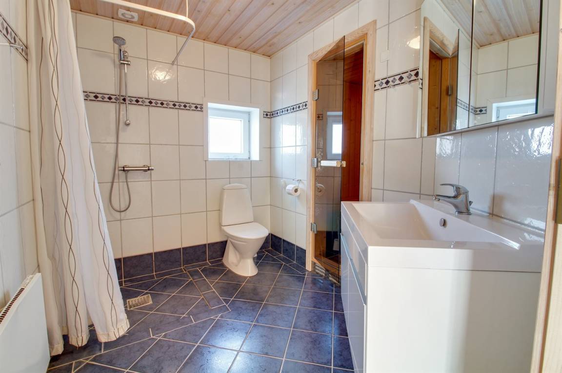 Zum Haus gehört nette, offene Terrasse mit Gartenmöbeln. 2 Badezimmer, beide mit Duschnische und Fußbodenheizung. Sauna mit Dampftherapie. Die Küche ist u. a. mit Tiefkühlgerät, Umluftofen, Mikrowelle und Geschirrspüler ausgestattet. Das Wohnzimmer ist mit Kaminofen eingerichtet. An weiterer Ausstattung können kostenlose, kabellose Internetverbindung (Computer ist mitzubringen), Radio, Waschmaschine sowie Wäschetrockner erwähnt werden und es ist eine energiesparende Wärmepumpe installiert.