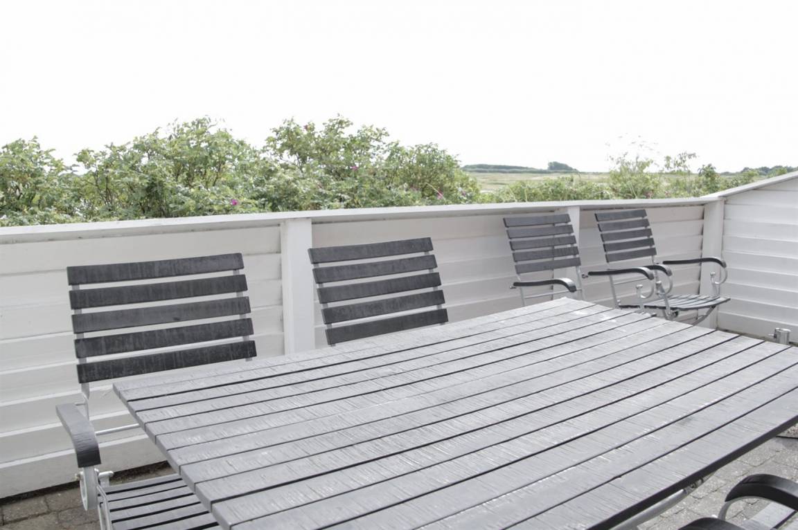 Diese Ferienwohnung, 1987 in 2 Etagen gebaut, liegt in erster Reihe in der Ferienanlage RIM. Die Wohnfläche beträgt 68 m² und eignet sich für 6 Personen sowie 1 Kleinkind bis zu 3 Jahren. Es ist erlaubt 1 Haustier mitzubringen. Es stehen 2 geschlossene Terrassen zur Verfügung – eine 14m² große ohne Tür (1 Tisch, 6 Stühle und Grill), in Richtung Süden und mit Ausblick auf den Golfplatz gelegen und eine 8,4 m² große Terrasse mit Tür (Tisch und Bänke), in Richtung Norden zum Parkplatz hinaus gelegen.