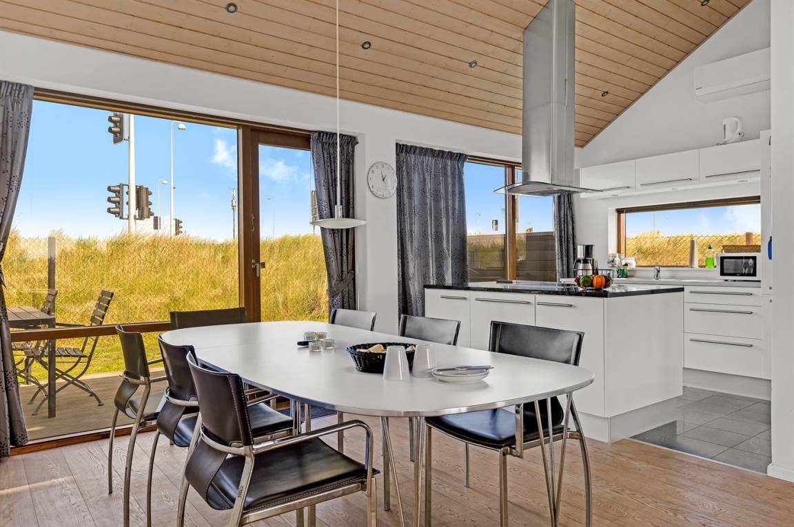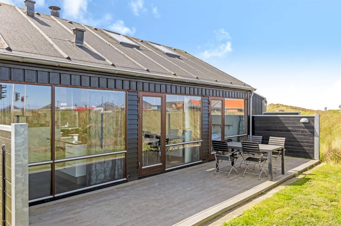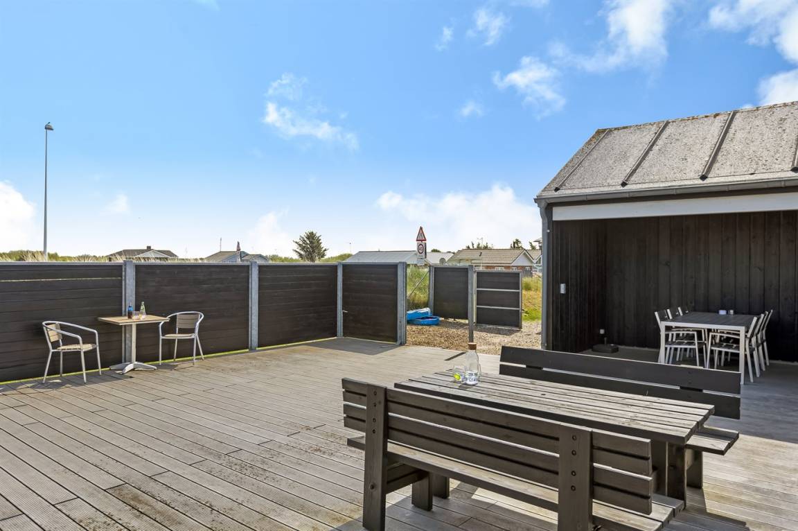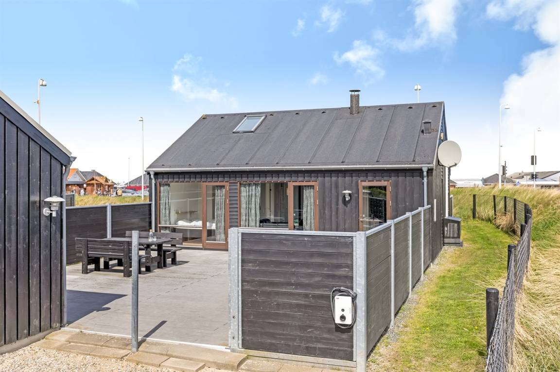 Auf der Ecke Vesterhavsvej und Lakolk zur Strandseite hinaus und im Gehabstand vom Strand und den verschiedenen Läden finden Sie dieses schöne Ferienhaus. Das Grundstück ist eingezäunt und verfügt über eine abschliesbare Pforte. Vom offenen Obergeschoss können Sie die Aussicht über das Meer genießen – hier finden Sie außerdem das eine Doppelbett. Schöne Schlafzimmer mit gutem Schrankplatz.