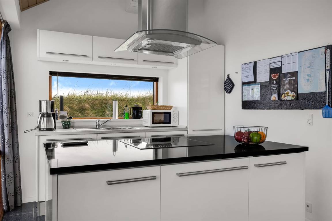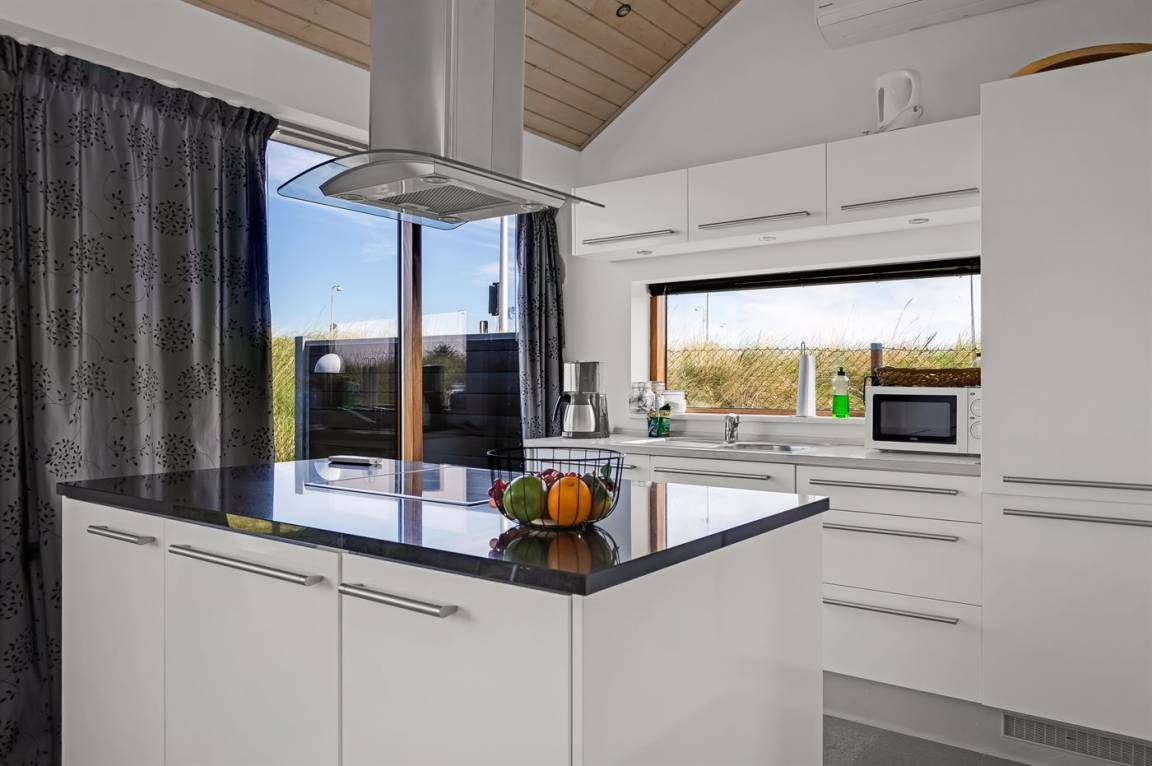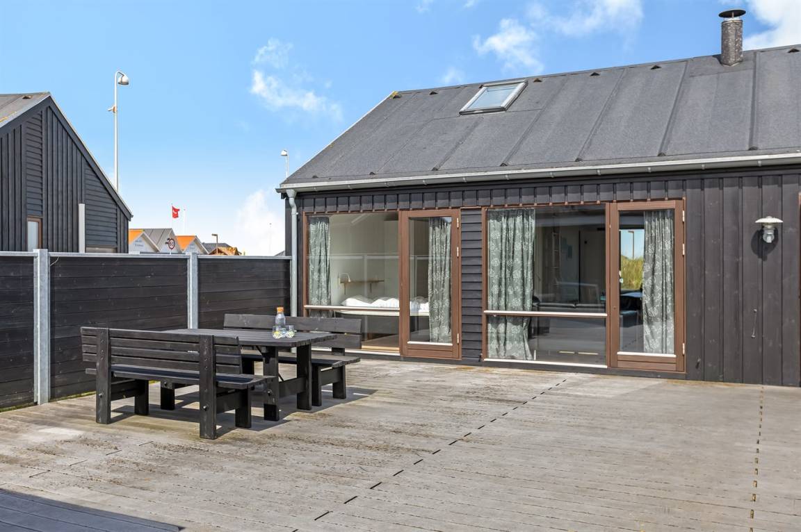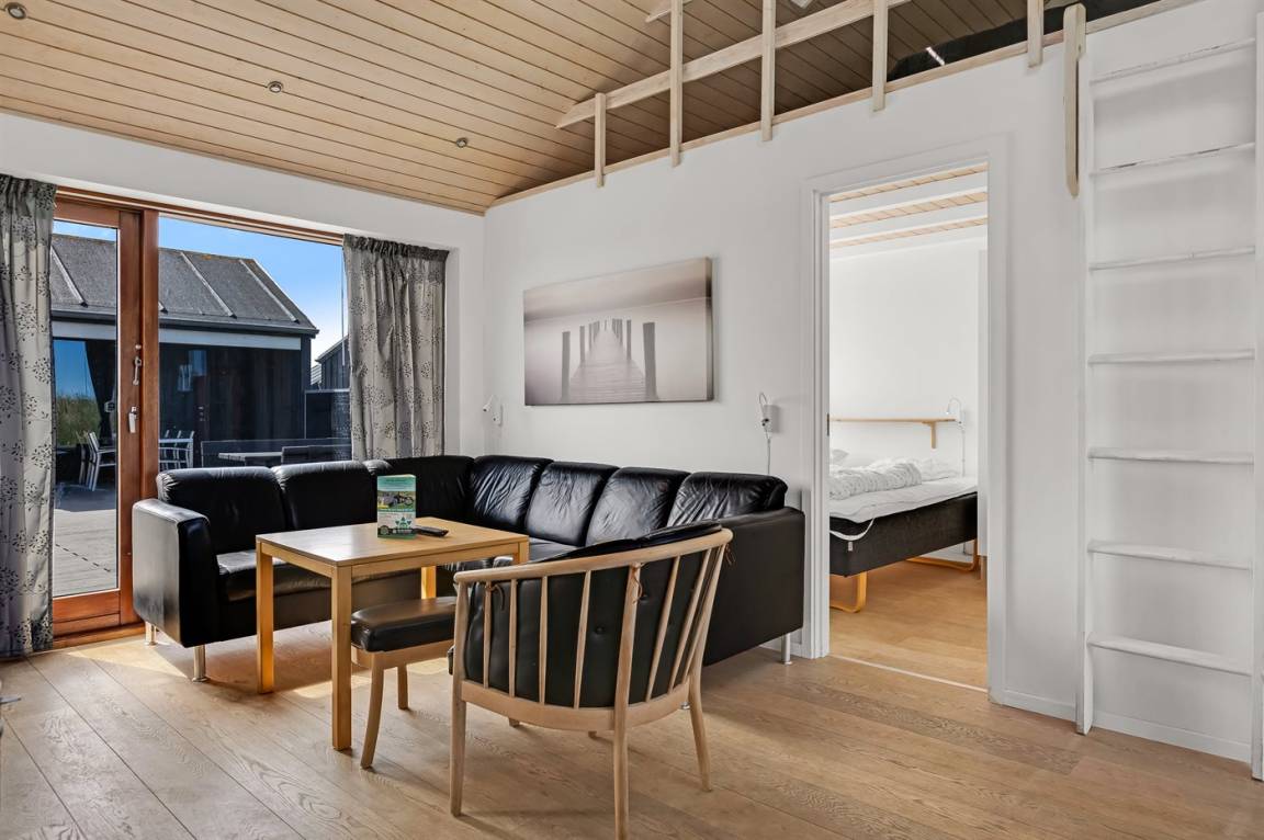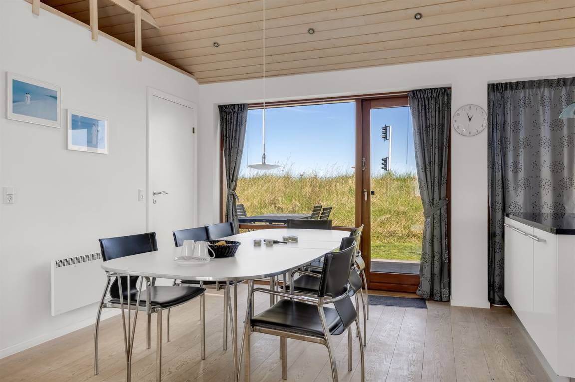 Auf der Ecke Vesterhavsvej und Lakolk zur Strandseite hinaus und im Gehabstand vom Strand und den verschiedenen Läden finden Sie dieses schöne Ferienhaus. Das Grundstück ist eingezäunt und verfügt über eine abschliesbare Pforte. Vom offenen Obergeschoss können Sie die Aussicht über das Meer genießen – hier finden Sie außerdem das eine Doppelbett. Schöne Schlafzimmer mit gutem Schrankplatz.