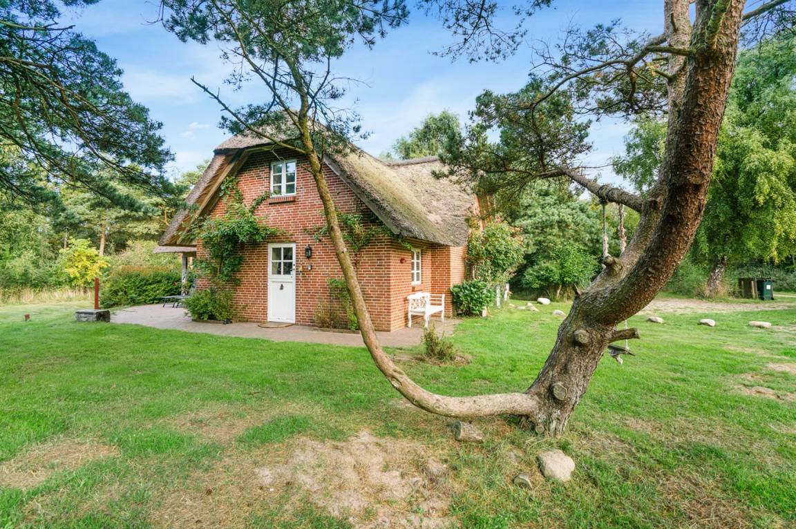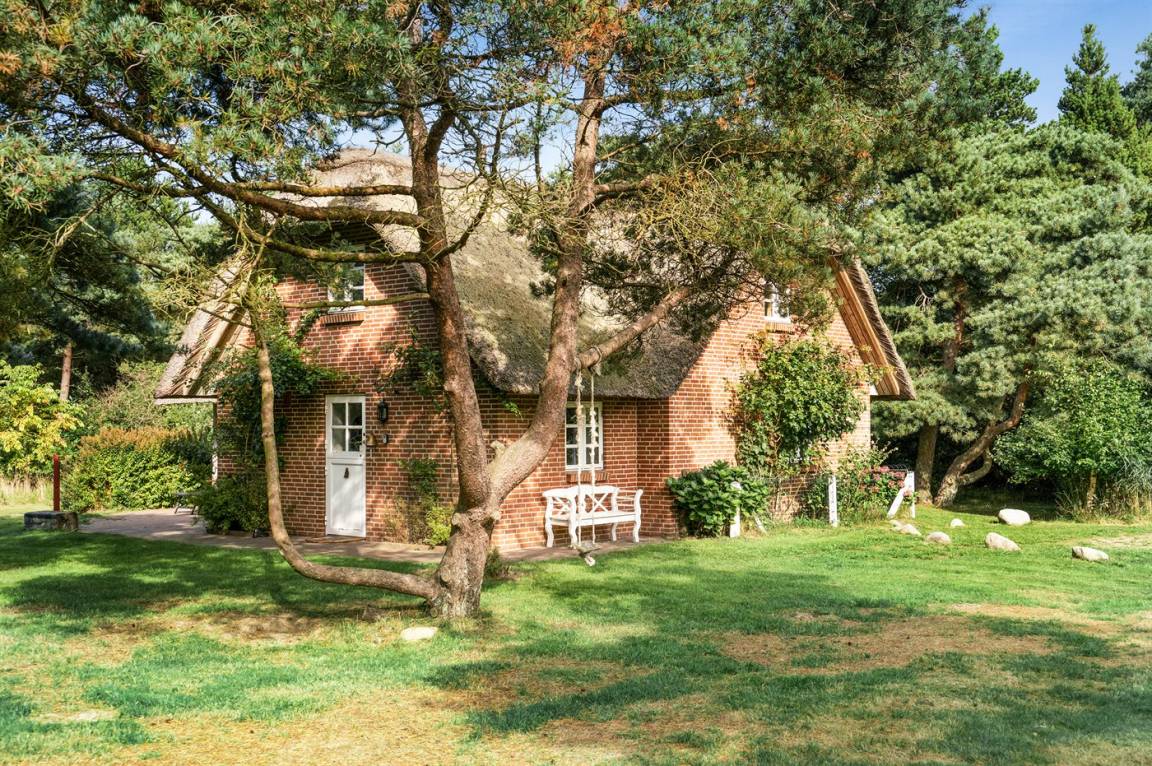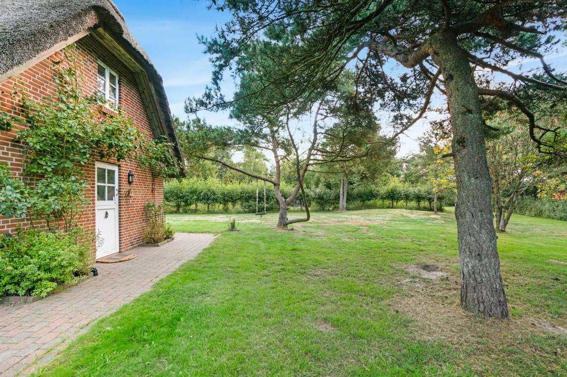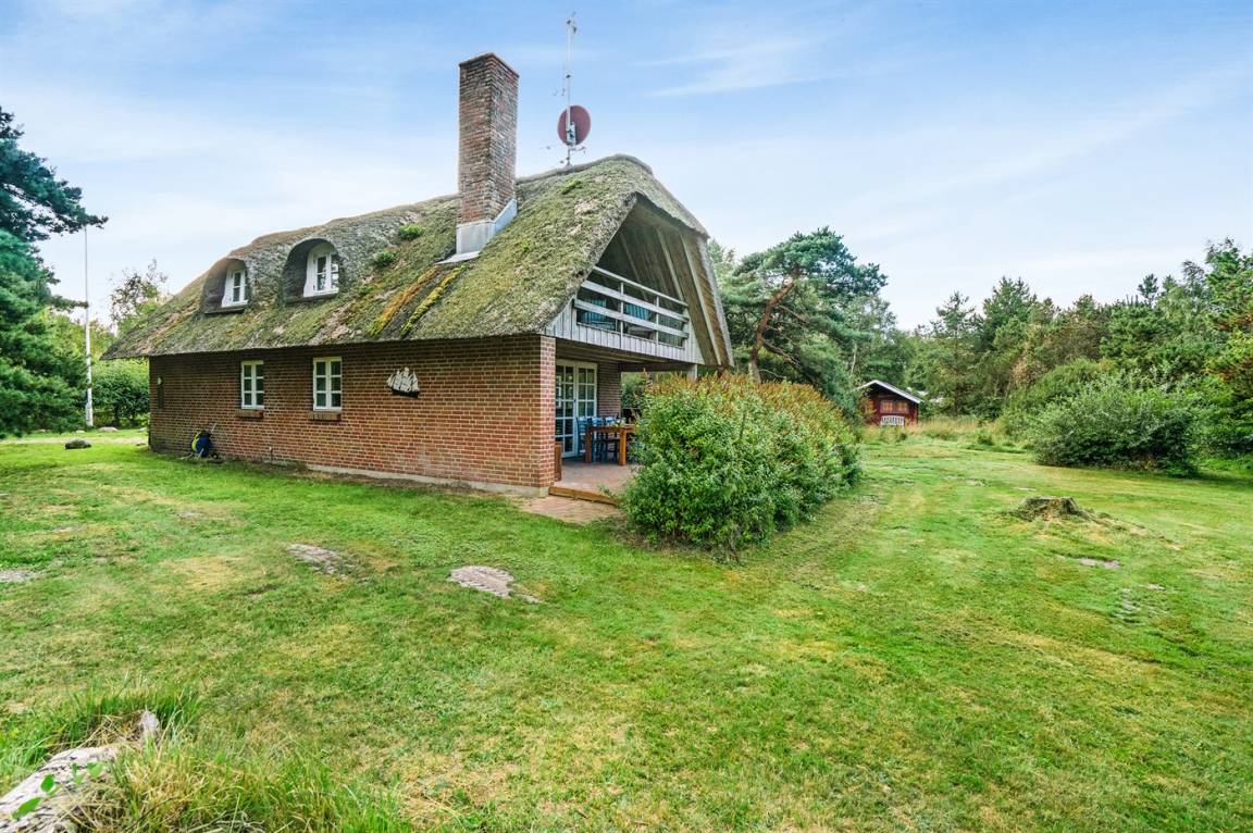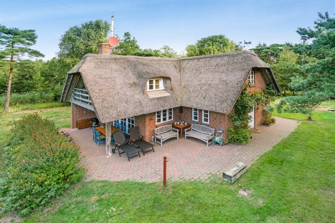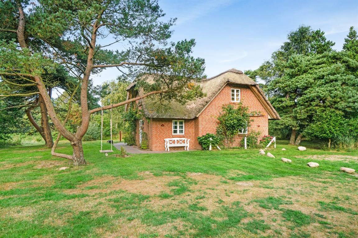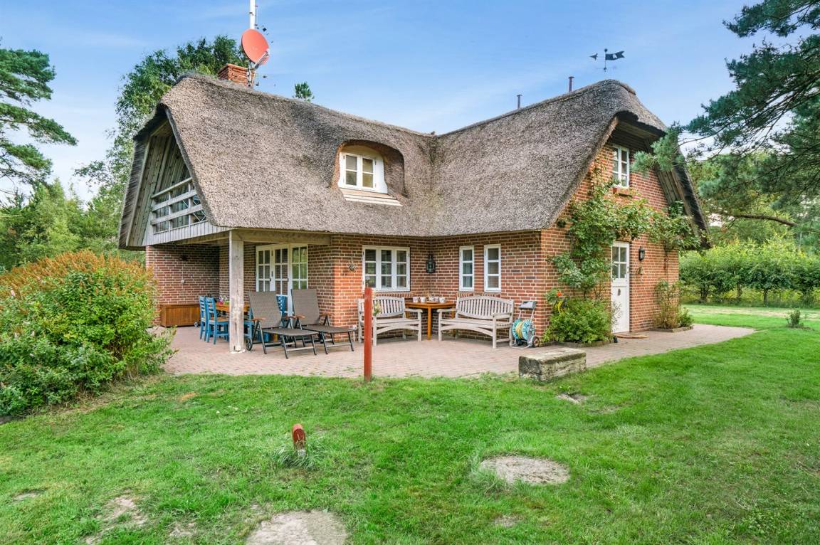 Dieses schöne Ferienhaus mit Reetdach liegt auf einem großen, mit Heidekraut bewachsenen Naturgrundstück mit Rasen dicht am Sønderstrand.