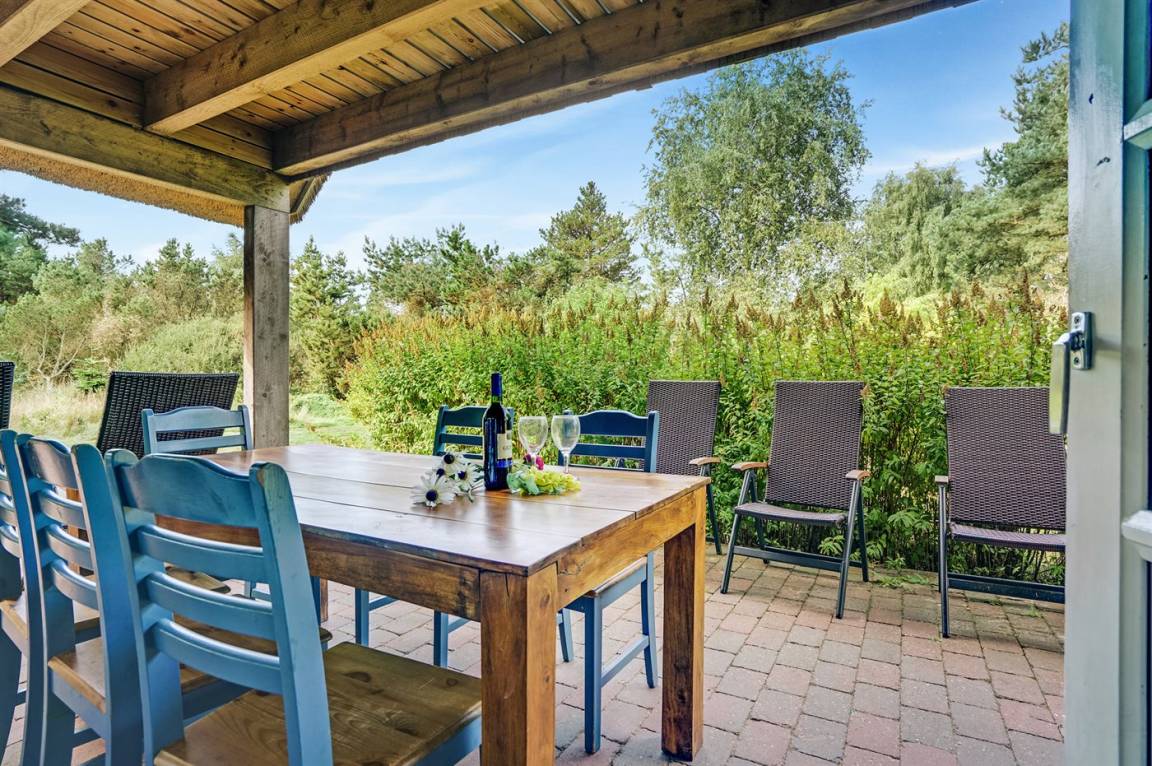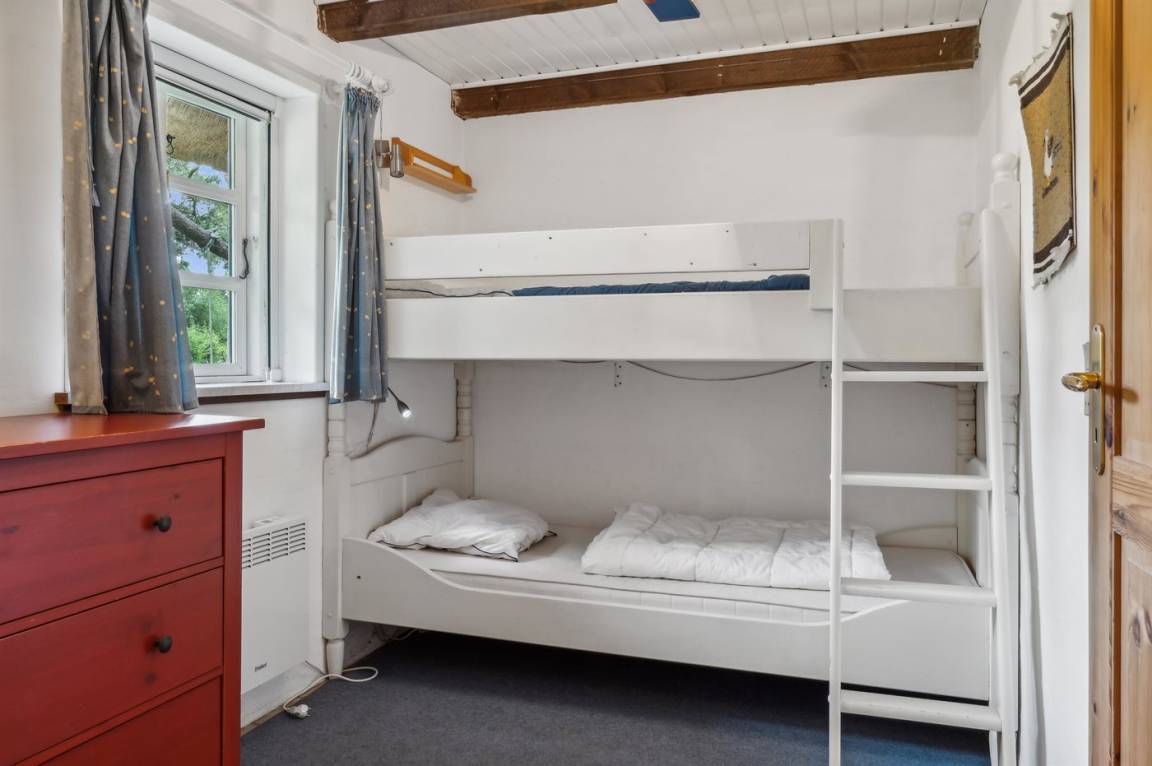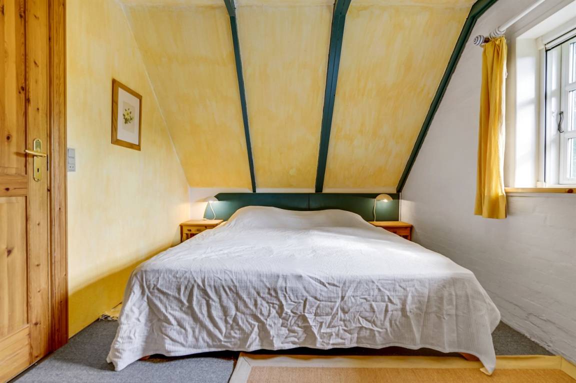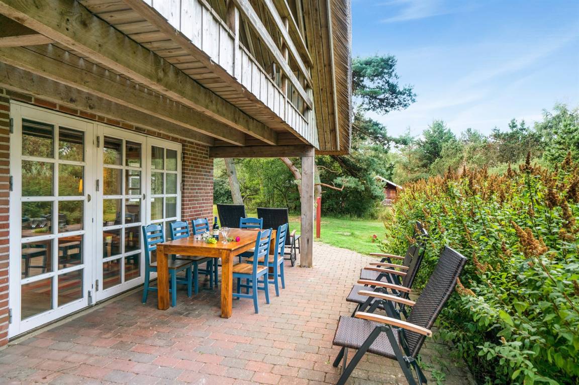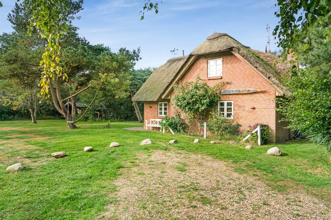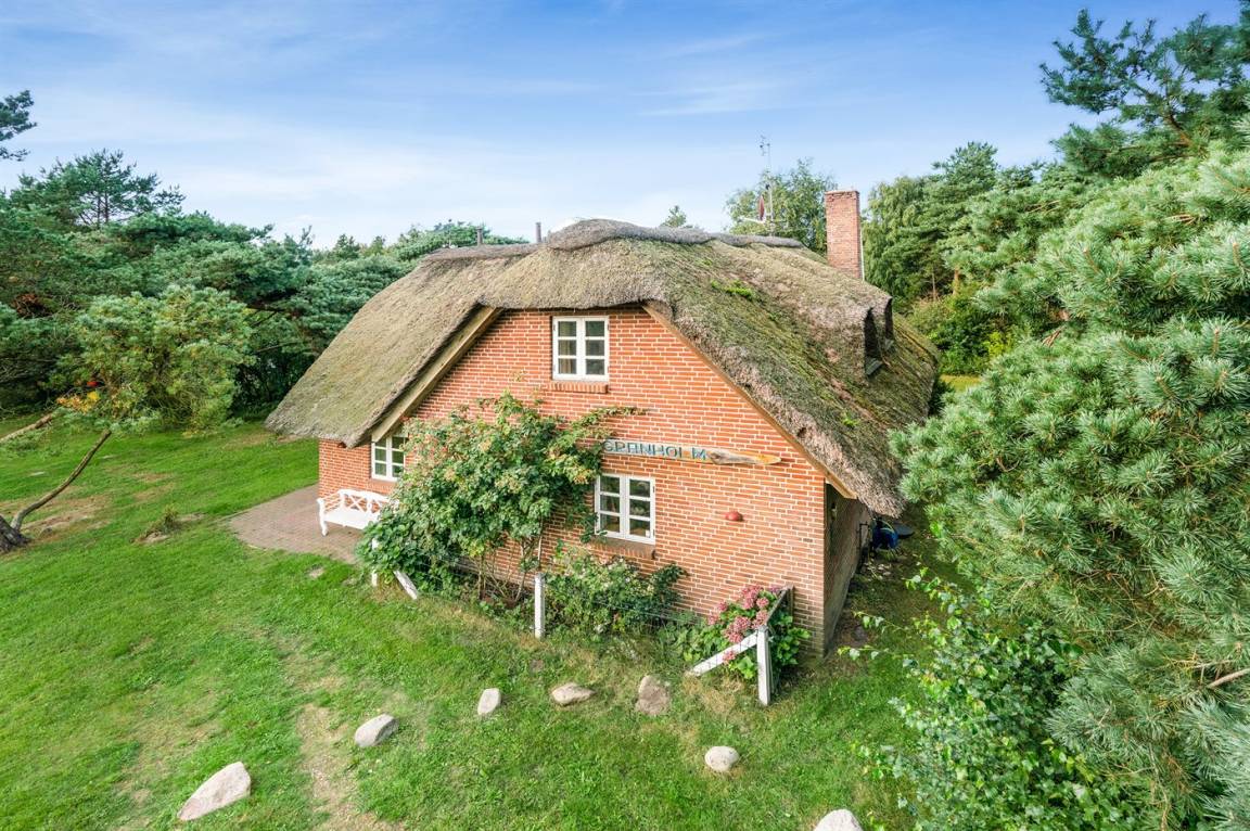 Dieses schöne Ferienhaus mit Reetdach liegt auf einem großen, mit Heidekraut bewachsenen Naturgrundstück mit Rasen dicht am Sønderstrand.