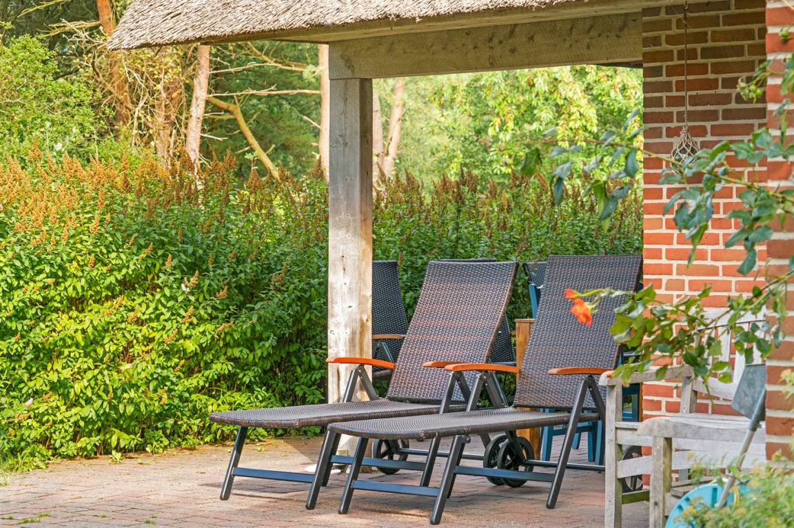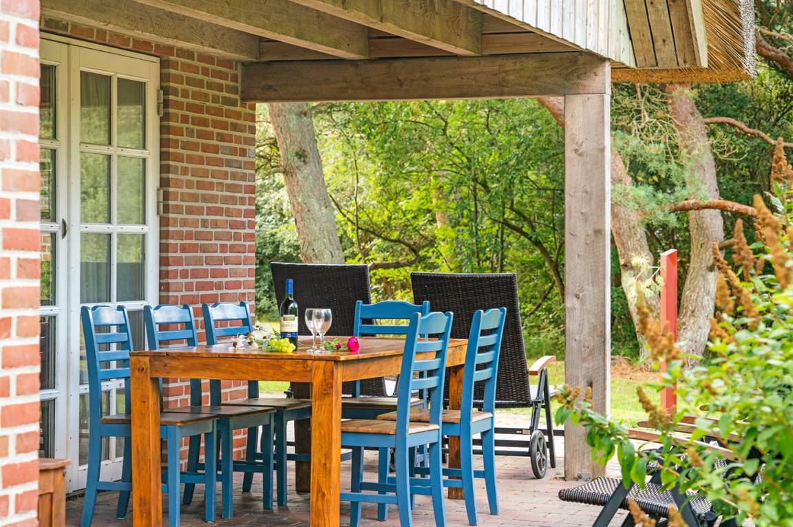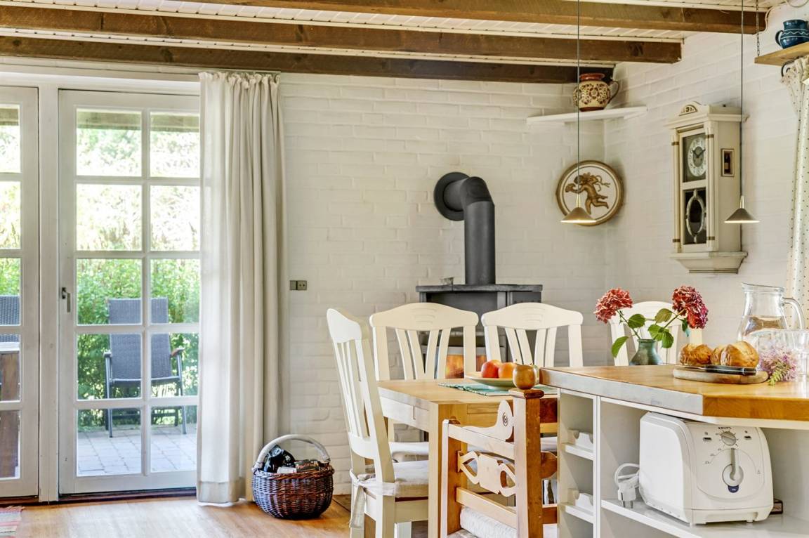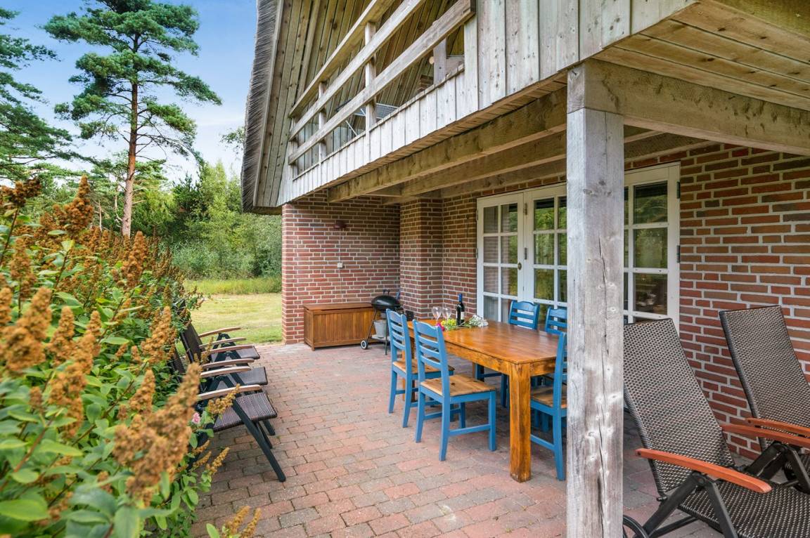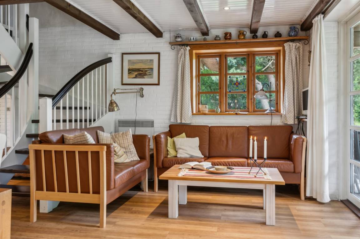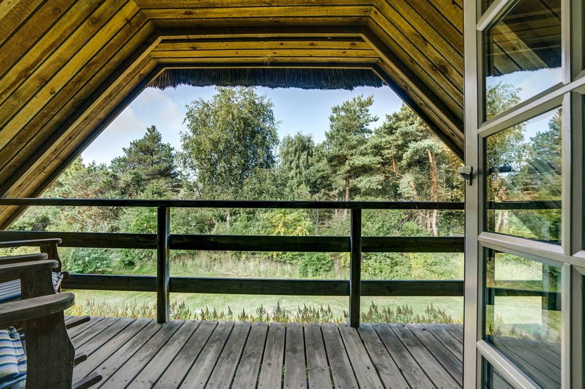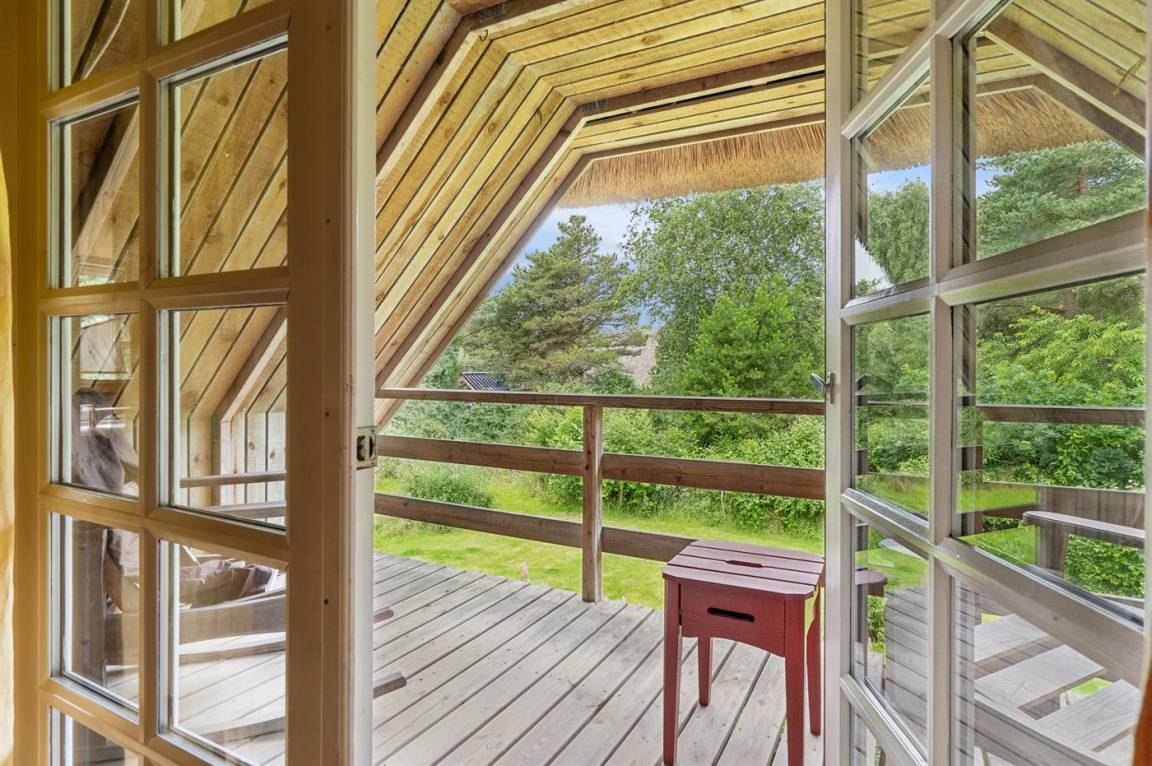 Dieses schöne Ferienhaus mit Reetdach liegt auf einem großen, mit Heidekraut bewachsenen Naturgrundstück mit Rasen dicht am Sønderstrand.