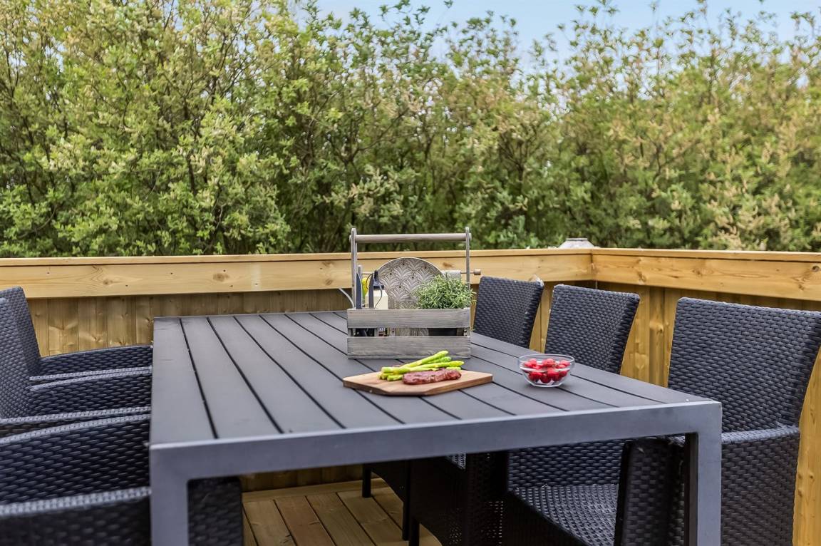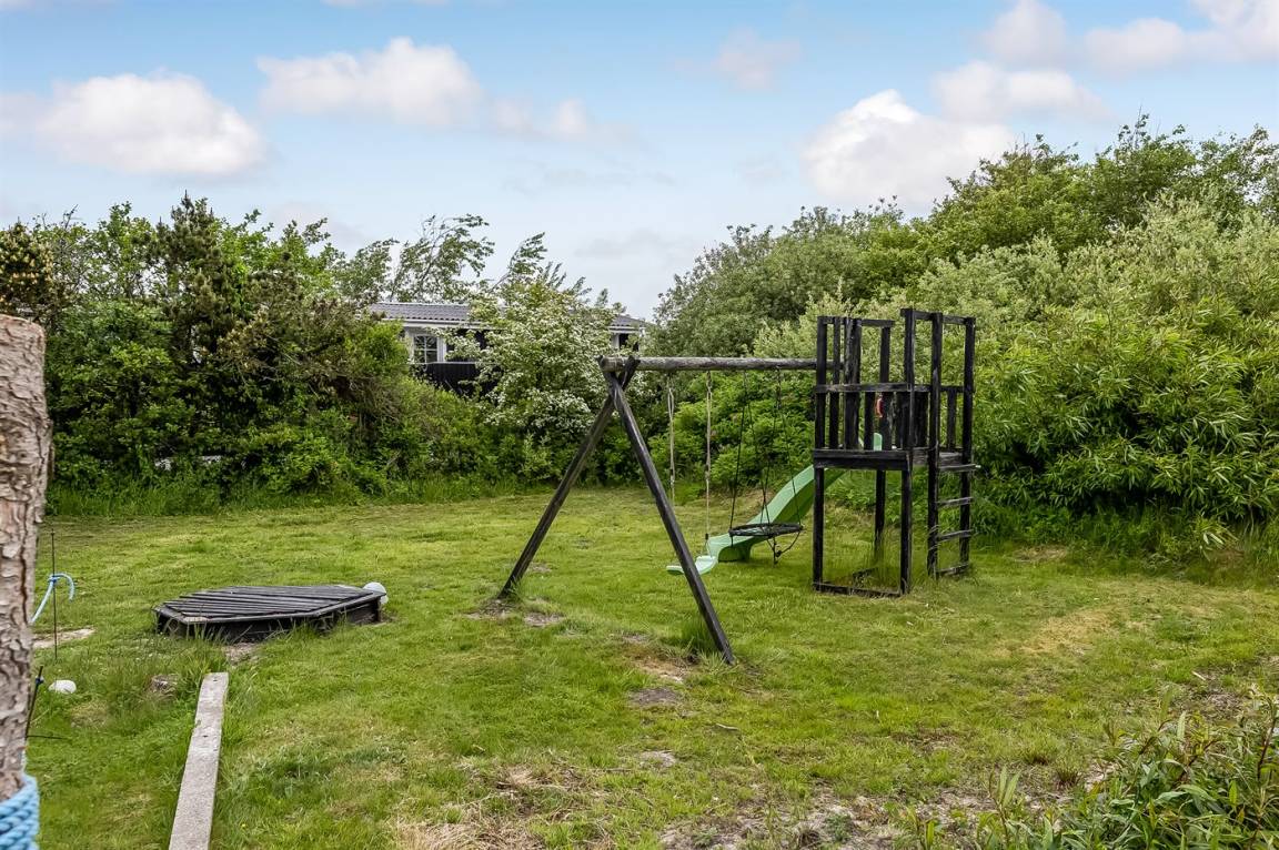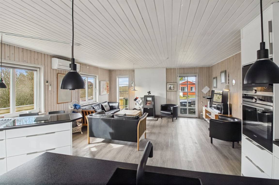 Ein schön und hell eingerichtetes Ferienhaus auf einem Grundstück mit Platz für Ballspiele und anders Aktivitäten im Freien.