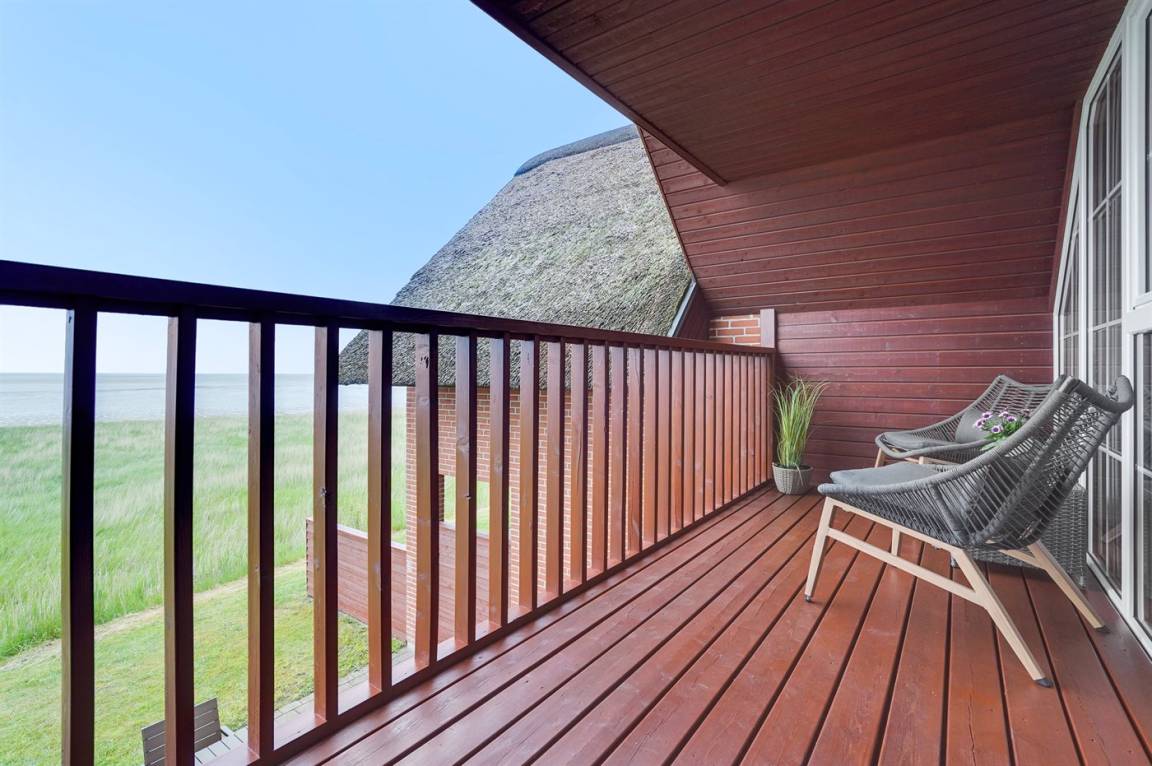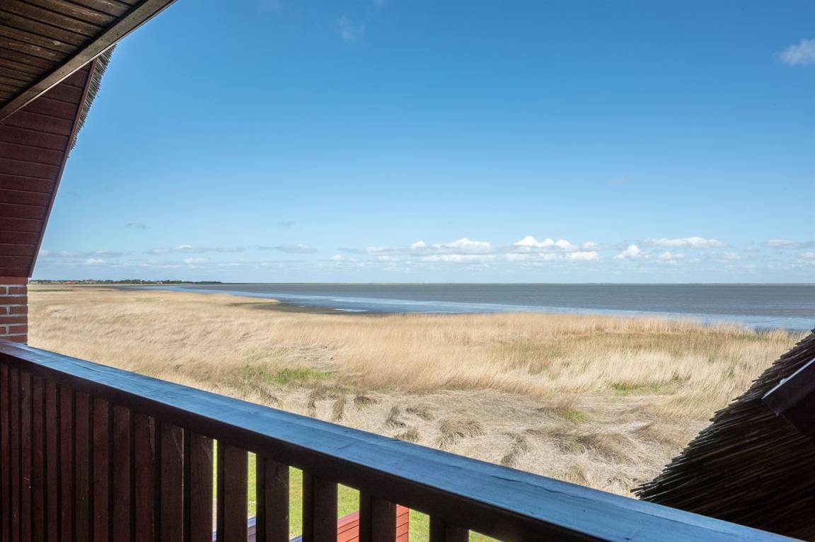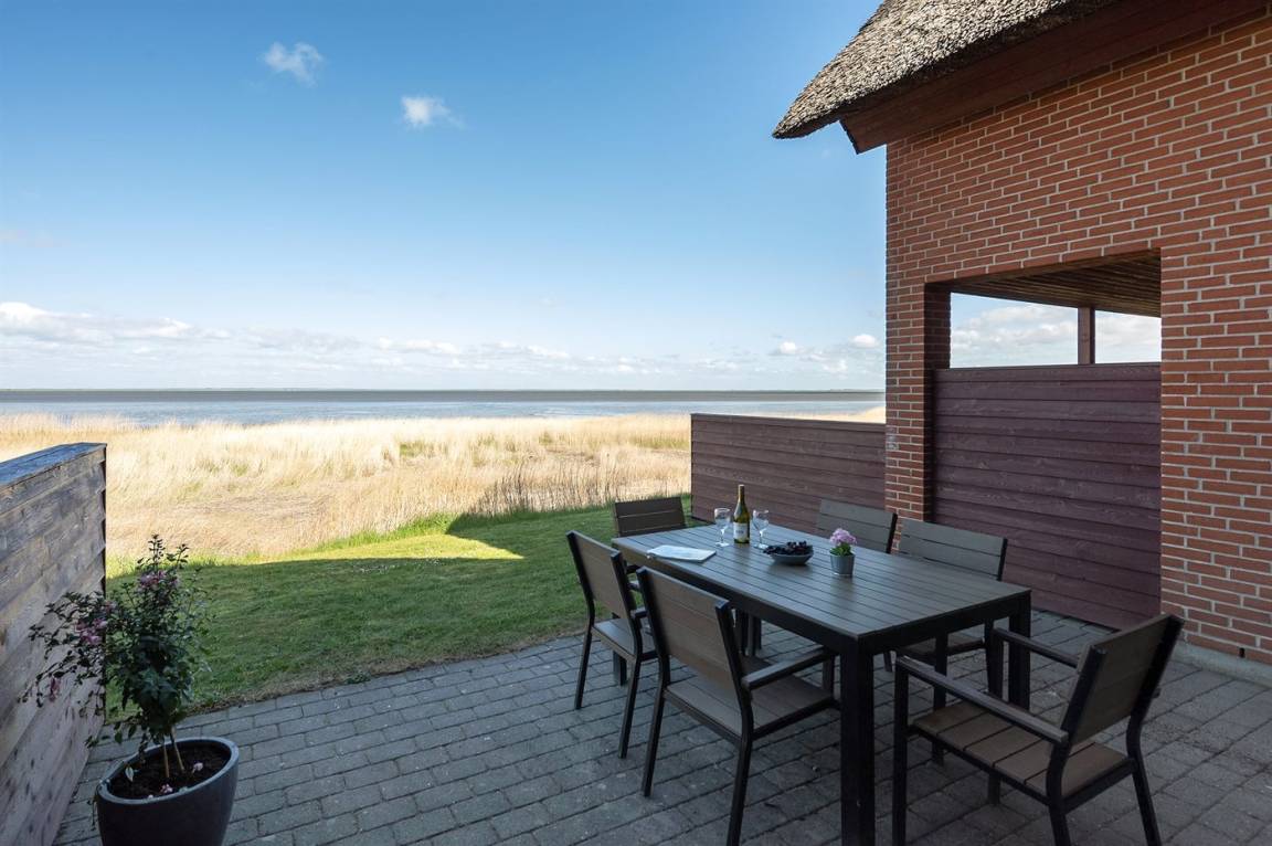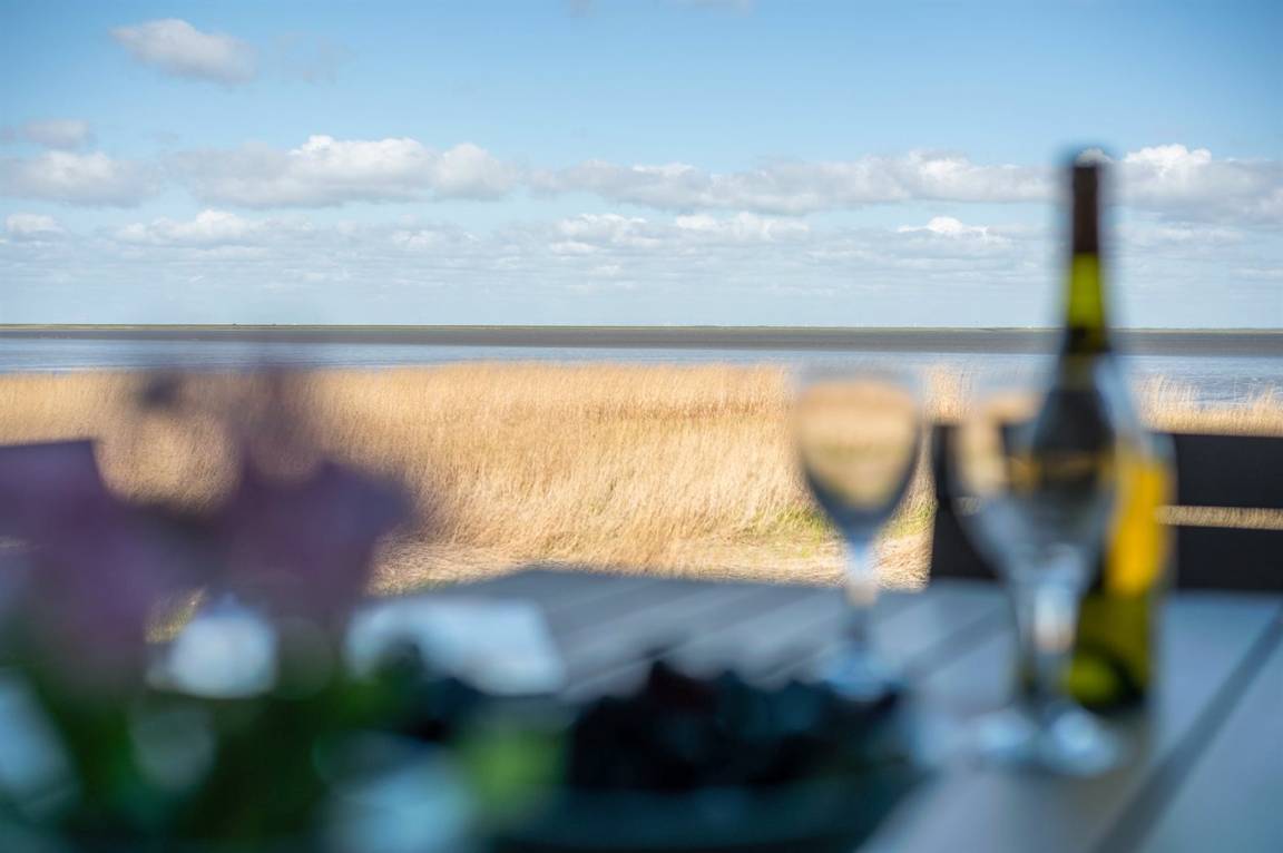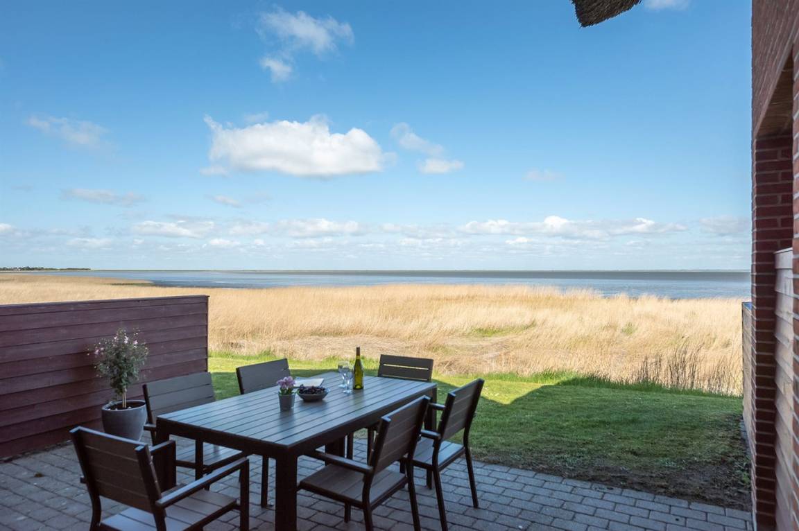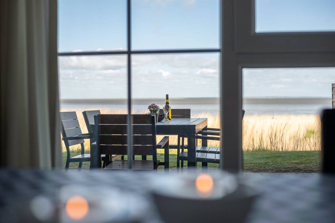 Schönes Reihenferienhaus mit Reetdach und Panoramablick auf das Wasser von Haus und Garten aus.