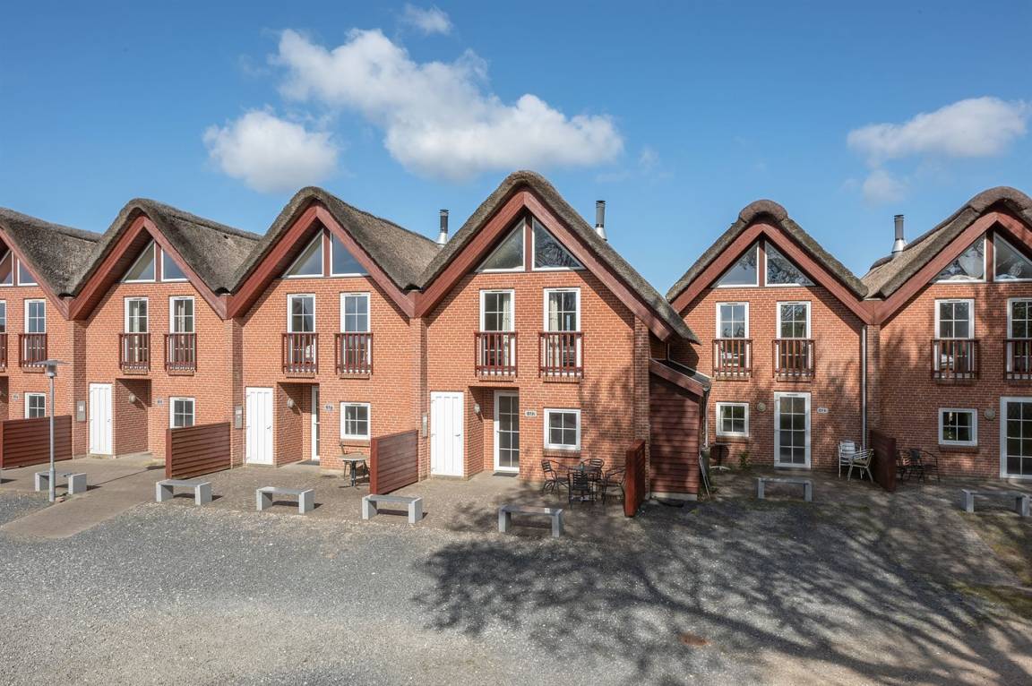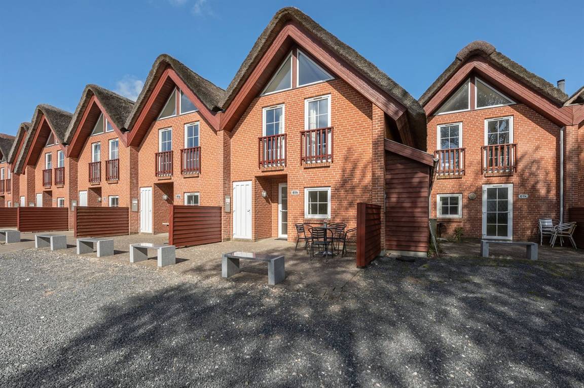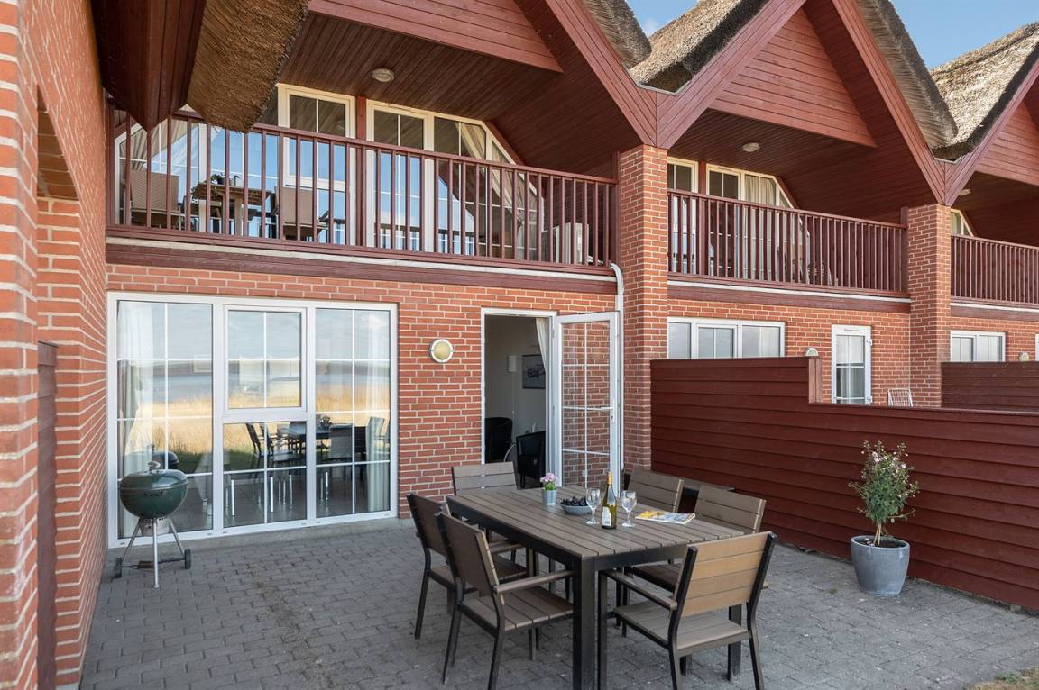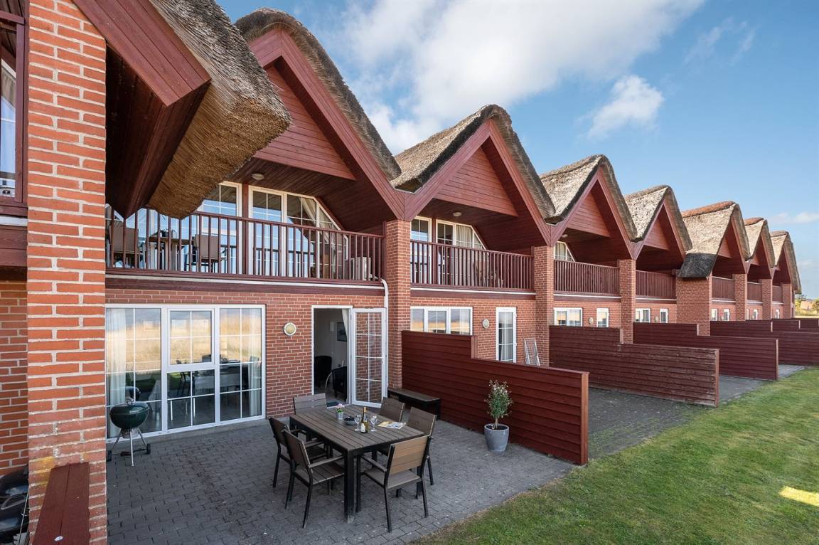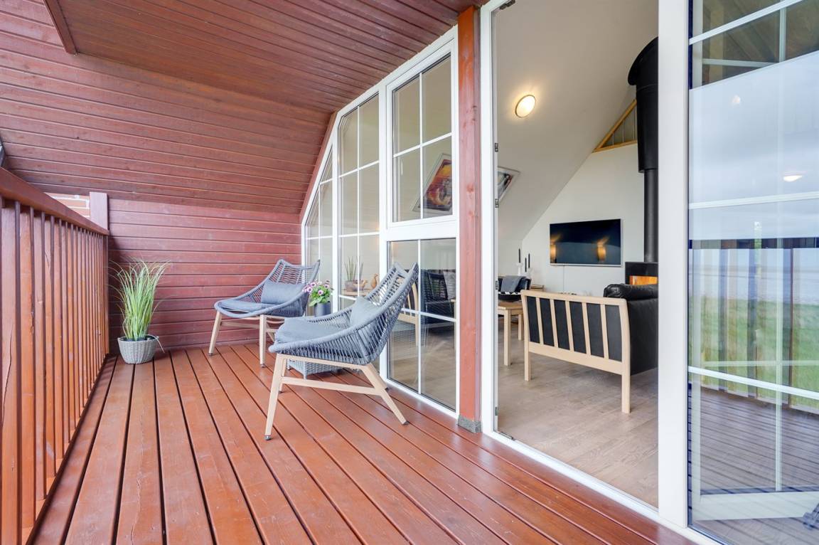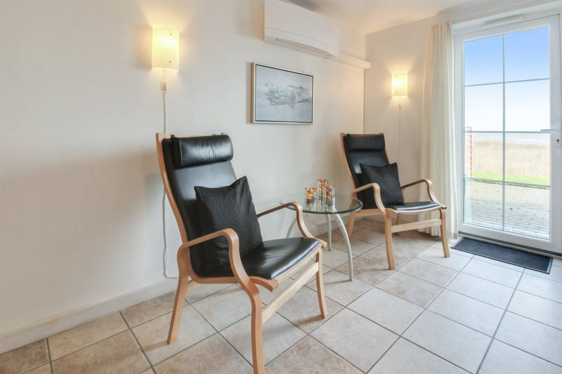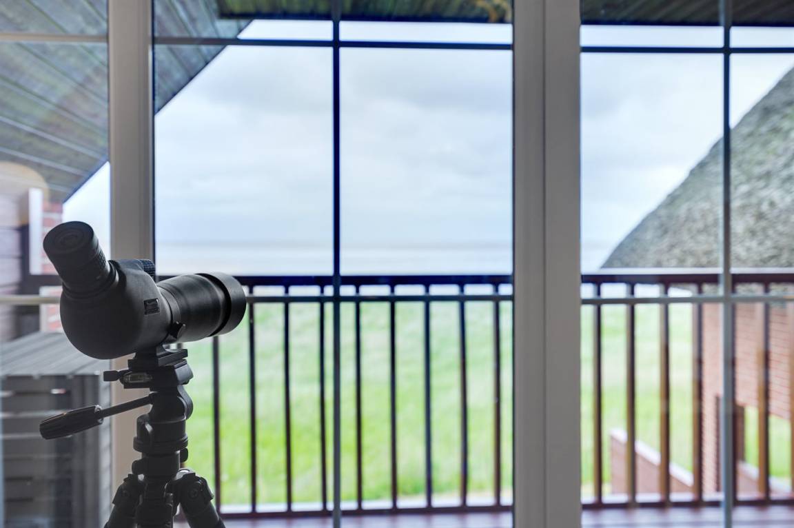 Schönes Reihenferienhaus mit Reetdach und Panoramablick auf das Wasser von Haus und Garten aus.