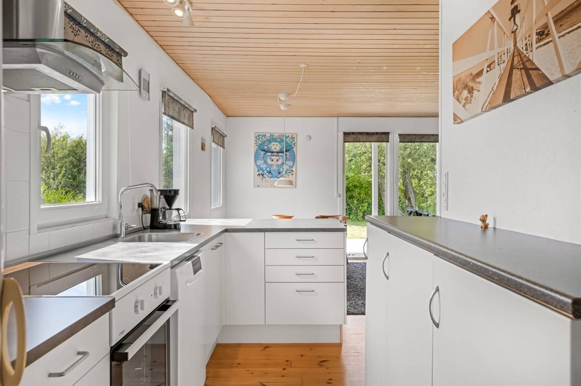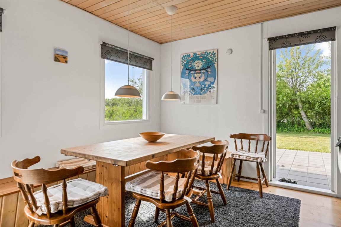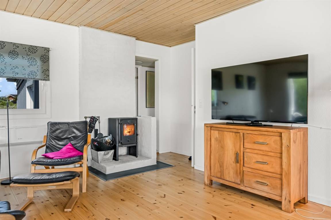 Innen ist das Haus nett eingerichtet. Schönes, helles Badezimmer mit Dusche und Fußbodenheizung. Die Küche liegt in Verbindung mit dem Wohnzimmer, und ist mit u. a. Geschirrspüler, Tiefkühlgerät und Mikrowelle ausgestattet. Helles, geschmackvoll eingerichtetes Wohnzimmer mit u. a. Kaminofen und TV mit Satellitenanschluss. Die Schlafplätze verteilen sich auf 3 nette Schlafzimmer; 2 mit Doppelbett und 1 mit 2 Einzelbetten.