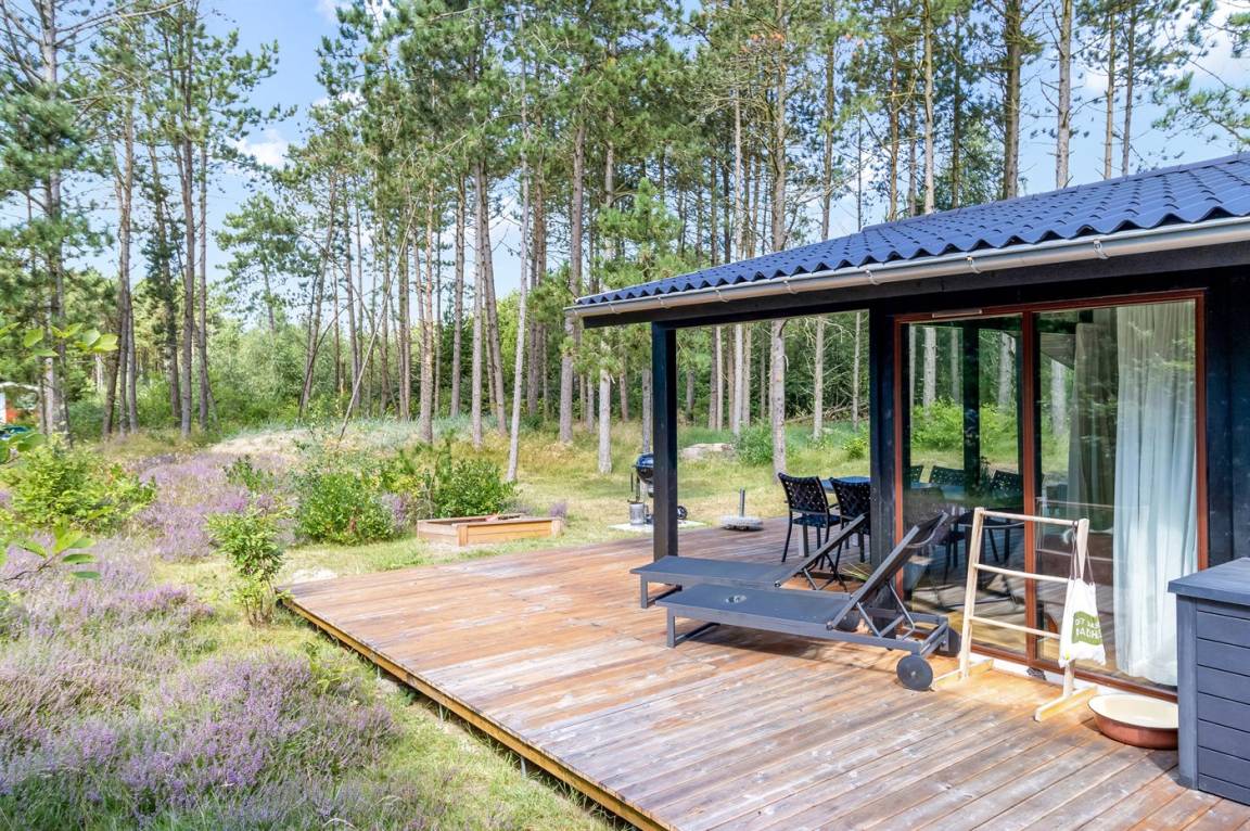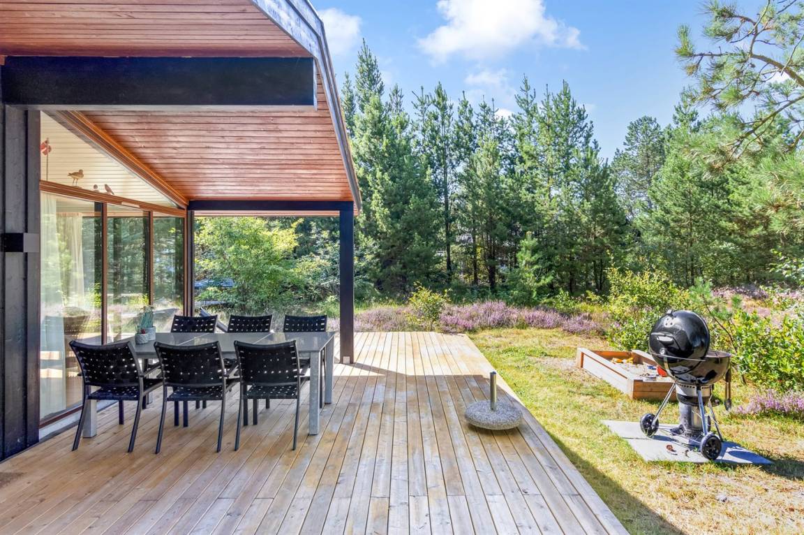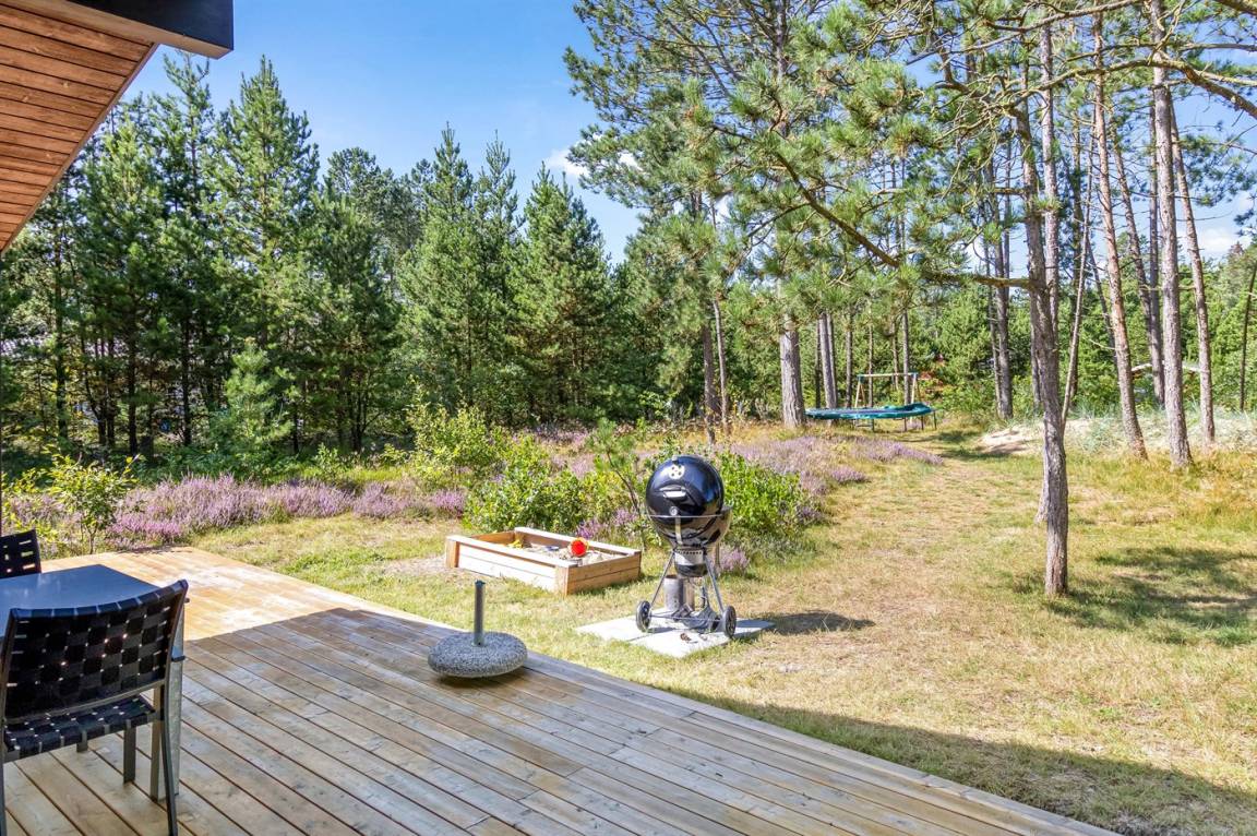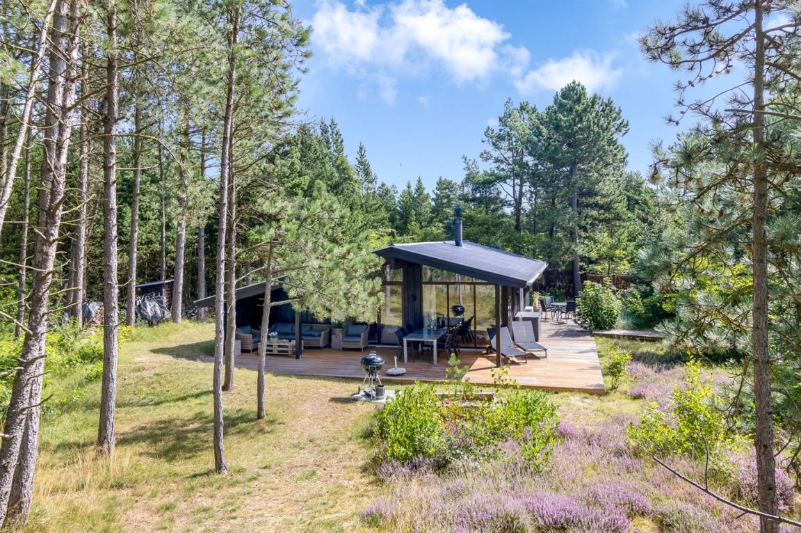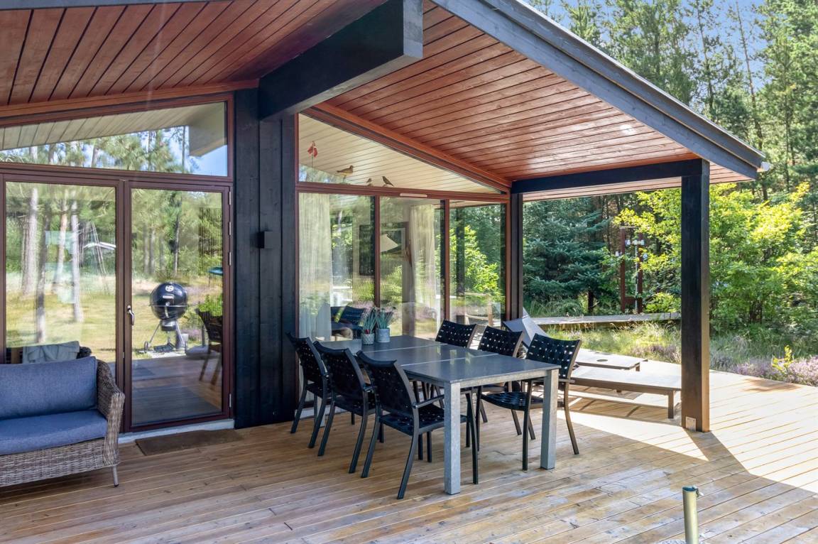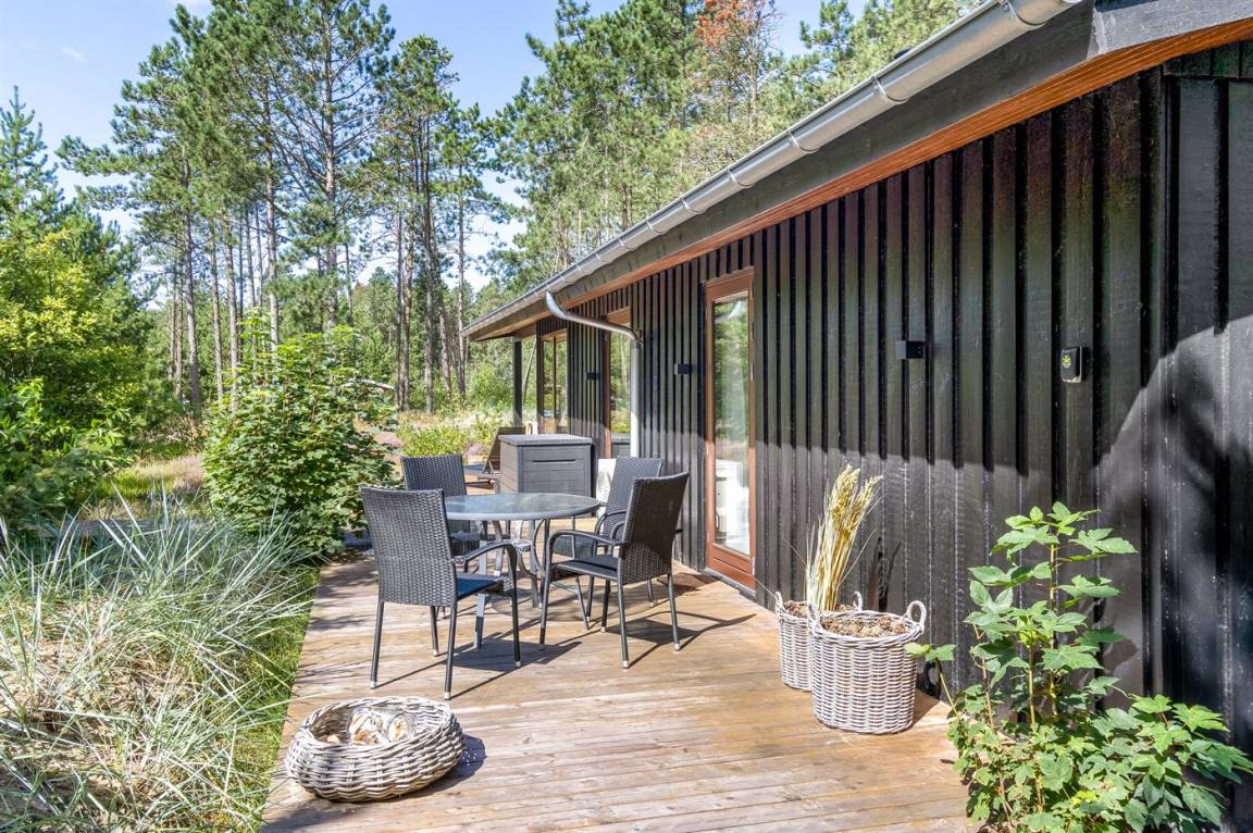 Dieses fantastische Ferienhaus liegt auf einem wunderschönen, großen Naturgrundstück mit vielen hohen Bäumen und verfügt über eine schöne 60 m² große Terrassenfläche, auf der man sich bei jedem Wetter entspannen kann. Hier genießt man einfach nur die Ruhe und ab und an das Rauschen des Meeres.
