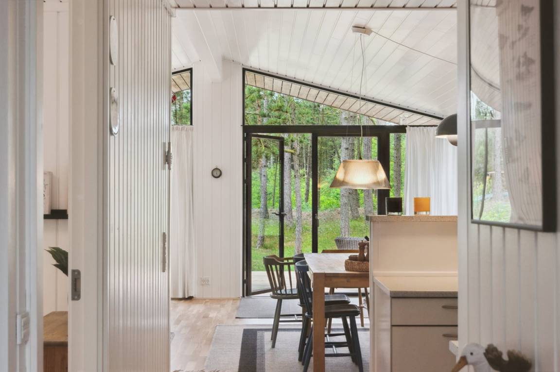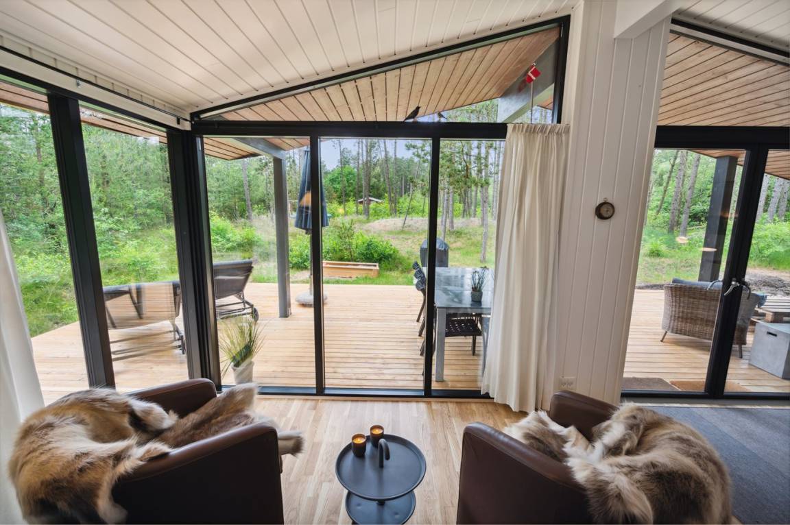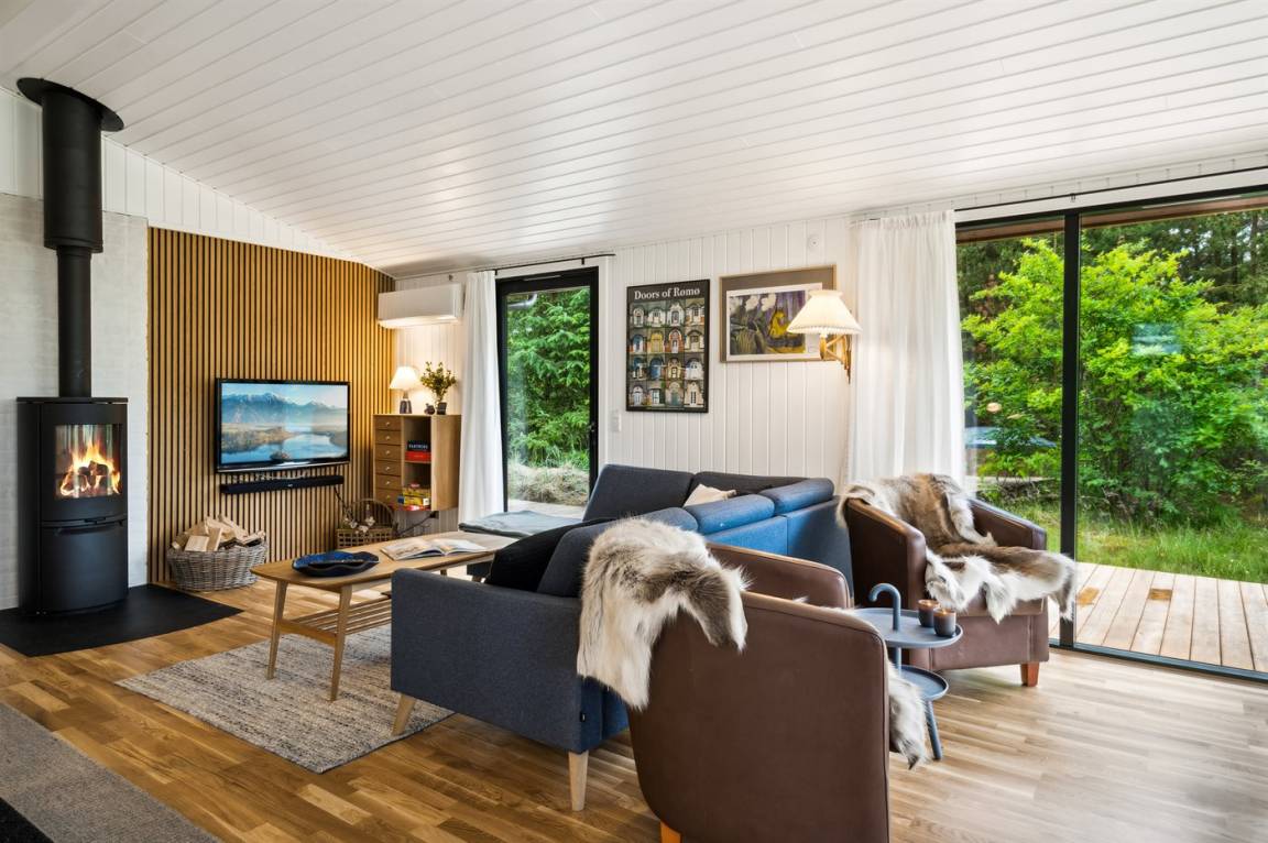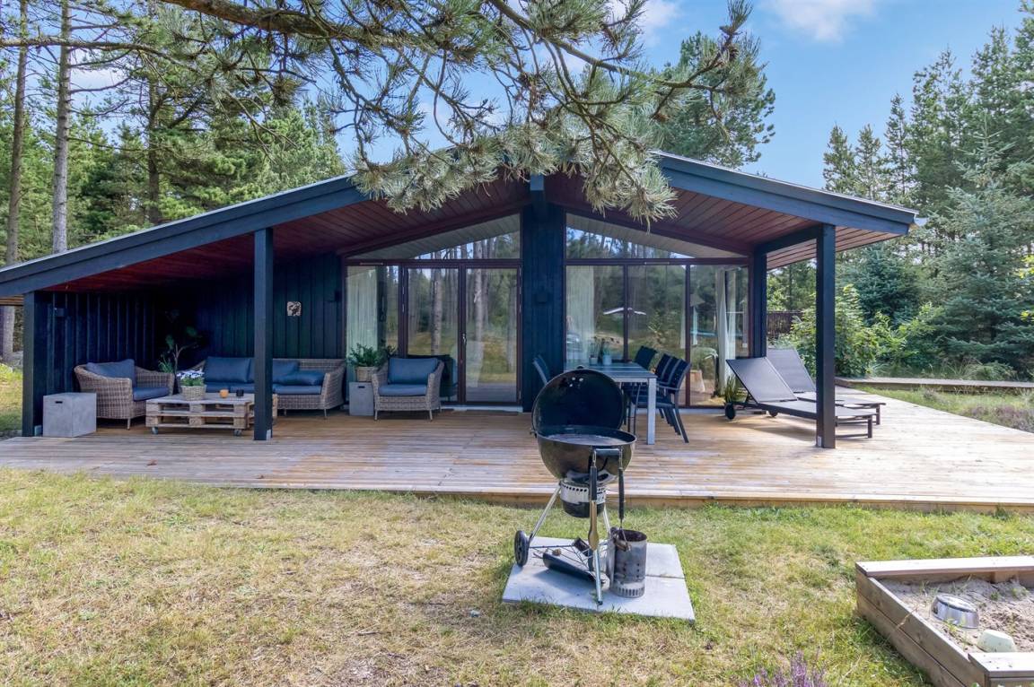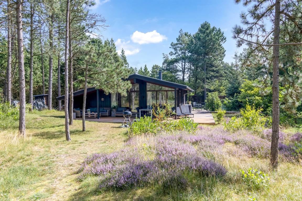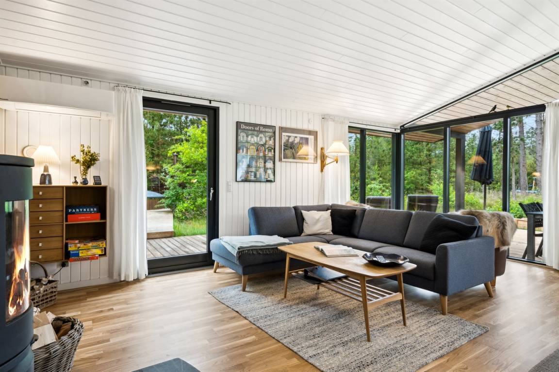 Dieses fantastische Ferienhaus liegt auf einem wunderschönen, großen Naturgrundstück mit vielen hohen Bäumen und verfügt über eine schöne 60 m² große Terrassenfläche, auf der man sich bei jedem Wetter entspannen kann. Hier genießt man einfach nur die Ruhe und ab und an das Rauschen des Meeres.