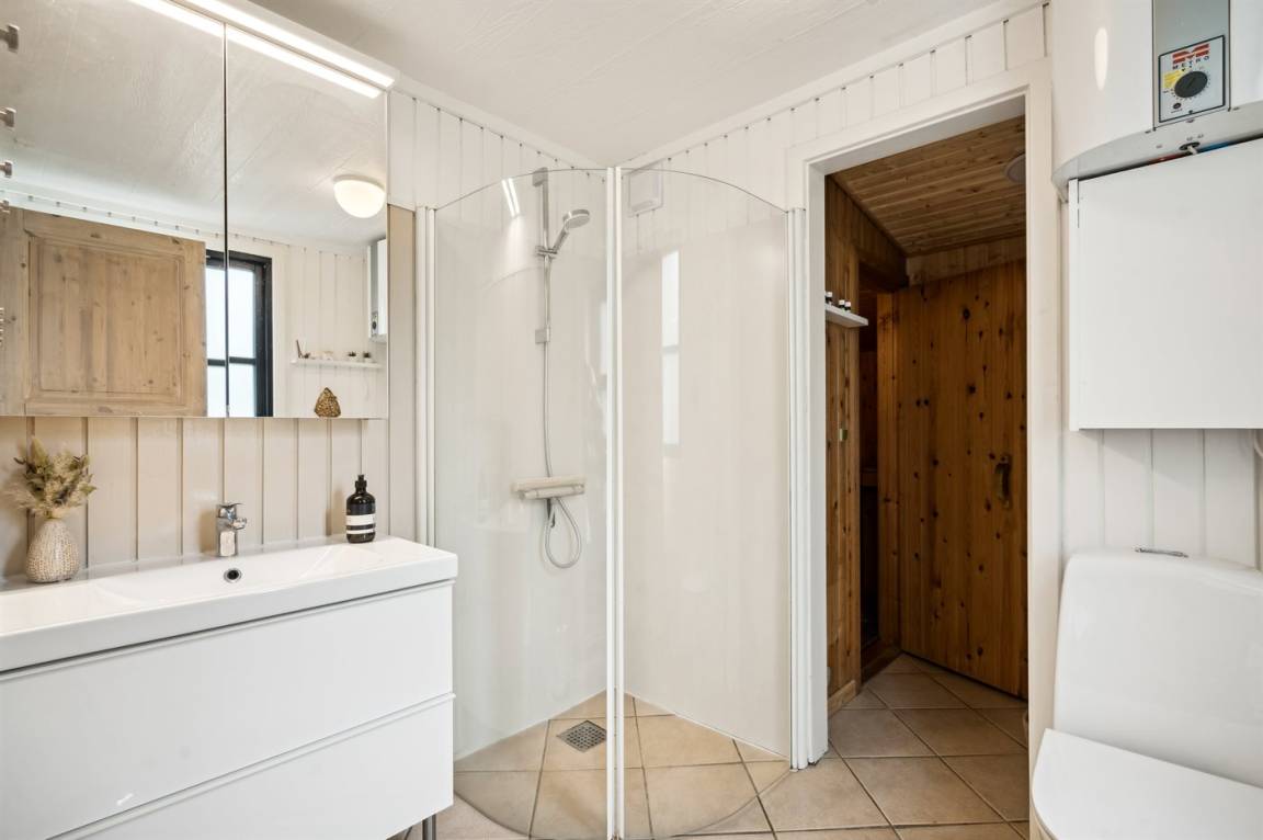 Das Ferienhaus verfügt über ein schönes großes Badezimmer mit Duschnische. Vom Badezimmer aus gelangt man in die Sauna des Hauses. Hier kann man sich bei verschiedenen Saunadüften und wohltuenden ätherischen Ölen entspannen. Es steht außerdem eine Waschmaschine zur Verfügung.
