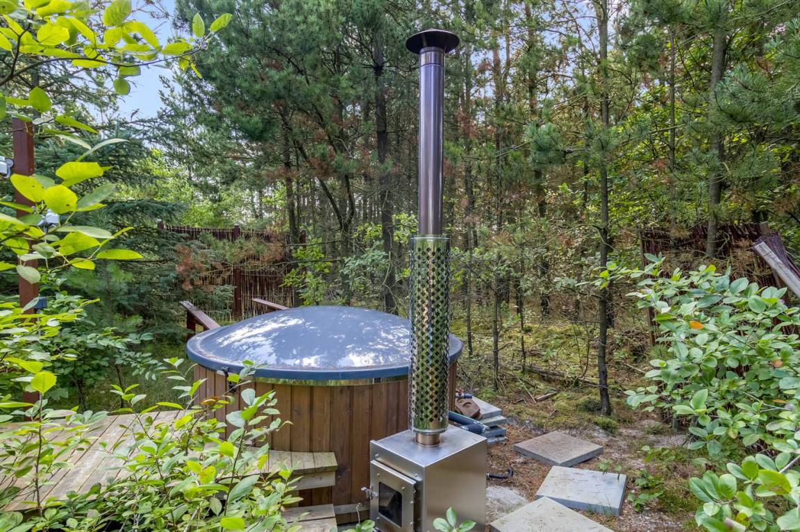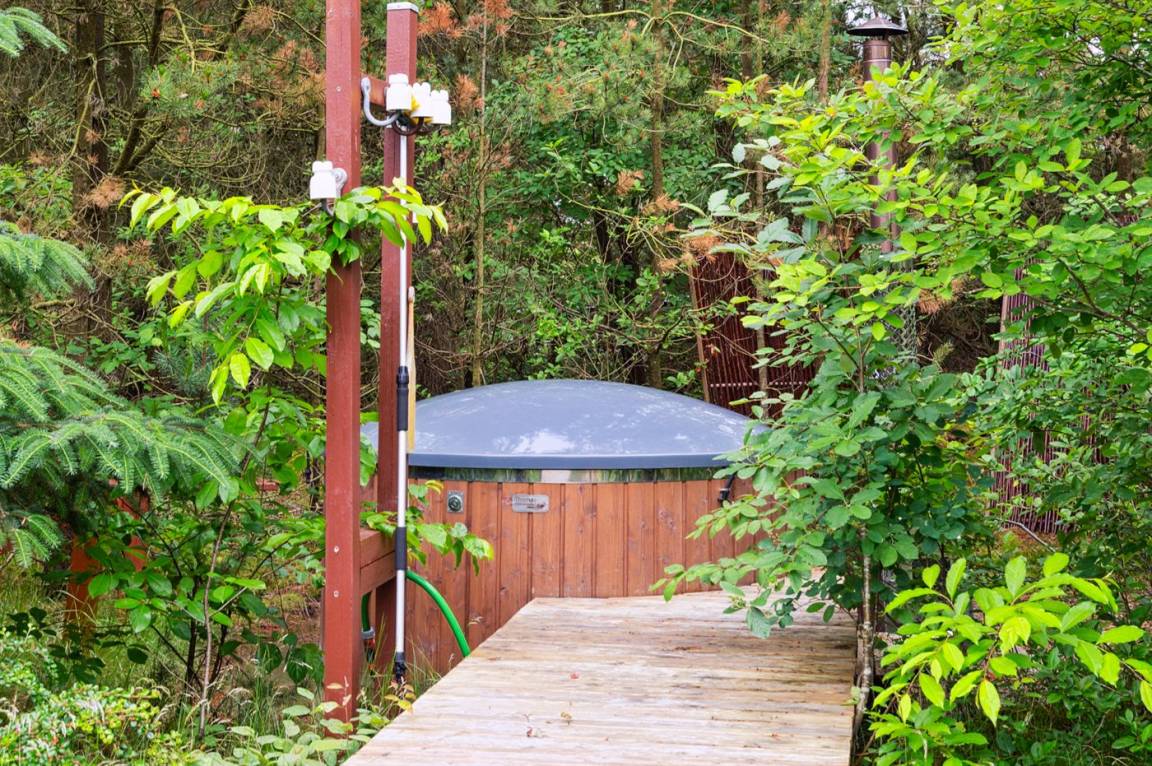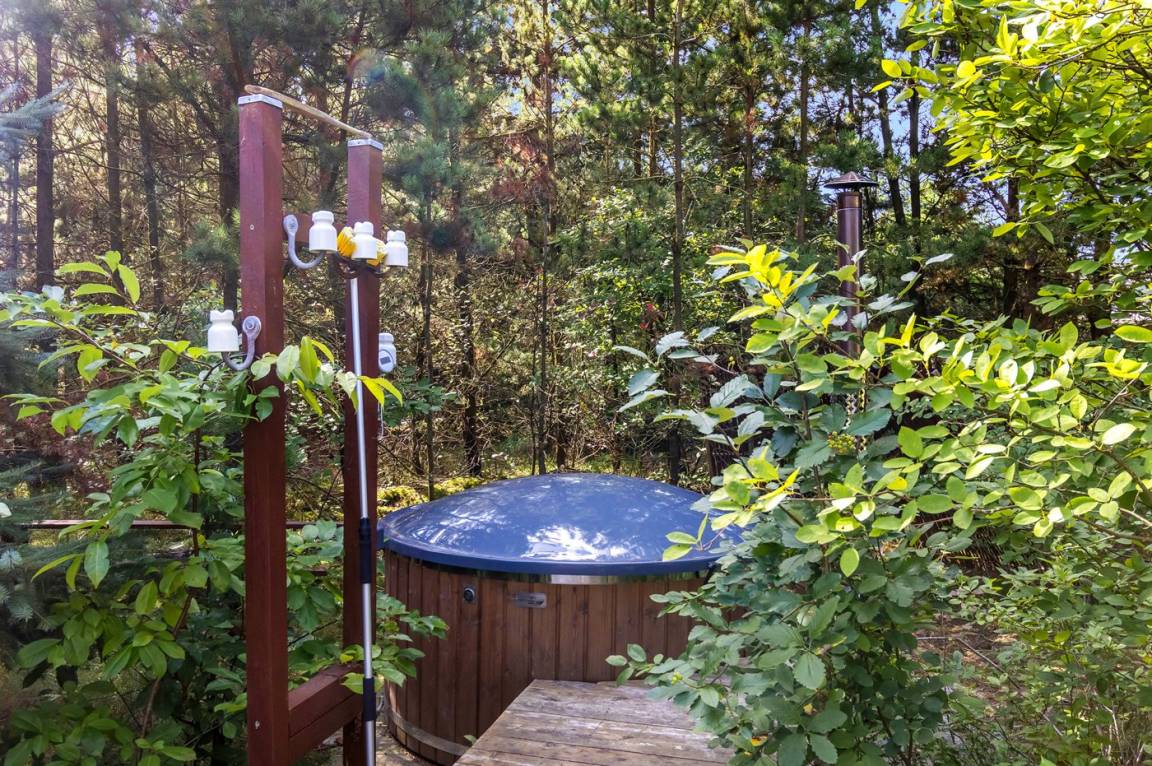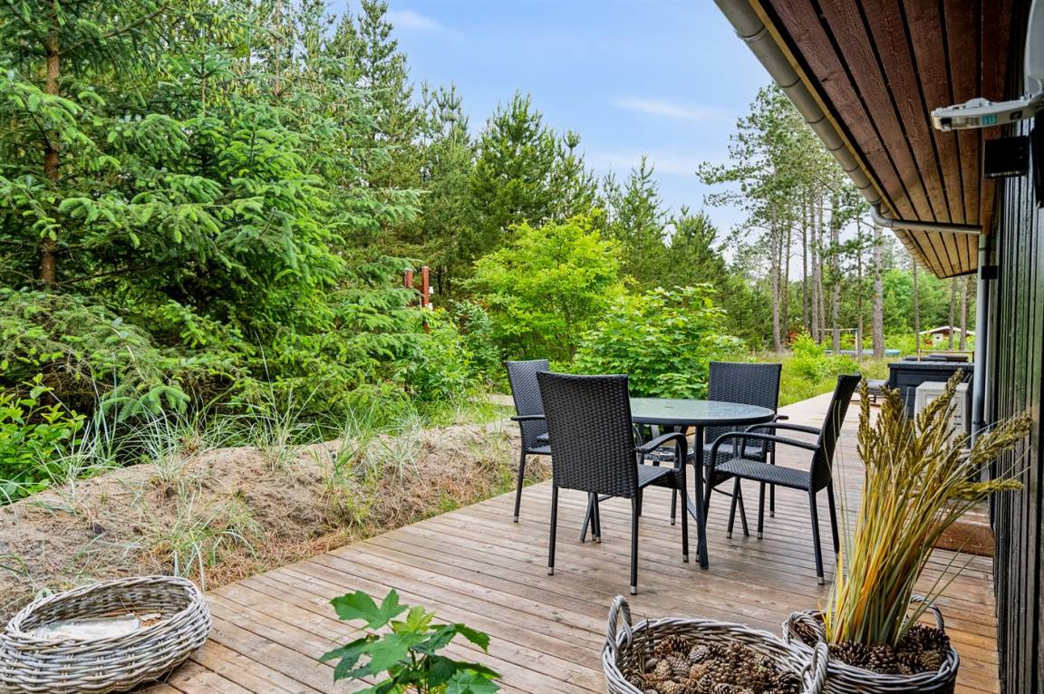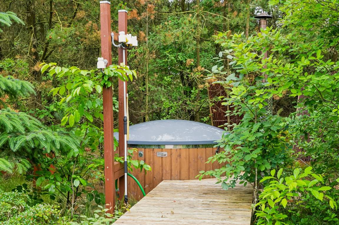 Zum Ferienhaus gehört eine große, teilweise überdachte und in Richtung Westen ausgerichtete Terrassenfläche mit einer Couchgarnitur. Diese Terrasse fügt sich an die in südlicher Richtung ausgerichteten Terrasse an, auf der man die Morgensonne genießen kann. Auf die große Südterrasse gelangt man über das Schlafzimmer und dem Wohnzimmer. Es besteht die Möglichkeit den Grill zu benutzen. Außerdem stehen eine Außen-Dusche und ein Hot-Tub (1.100 l) zur Verfügung, in dem man ungestört die Ruhe genießen und sich völlig Entspannen kann.