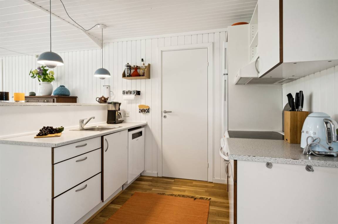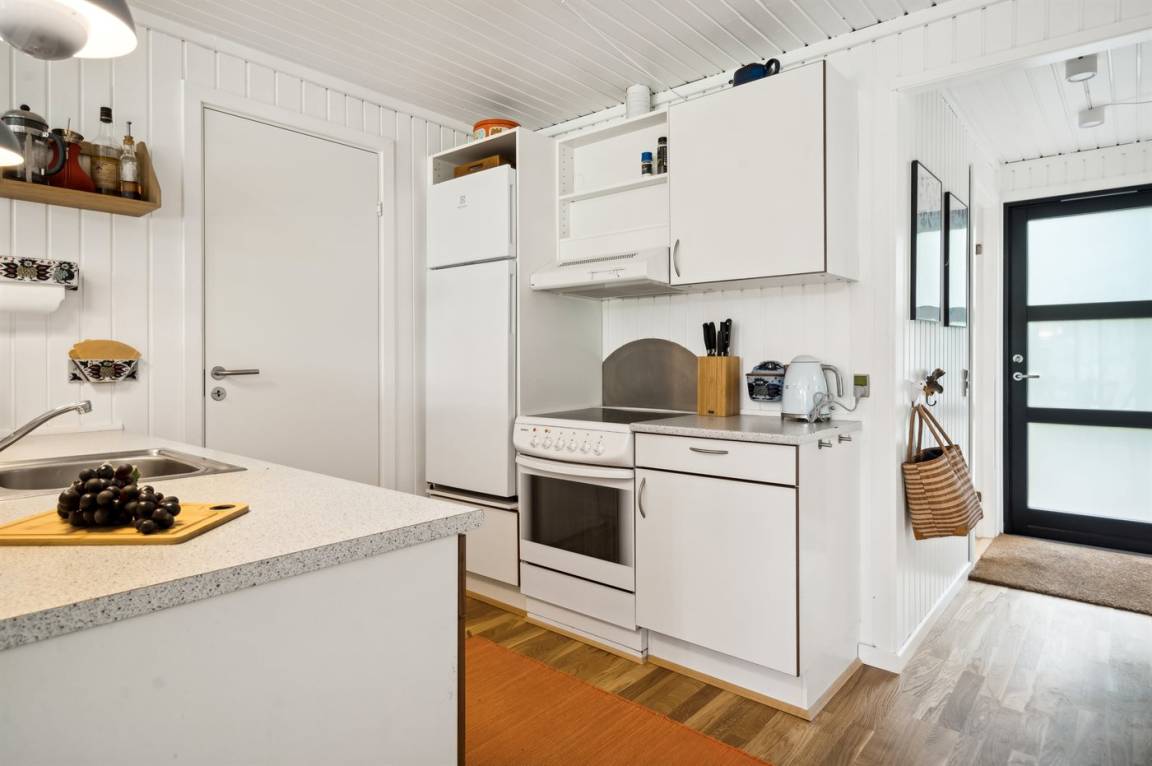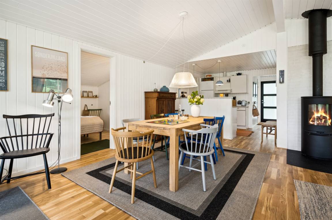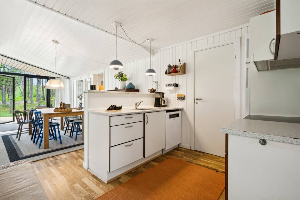 Das Ferienhaus verfügt über eine schöne Wohnküche, die zum großen Wohnbereich gehört. Die Küche ist mit einer Geschirrspülmaschine, einem Herd mit Keramikkochplatten, einem Backofen sowie einem Kühlschrank mit integriertem Kühlfach mit 40 L Nutzinhalt ausgestattet.