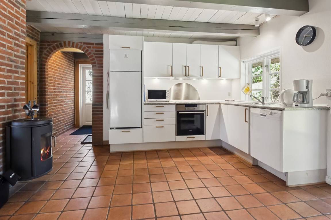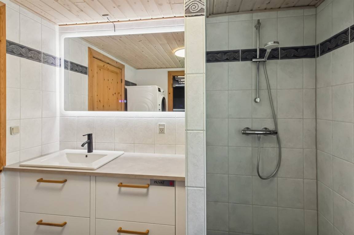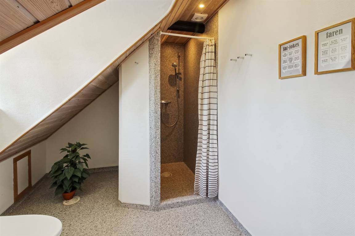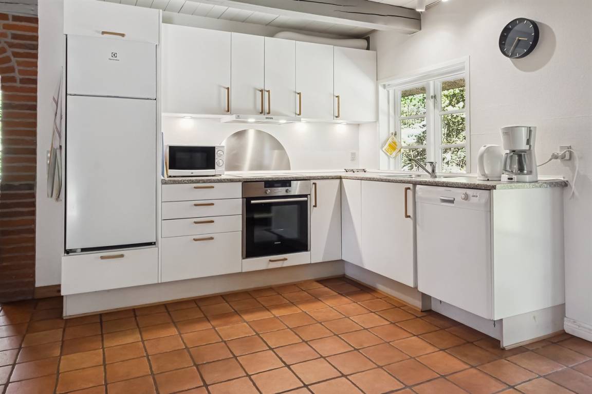 Das Ferienhaus hat 2 Badezimmer mit Duschnische; 1 in jedem Geschoss. Im Badezimmer im Erdgeschoss gibt es weiter Fußbodenheizung und direkten Zutritt zur Sauna. Die hübsche Küche ist mit dem Wohnzimmer kombiniert und enthält Tiefkühlgerät, Mikrowelle und Geschirrspüler.