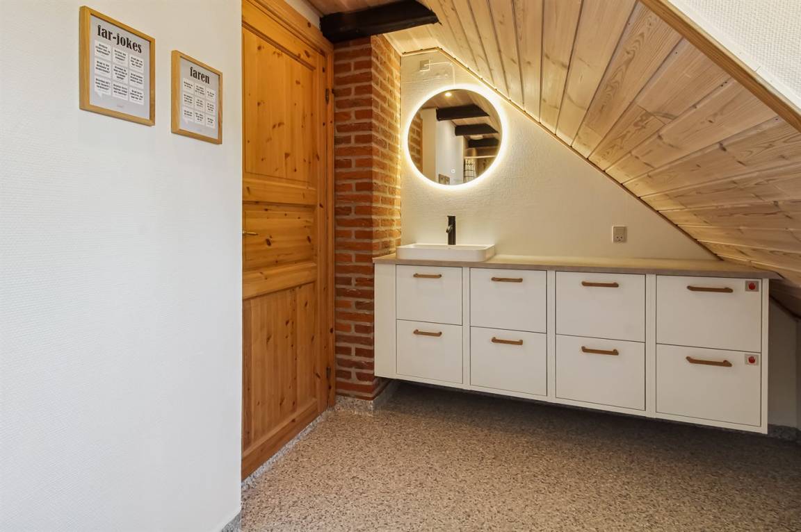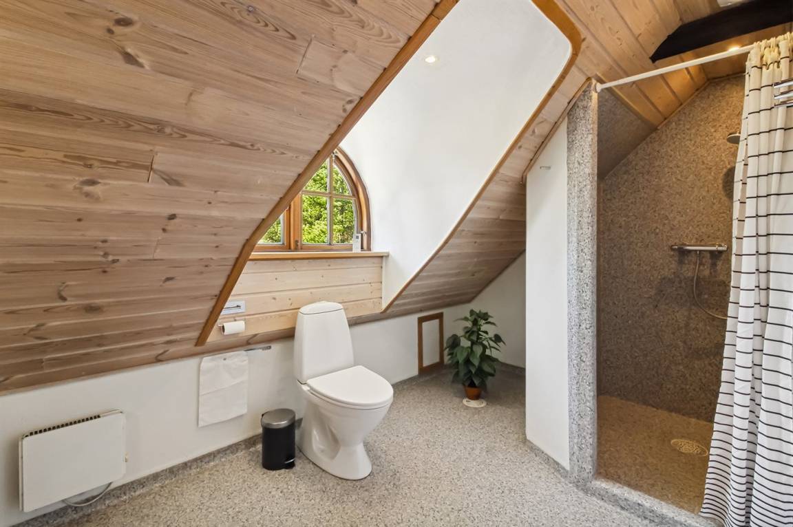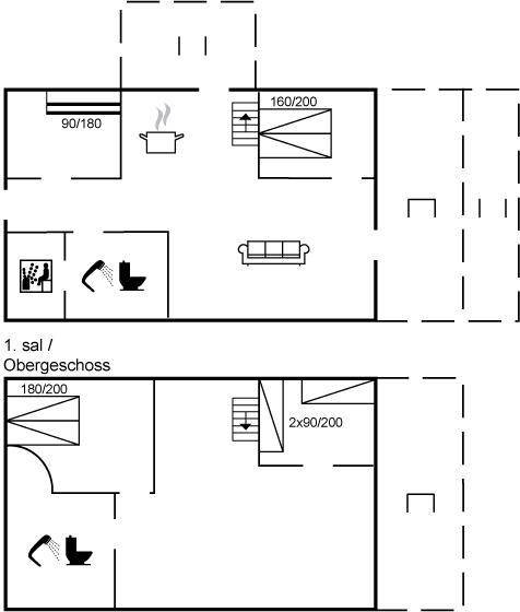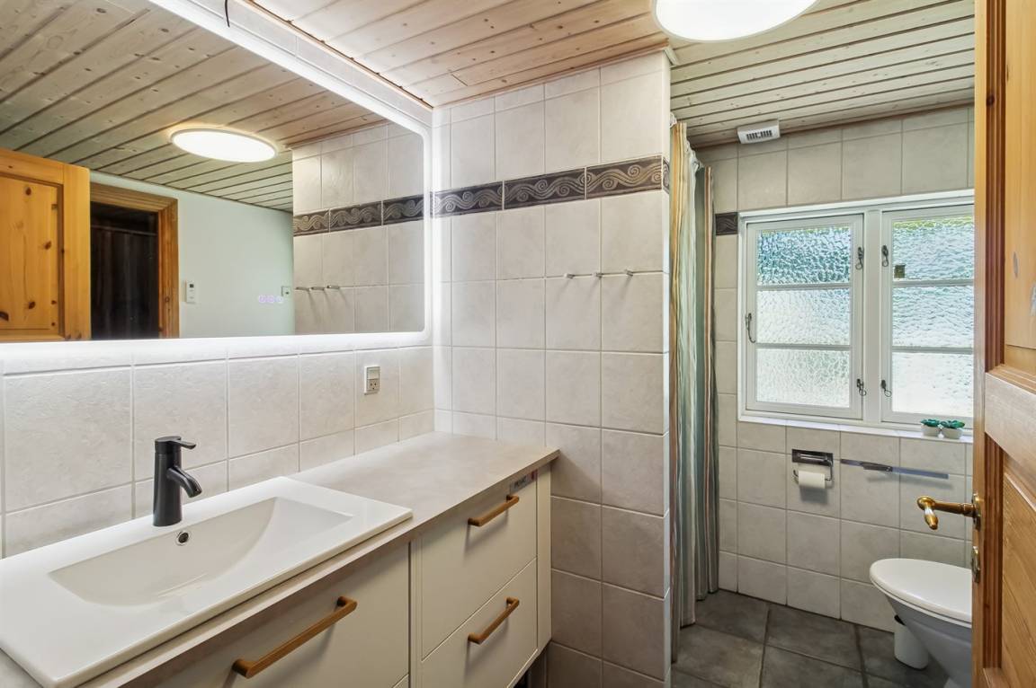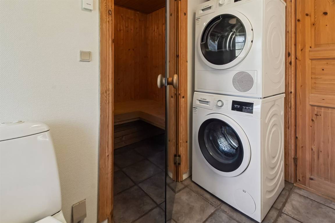 Das Ferienhaus hat 2 Badezimmer mit Duschnische; 1 in jedem Geschoss. Im Badezimmer im Erdgeschoss gibt es weiter Fußbodenheizung und direkten Zutritt zur Sauna. Die hübsche Küche ist mit dem Wohnzimmer kombiniert und enthält Tiefkühlgerät, Mikrowelle und Geschirrspüler.