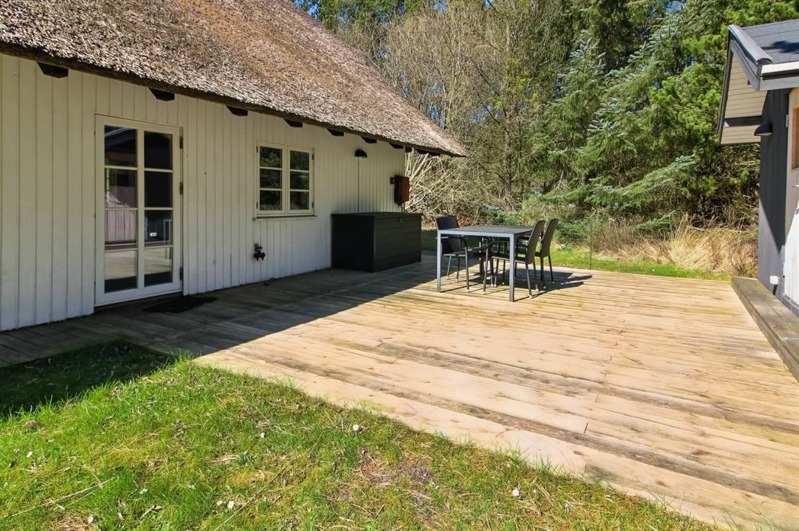Dieses hübsche Ferienhaus aus Holz mit Reetdach, 2002 total renoviert, liegt auf einem schönen Naturgrundstück, das von Bäumen umzäunt ist. Von der teils überdachte Terrasse kann man die ruhige Natur genießen.