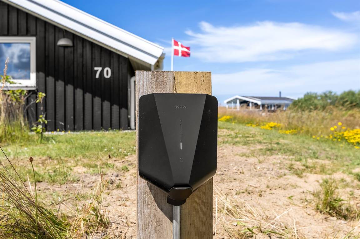 Es ist ein Ladestecker für Elektroautos installiert. Parkplatz auf dem Grundstück.