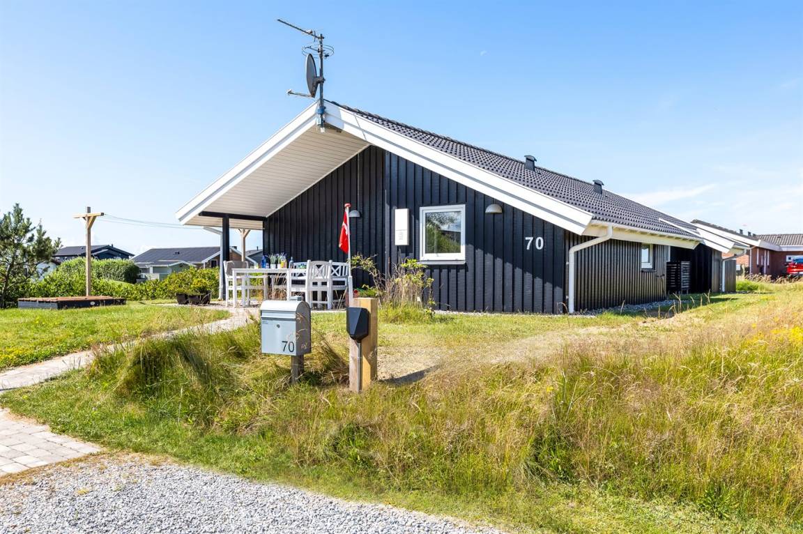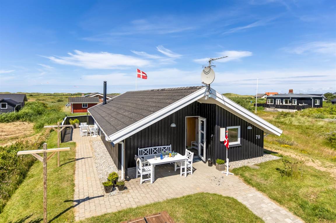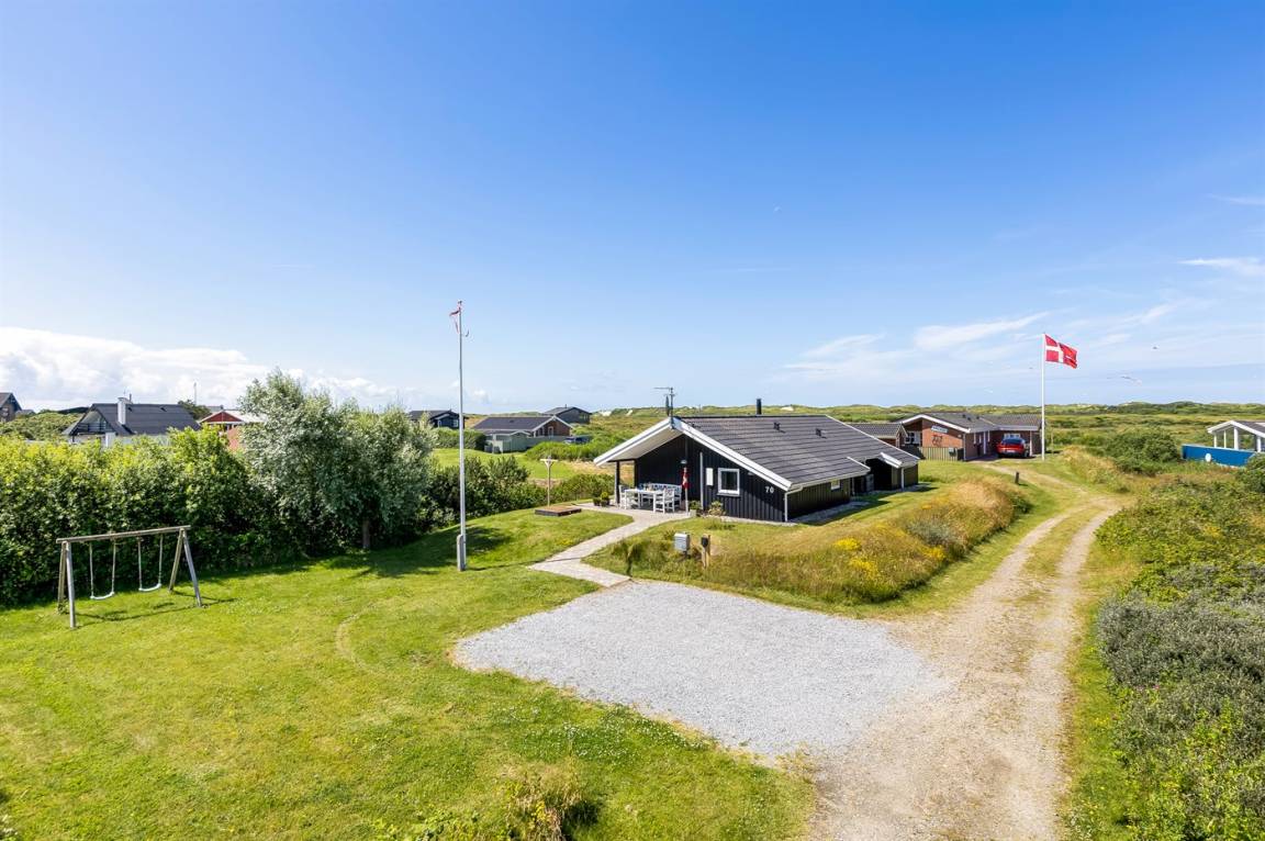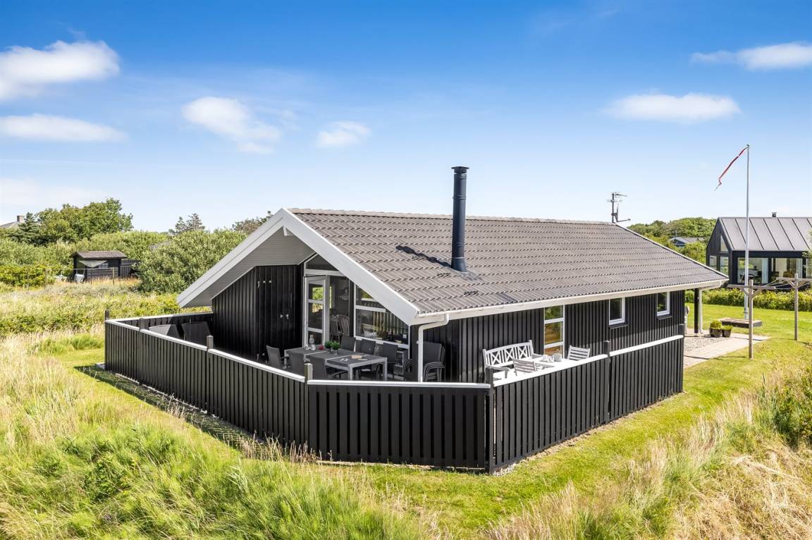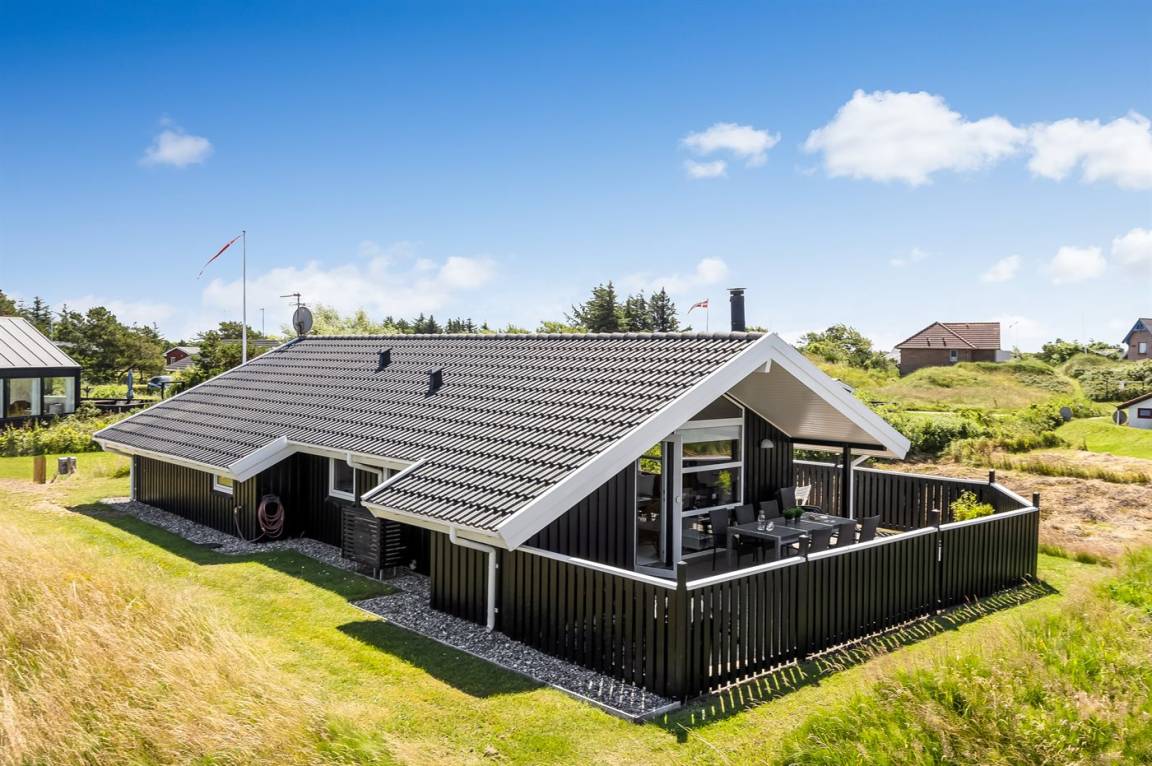 Ein gemütliches und gut ausgestattetes, schönes Holzferienhaus mit Whirlpool und Sauna. Das Haus, 1998 gebaut und 2015 modernisiert, liegt auf einem kinderfreundlichen Naturgrundstück in der zweiten Dünenreihe - in der Nähe vom Strand und mit einem herrlichen Blick über die Dünen und Lakolk. Es gibt die Möglichkeit, direkt über kleine Pfade zum Strand zu spazieren.