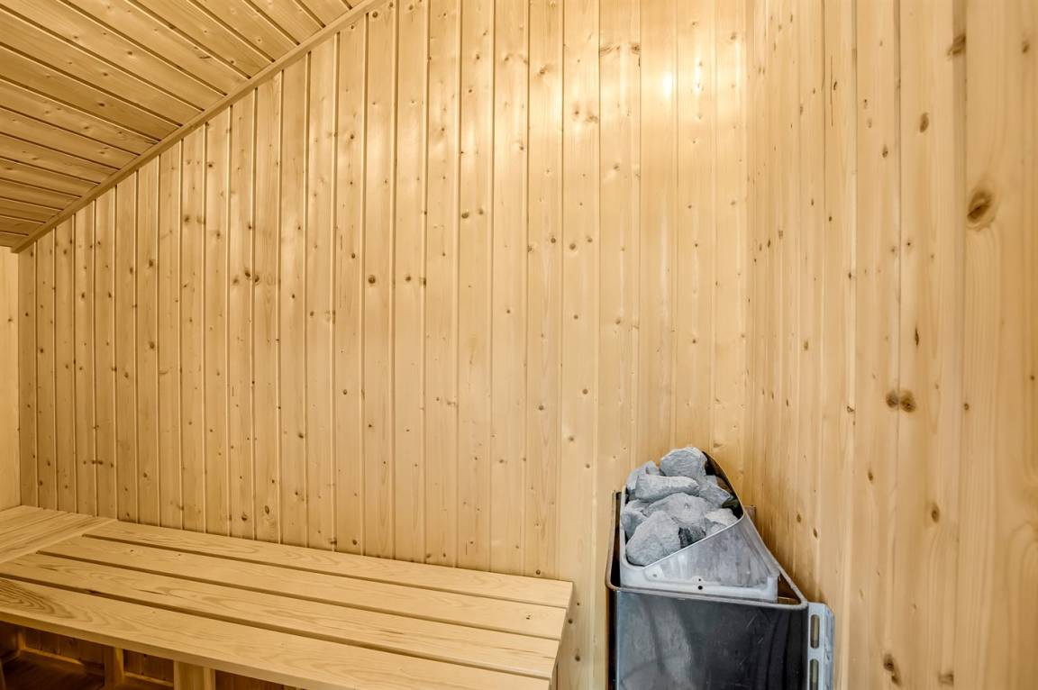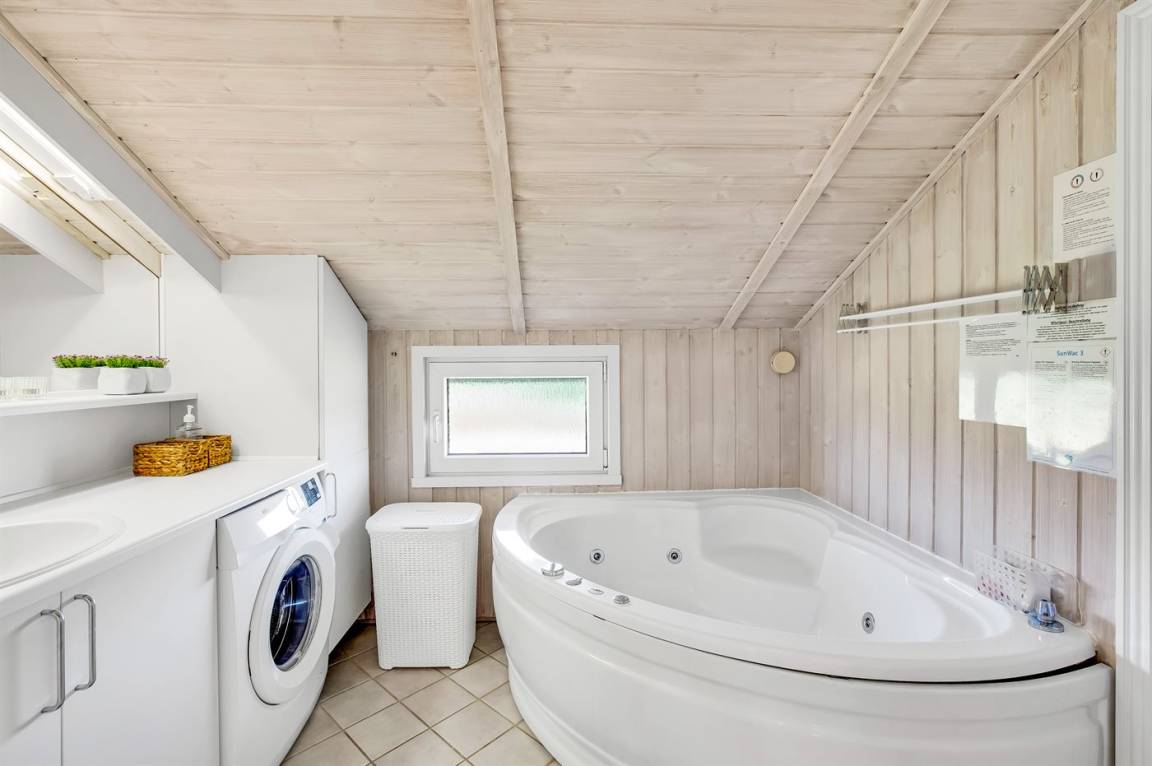 Schönes Badezimmer mit beheizbarem Fliesenboden, Duschnische, Waschmaschine, 2-Personen-Whirlpool und Zugang zur Sauna des Hauses. Die moderne und gut ausgestattete Küche verfügt u. a. über Kühlschrank, Tiefkühlgerät, Geschirrspüler, Mikrowelle, Cerankochfeld und Umluftofen.