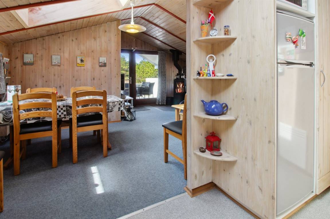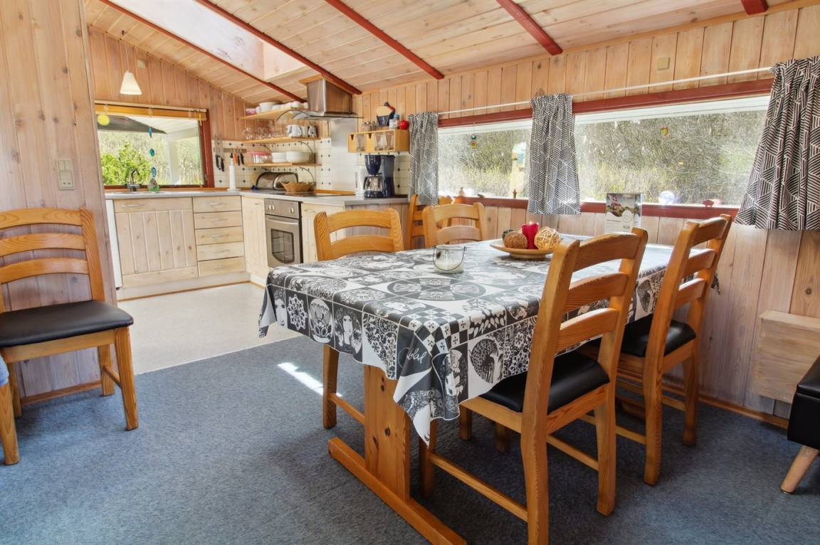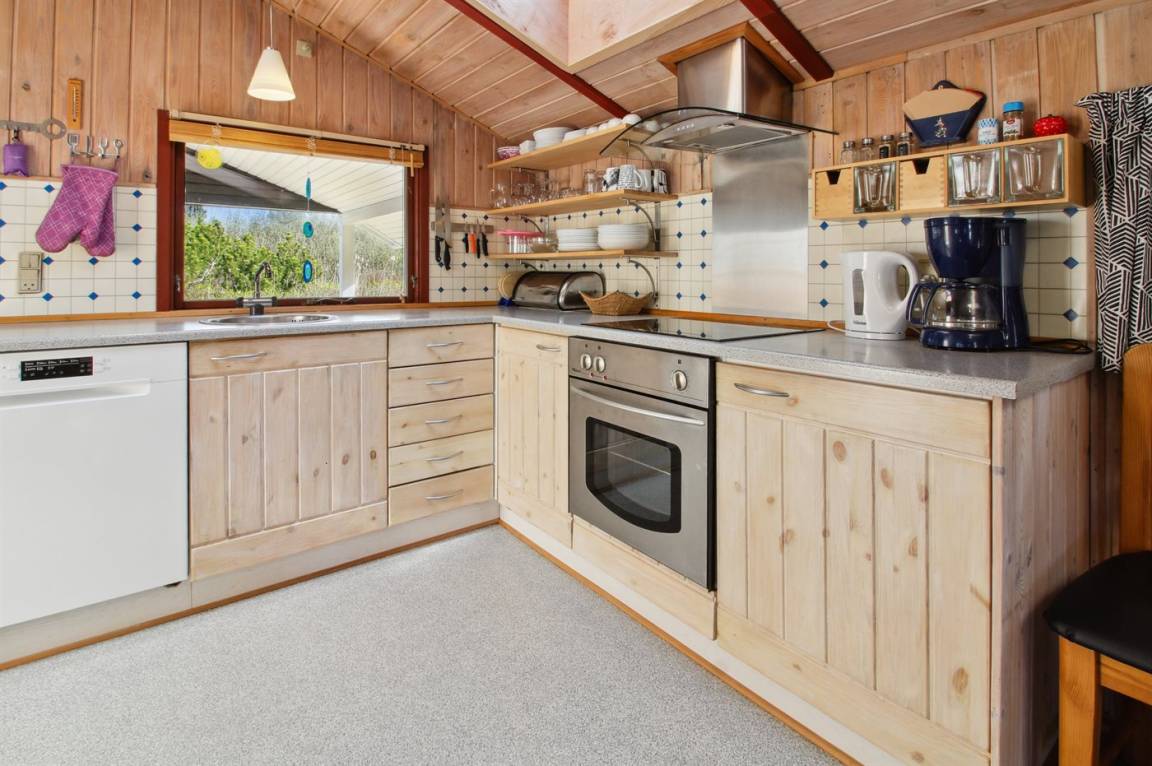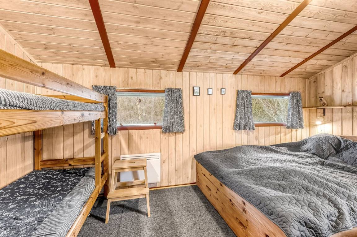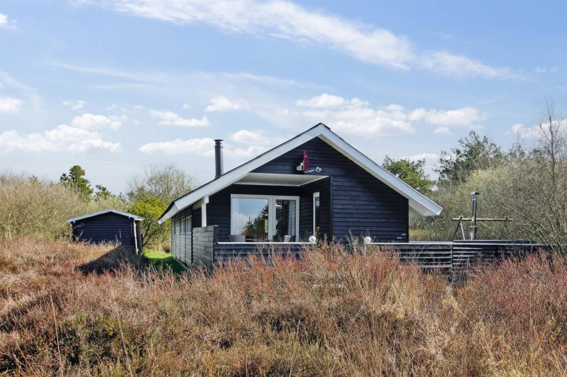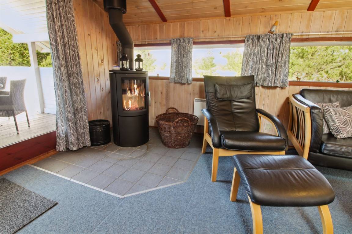 Es gibt eine offene Küche im Zusammenhang mit dem Wohnzimmer, in dem sich ein Holzofen befindet und Zugang zu einer großen nach Süden ausgerichteten Terrasse besteht. Von der Terrasse aus hat man einen Blick auf die herrliche Natur und die schönen mit Heide bewachsenen Flächen, die das Haus umgeben. Das Haus verfügt über zwei Schlafzimmer mit jeweils einem Doppelbett und zwei Einzelbetten sowie einem Etagenbett. Es gibt ein schönes Badezimmer mit Dusche und direktem Zugang zur Sauna des Hauses.