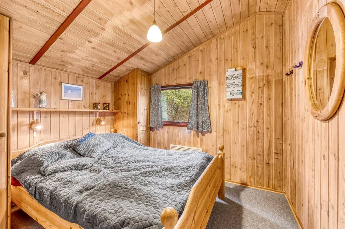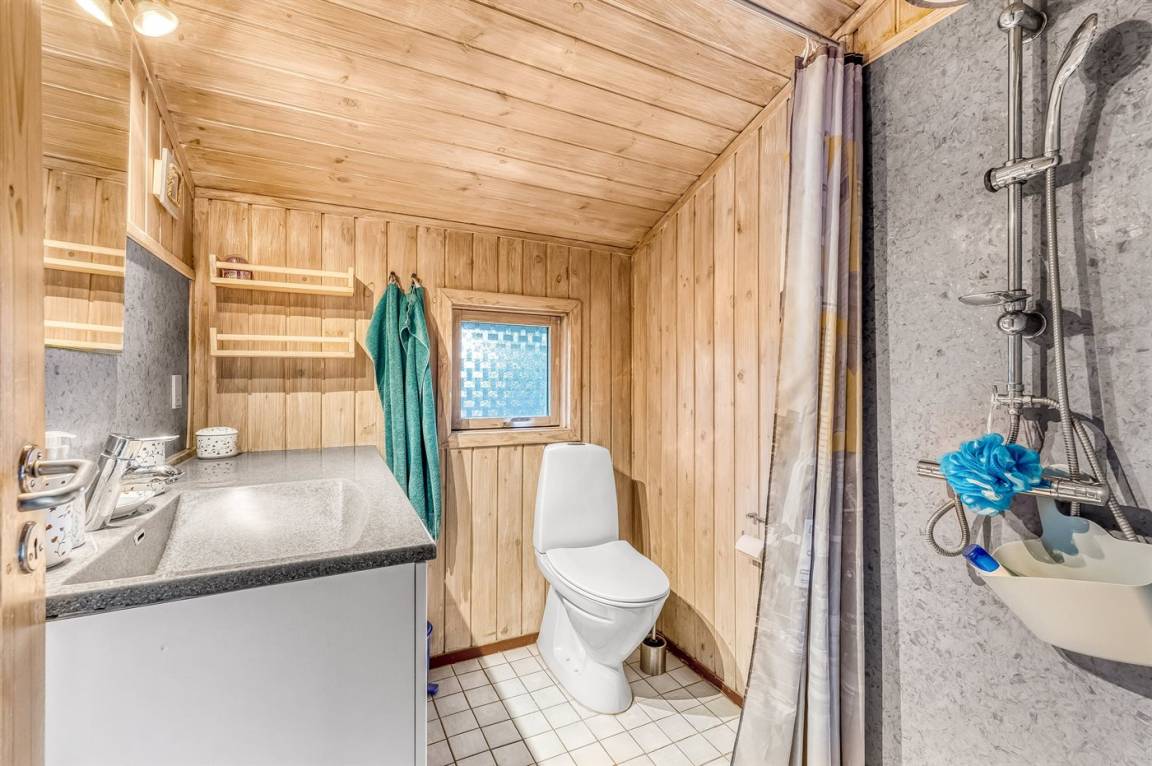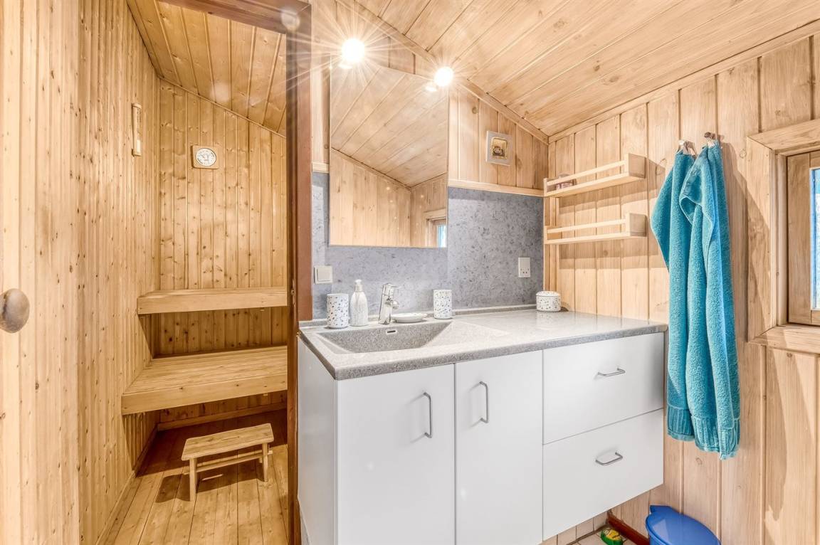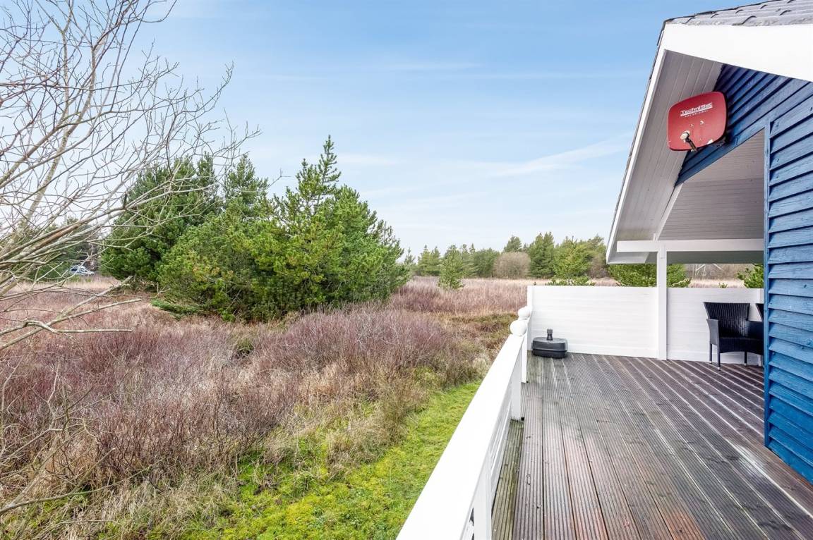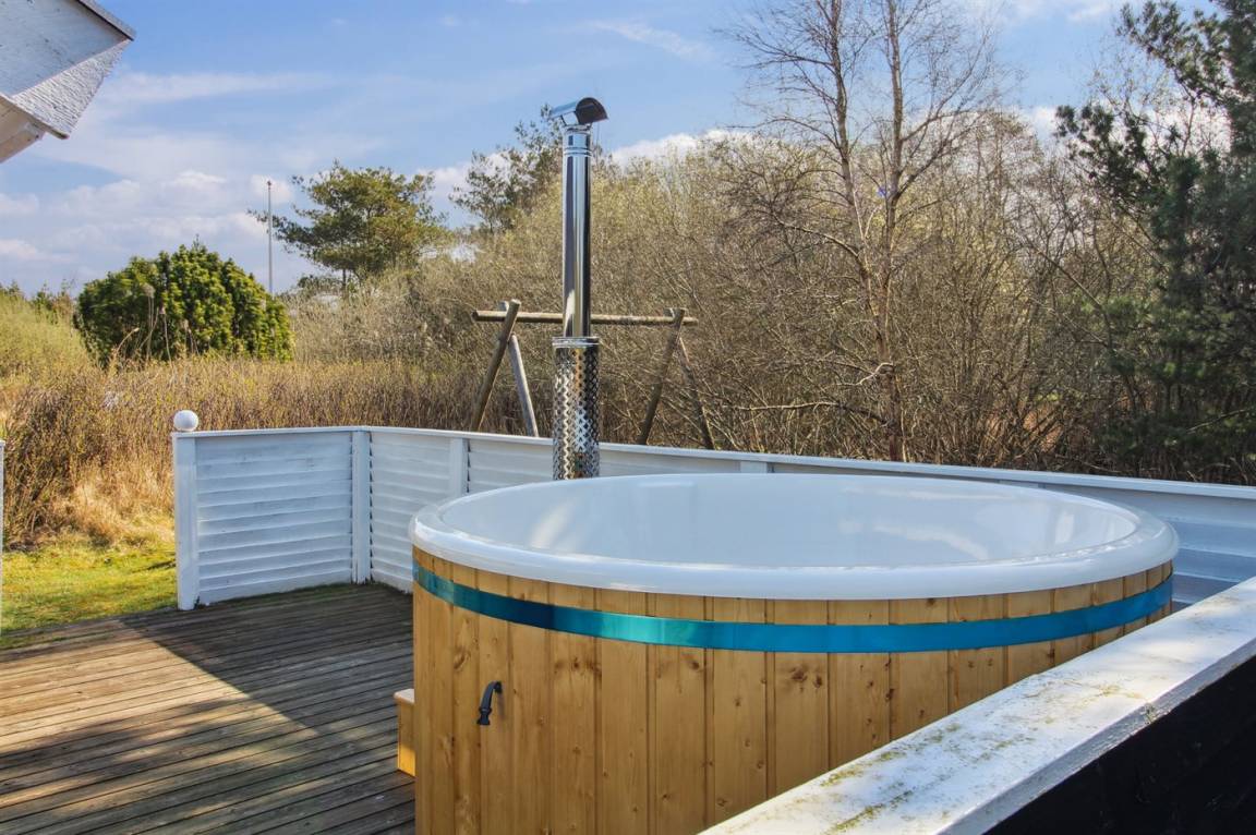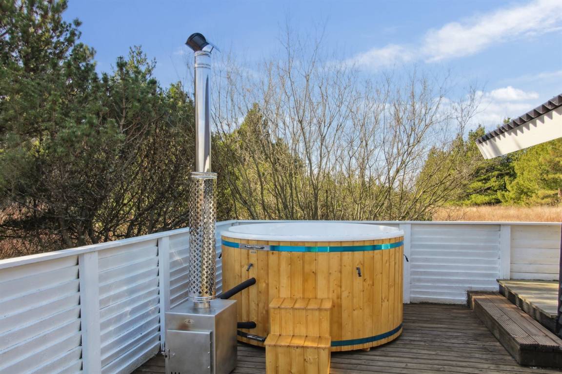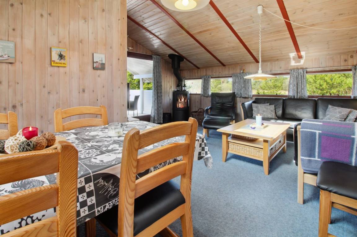 Es gibt eine offene Küche im Zusammenhang mit dem Wohnzimmer, in dem sich ein Holzofen befindet und Zugang zu einer großen nach Süden ausgerichteten Terrasse besteht. Von der Terrasse aus hat man einen Blick auf die herrliche Natur und die schönen mit Heide bewachsenen Flächen, die das Haus umgeben. Das Haus verfügt über zwei Schlafzimmer mit jeweils einem Doppelbett und zwei Einzelbetten sowie einem Etagenbett. Es gibt ein schönes Badezimmer mit Dusche und direktem Zugang zur Sauna des Hauses.