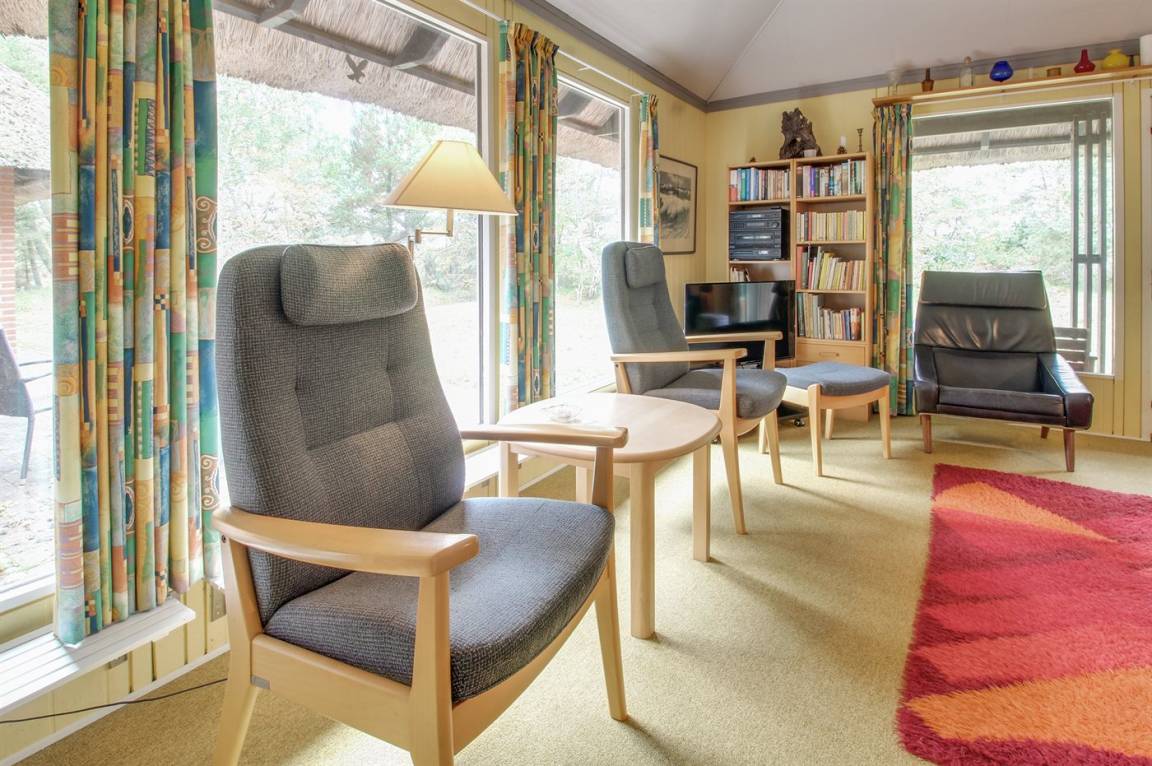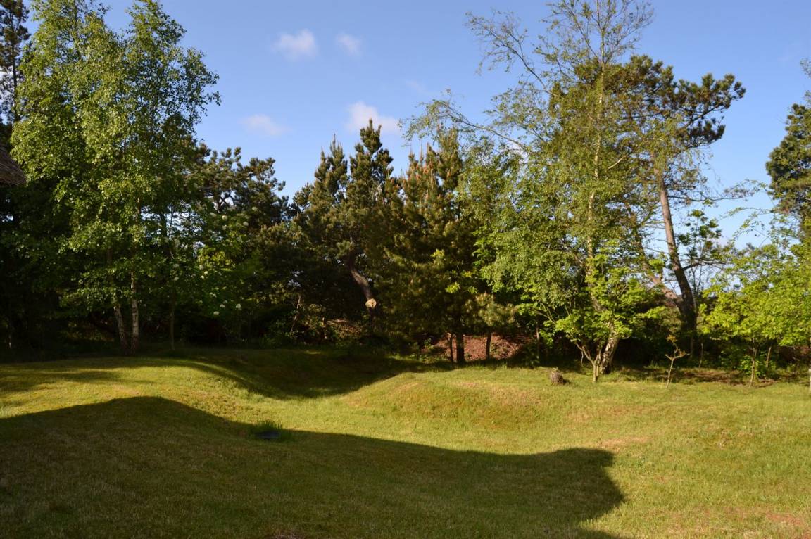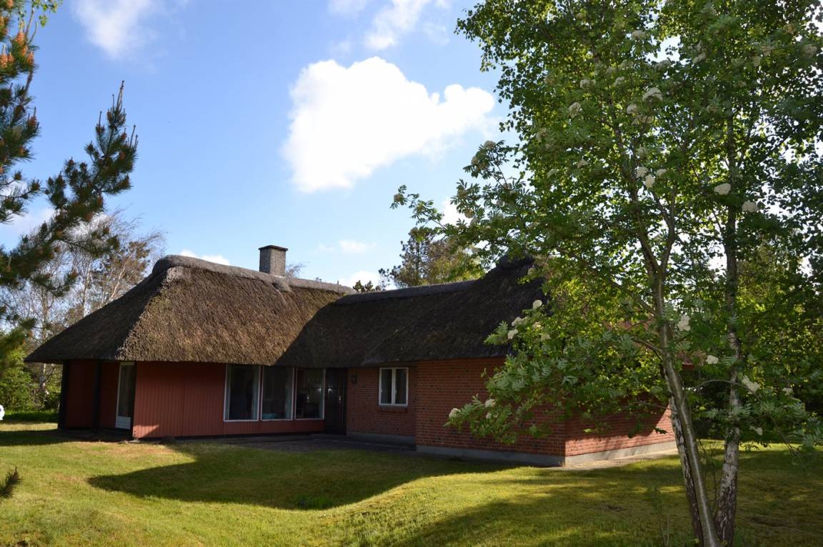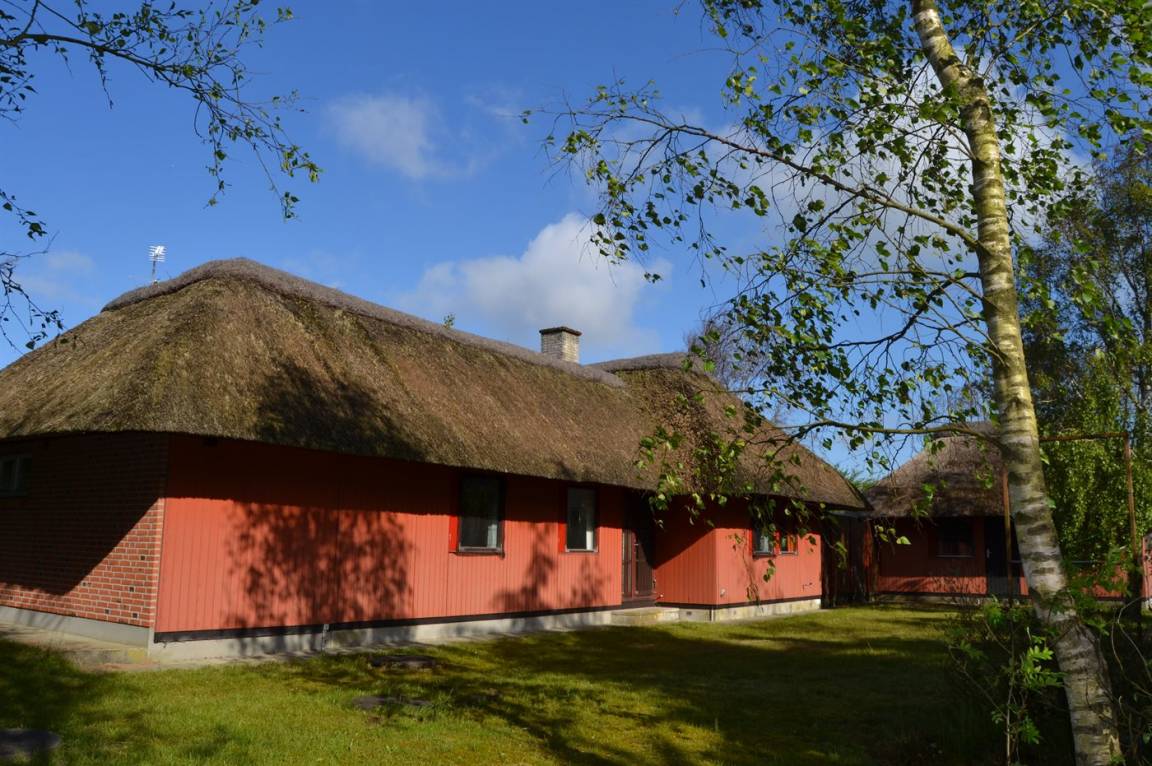 Strohgedecktes Ferienhaus auf einem ungestörten, kinderfreundlichen Naturgrundstück in idyllischer Umgebung gelegen. Zum Haus gehört eine schöne, teilweise überdachte Terrasse mit Gartenmöbeln. Innen sind die Böden zum Teil mit Teppich ausgelegt.