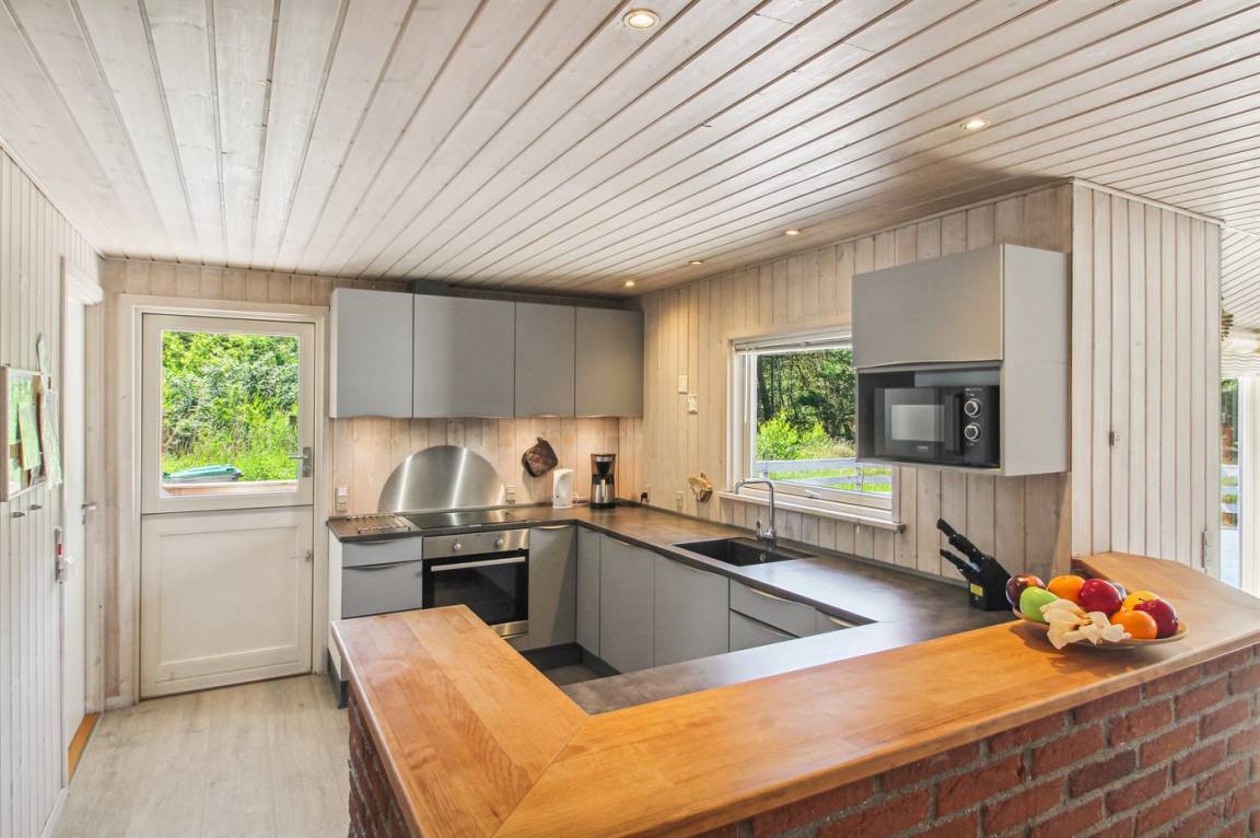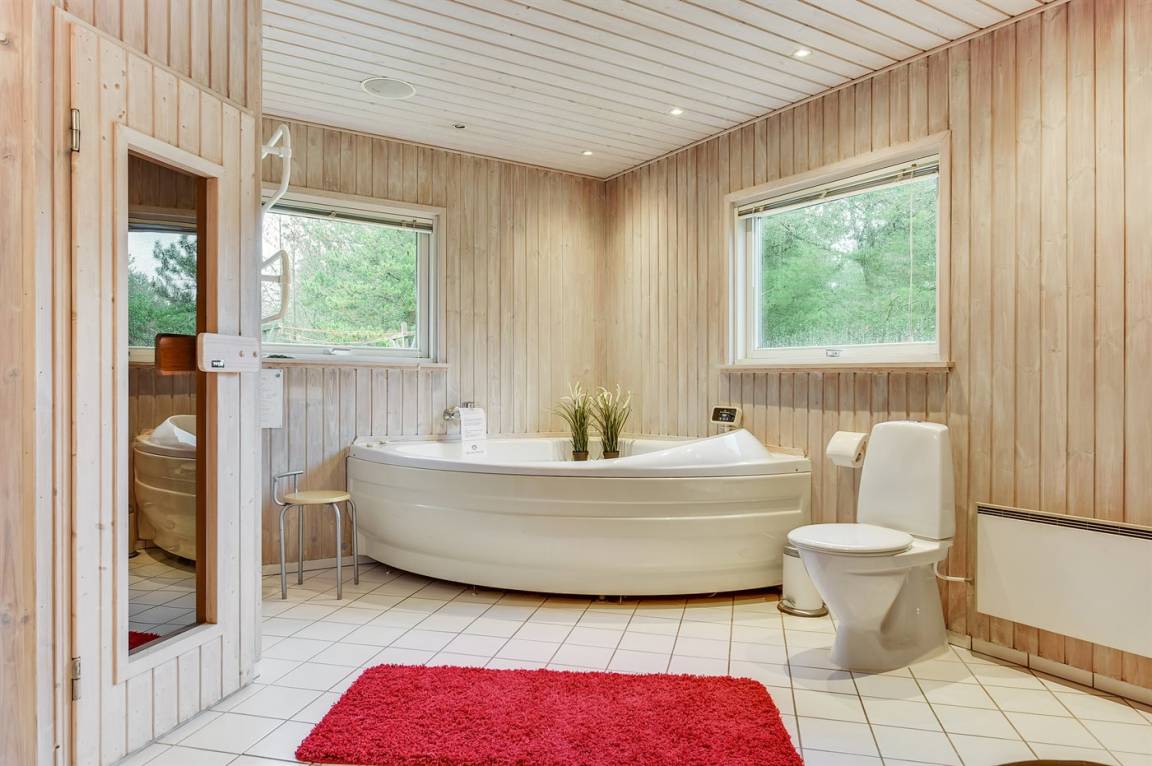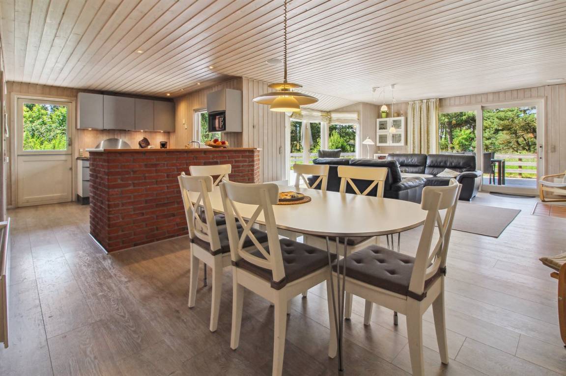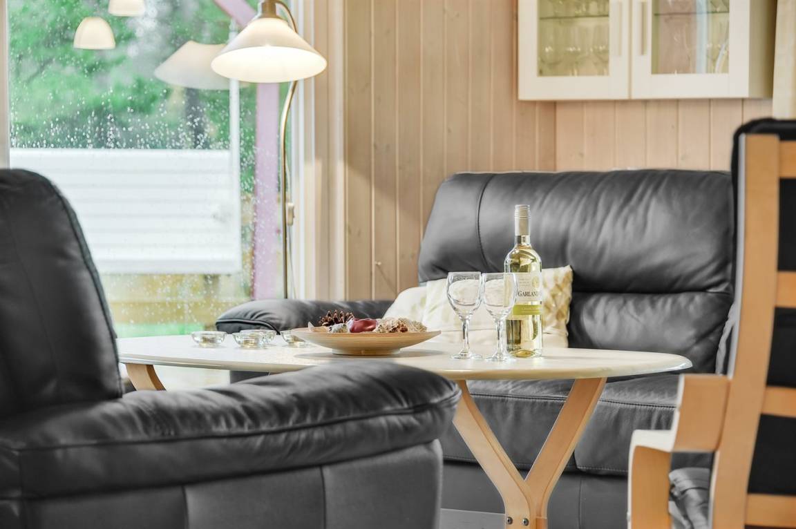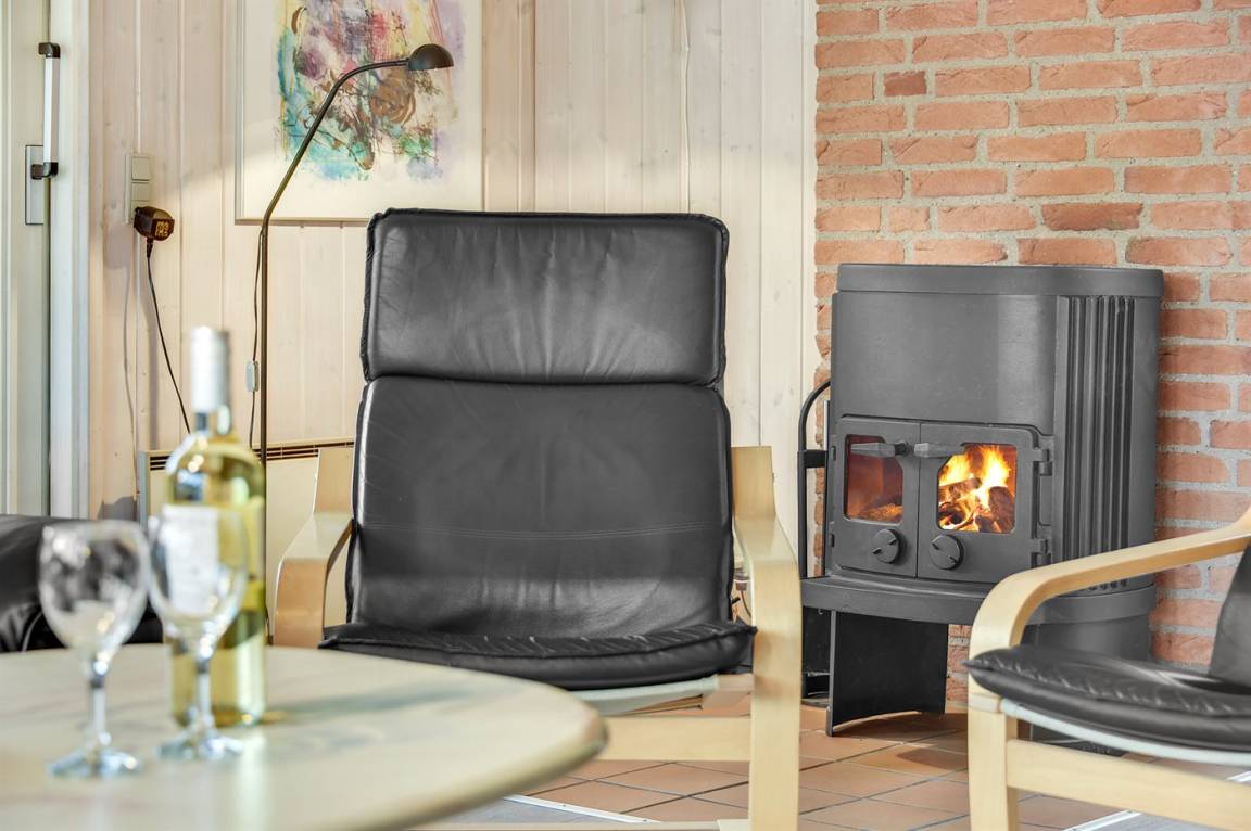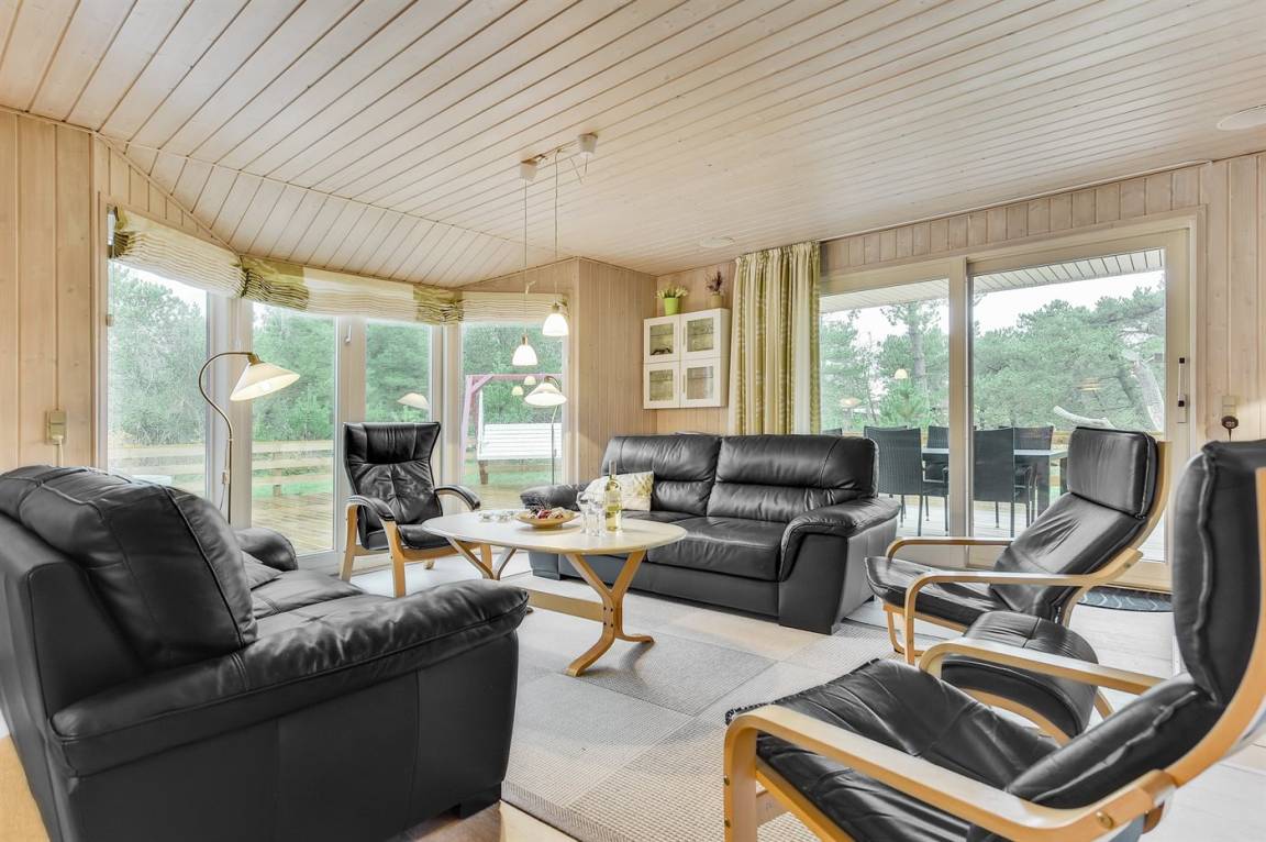 Innen sind die Wände mit hellem Holz verkleidet. Schönes Badezimmer mit Duschnische, Fußbodenheizung, 2-Pers.-Whirlpool und Sauna. Ferner ist ein zusätzliches Badezimmer mit Dusche vorhanden. Die nette Küche ist mit dem Wohnzimmer kombiniert und enthält Mikrowelle und Geschirrspüler. Im hellen Wohnzimmer mit großer Fensterfront finden Sie Kaminofen, Stereoanlage mit CD-Spieler, TV und DVD-Spieler.