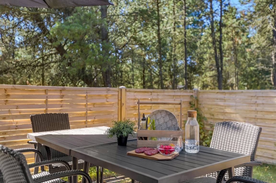 DraußenDie Ferienunterkunft liegt auf einem 2500 m² großen Naturgrundstück. Die Entfernung zum Meer beträgt 800 m. Die nächste Einkaufsmöglichkeit liegt 1800 m entfernt. In einem Abstand von 300 m gibt es einen Golfplatz. Es steht ein 20 m² Terrassenareal zur Verfügung. Kinderspielhaus. Es steht ein Grill zur Verfügung. Parkplatz auf dem Grundstück.