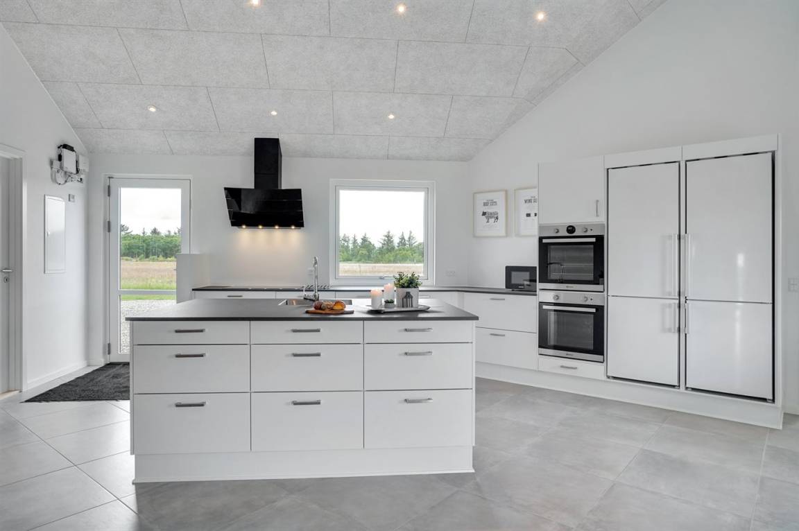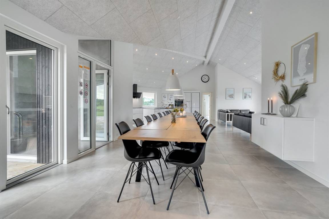 Durch die Eingangstür gelangt man in das Herzstück des Ferienhauses: die große Wohnküche mit einem großen Esstisch, an dem man Spiele spielen oder sich unterhalten kann, während an der geräumigen Kochzeile das Essen zubereitet wird. Die Küche ist mit ganzen zwei Kühlschränken ausgestattet, wovon einer eine Kombination aus Kühl- und Gefrierschrank ist. Außerdem sind ein Herd mit 4 Kochplatten, zwei Backöfen, eine Mikrowelle und eine Spülmaschine vorhanden. Für die ganz Kleinen gibt es zwei Hochstühle.