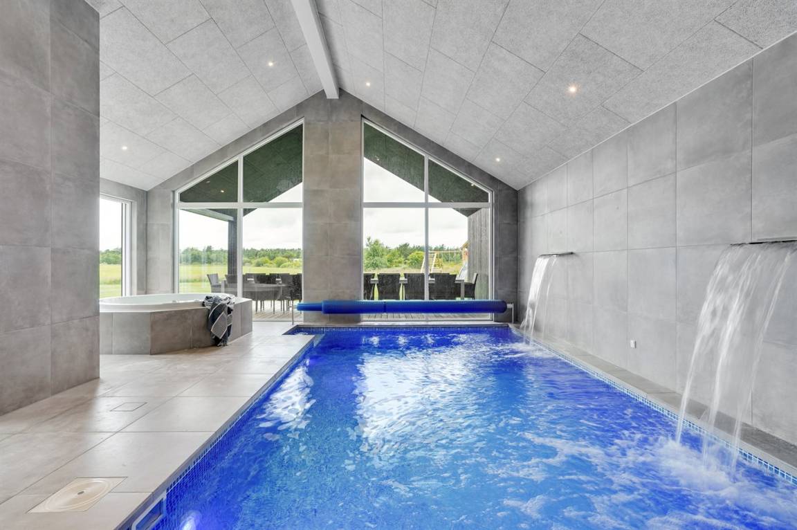 Auch der Zugang zum schönen großen Poolbereich des Hauses geht von der Wohnküche ab. Hier steht ein 18 m² großer Pool mit einer Wassertiefe von 1,35 m zur Verfügung, in dem ausgiebig geplanscht und gespielt werden kann. An einer Seite des Pools gibt es einen Bereich mit nur 40 cm Wassertiefe, in dem Kleinkinder stehen und planschen können. Eine Poolwand ist mit zwei Wasserdüsen ausgestattet, die für eine angenehme Massage und Badespaß sorgen. Das Wasser kann auf eine Temperatur von 26 bis 28 Grad eingestellt werden.