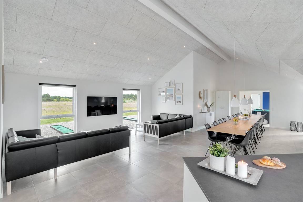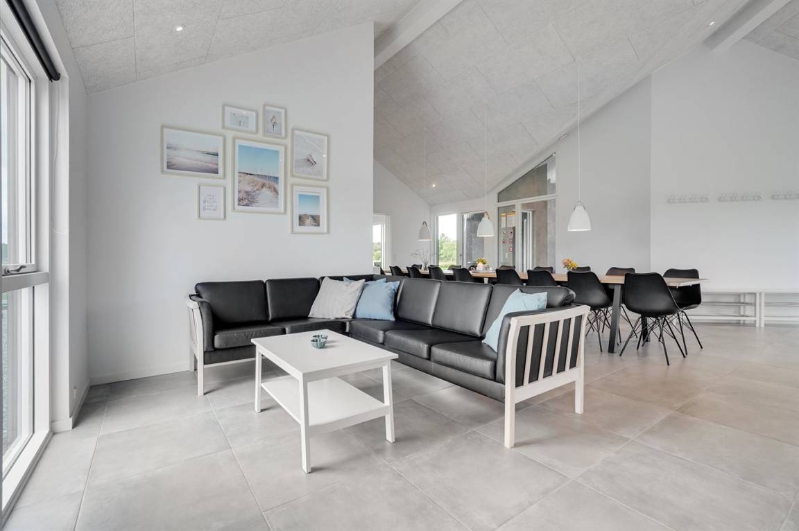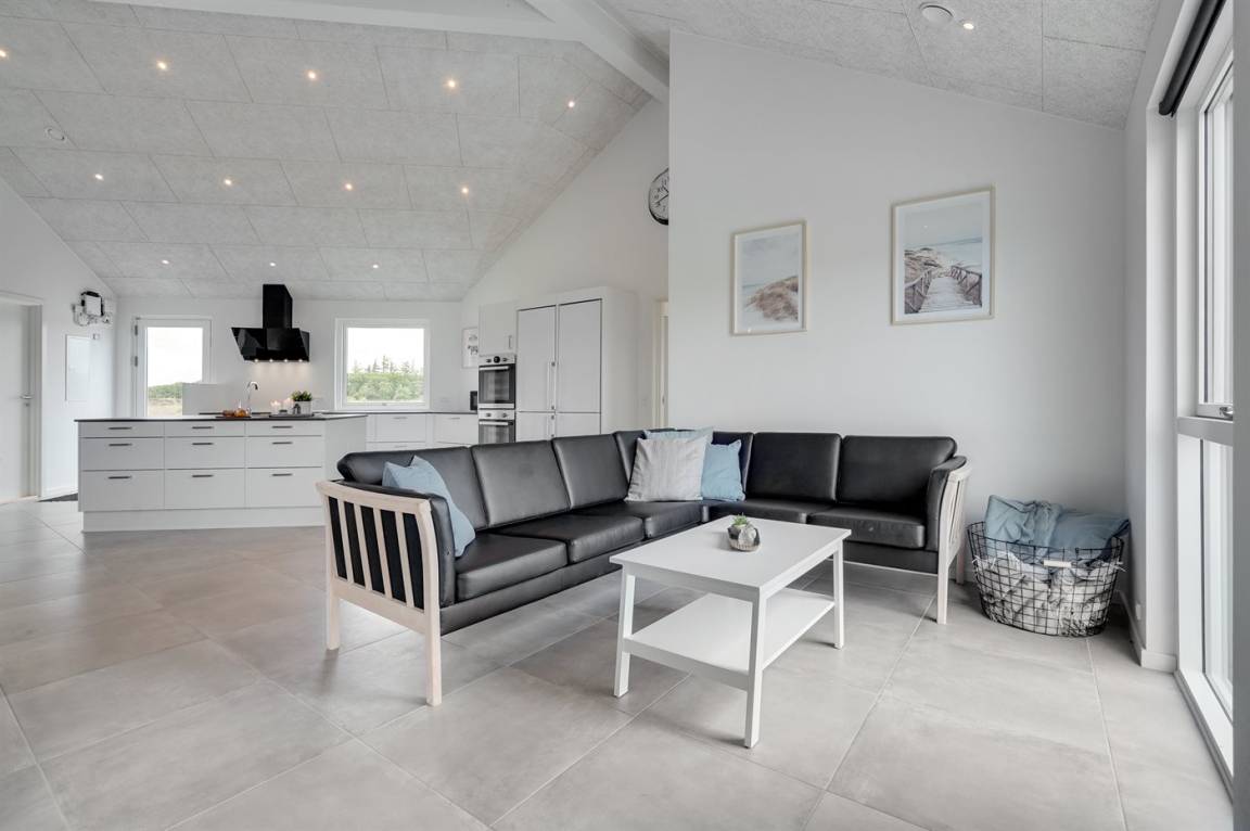 Im Anschluss an die Wohnküche liegt das Wohnzimmer des Ferienhauses mit zwei Sofagruppen und einem großen Smart TV in der Mitte. Hier ist genug Platz, um Serien zu gucken oder ein gutes Buch zu lesen. Es werden 1–3 dänische Sender und 1–3 deutsche Sender empfangen. Außerdem gibt es WLAN und die Möglichkeit zum Streamen von diversen eigenen Streamingangeboten auf dem Smart TV.