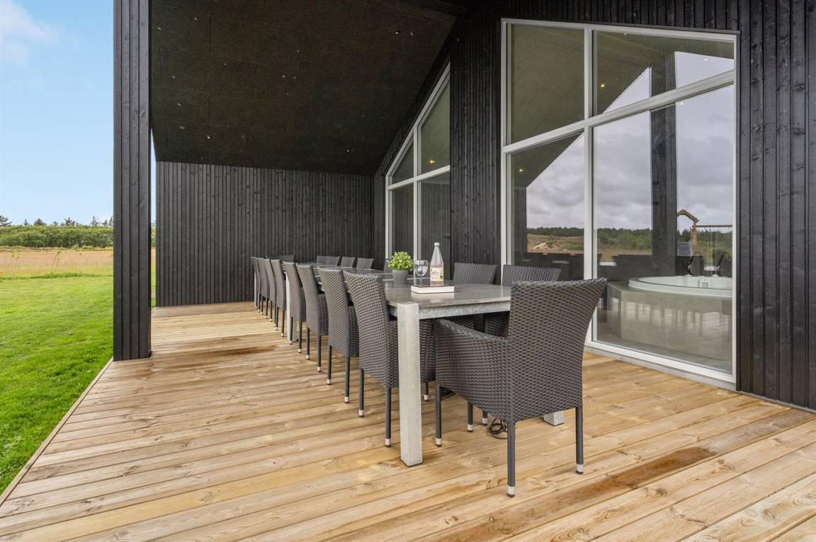 Sollte es einmal zu heiß werden oder regnen, bietet die große überdachte Terrasse mit ganzen 35 m² ausreichend Platz, um draußen zu sitzen und die Aussicht zu genießen. Die überdachte Terrasse schließt direkt an den Poolbereich an und ist mit der restlichen Terrasse verbunden. Auf den Terrassen gibt es einen großen Tisch, damit man auch draußen essen kann. Außerdem stehen Liegestühle zum Sonnenbaden zur Verfügung. Auch ein Gasgrill ist vorhanden, auf dem Würstchen und andere Leckereien zubereitet werden können.
