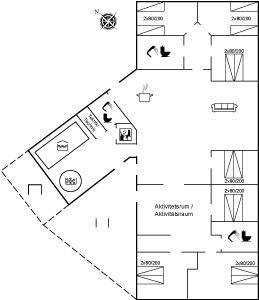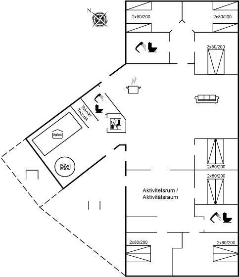 Links von der Küche befindet sich ein kleiner Flur, von dem aus alle drei Doppelzimmer und ein kleines offenes Obergeschoss für zwei Personen begehbar sind. Rechts von der Küche befindet sich der Aktivitätsraum des Hauses, der ebenfalls Zugang zu drei Doppelzimmern und einem Obergeschoss für zwei Personen bietet. In das letzte Zimmer gelangt man direkt von der Küche aus.