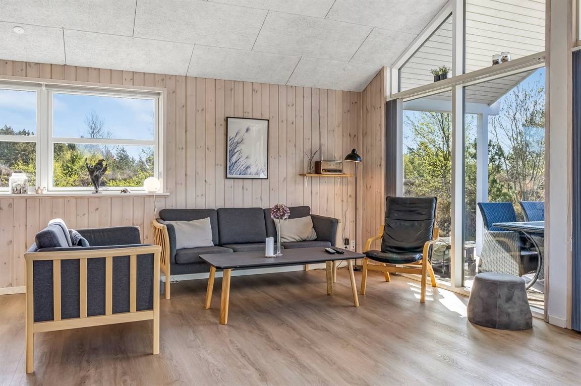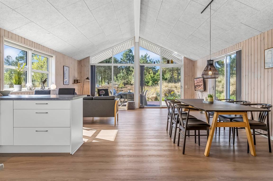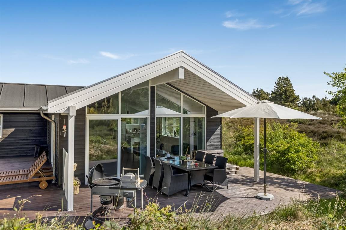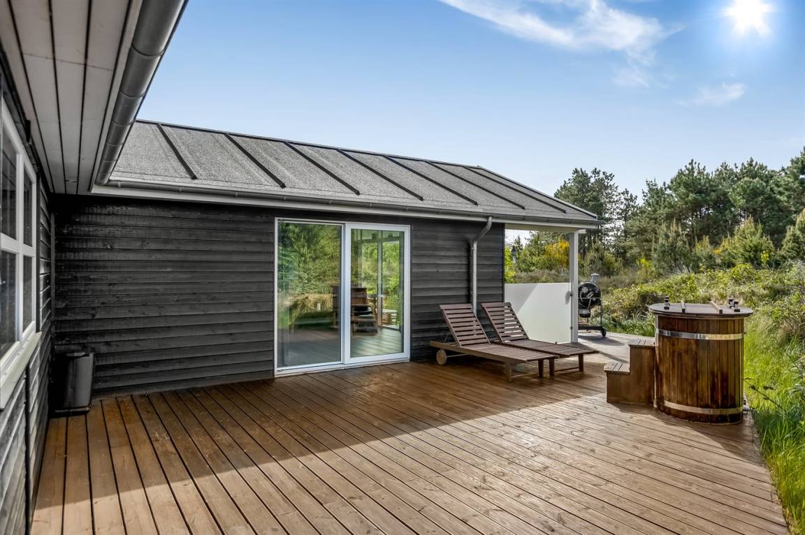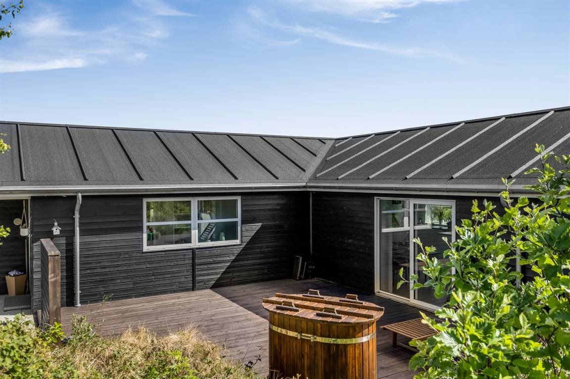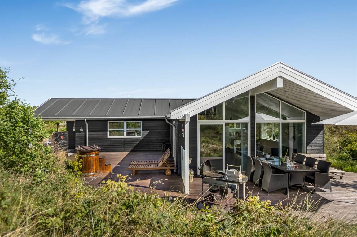 Ein helles und gut ausgestattetes Ferienhaus mit u. a. 2-Pers.-Whirlpool und gute Zimmer. Die Küche und das Wohnzimmer sind miteinander kombiniert und von hier haben Sie direkten Zugang zur großen und teilweise überdachten Terrasse auf der ein Kalt-/Warmwasserbecken steht. Im Geräteraum ist ein Dartspiel aufgehängt.