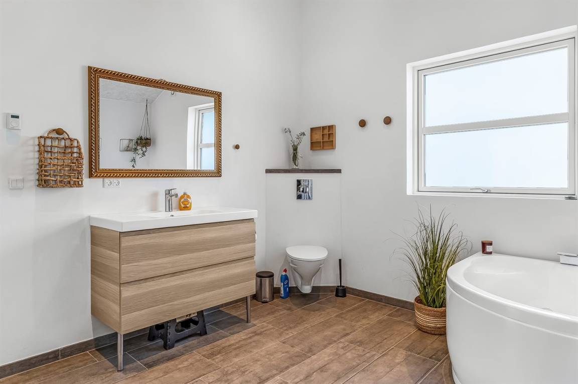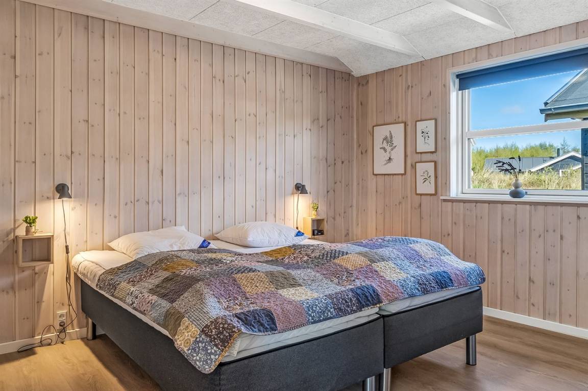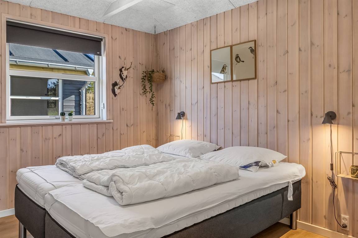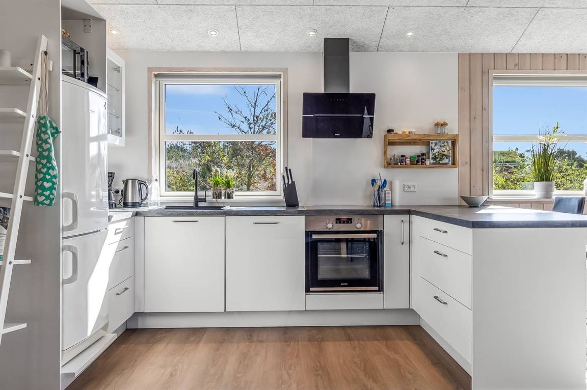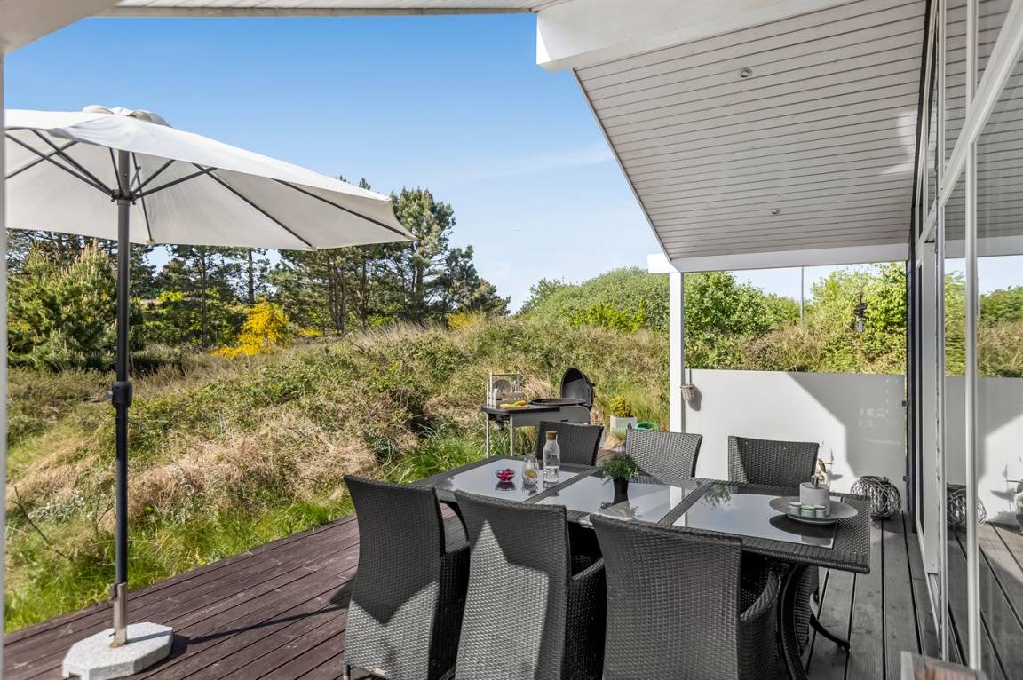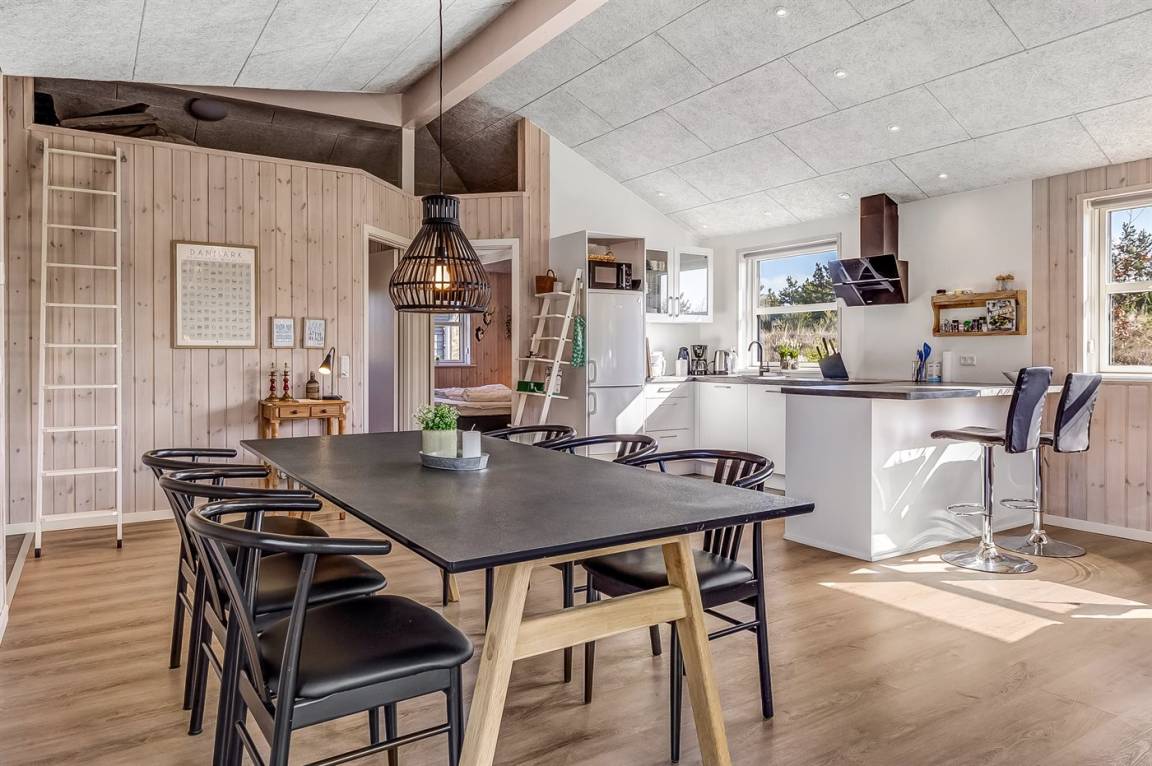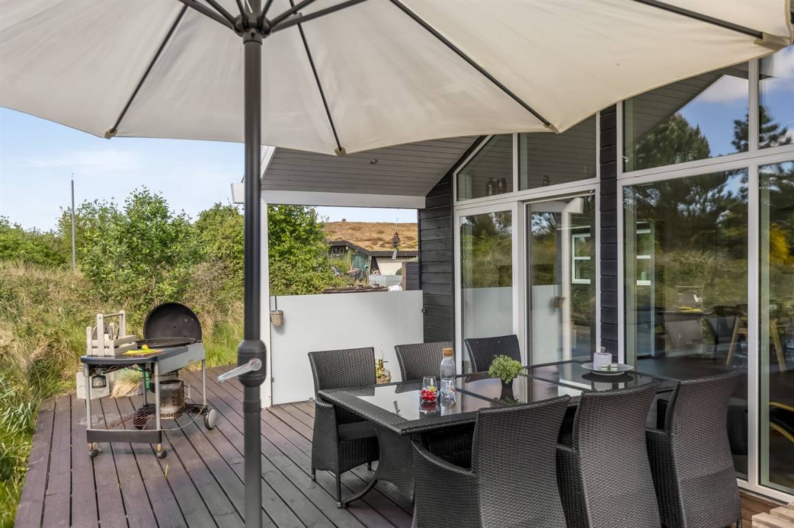 Ein helles und gut ausgestattetes Ferienhaus mit u. a. 2-Pers.-Whirlpool und gute Zimmer. Die Küche und das Wohnzimmer sind miteinander kombiniert und von hier haben Sie direkten Zugang zur großen und teilweise überdachten Terrasse auf der ein Kalt-/Warmwasserbecken steht. Im Geräteraum ist ein Dartspiel aufgehängt.